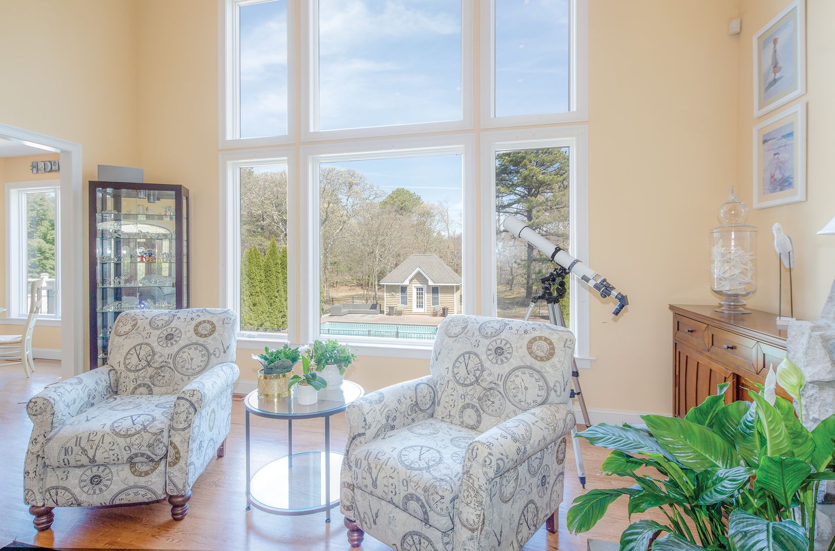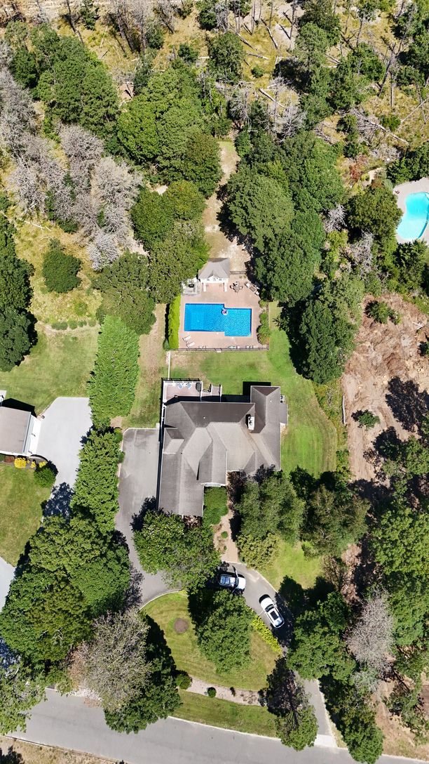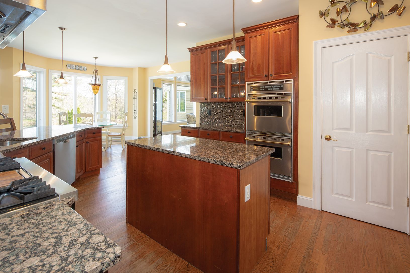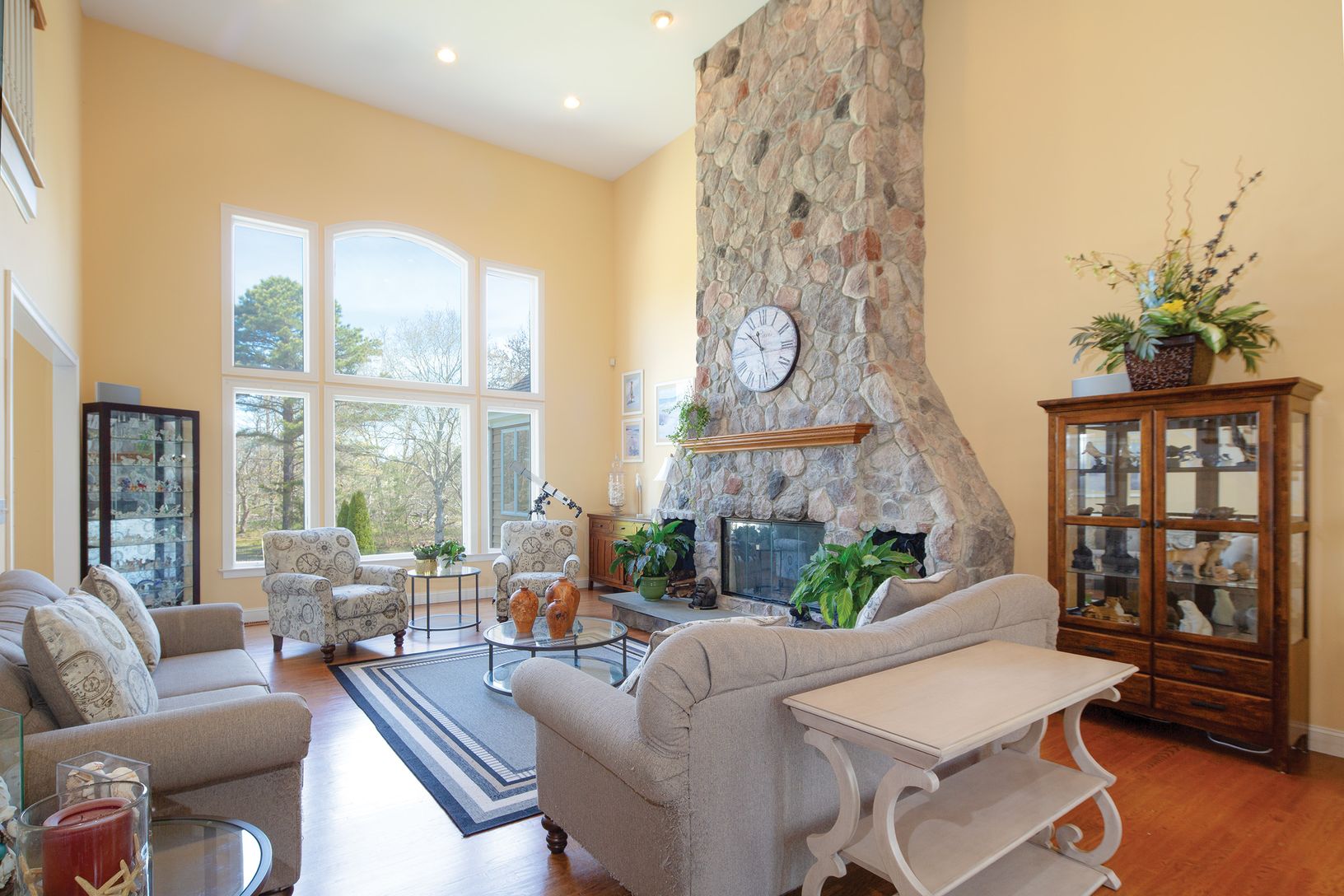 Set on an expansive 1.68 acre parcel in a peaceful Southampton setting, this five-bedroom, four-and-a-half-bathroom home offers generous proportions, timeless warmth, and resort-style amenities inside and out. A gracious entry leads to a dramatic double-height living room anchored by a soaring stone fireplace and walls of windows that fill the space with natural light. The open-concept kitchen features rich cherry wood cabinetry, granite count