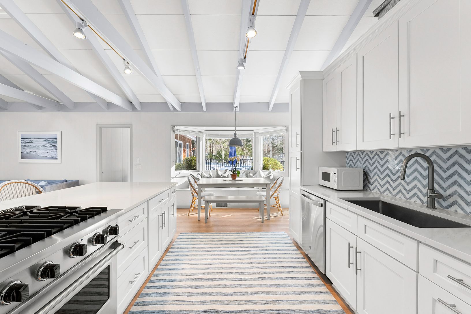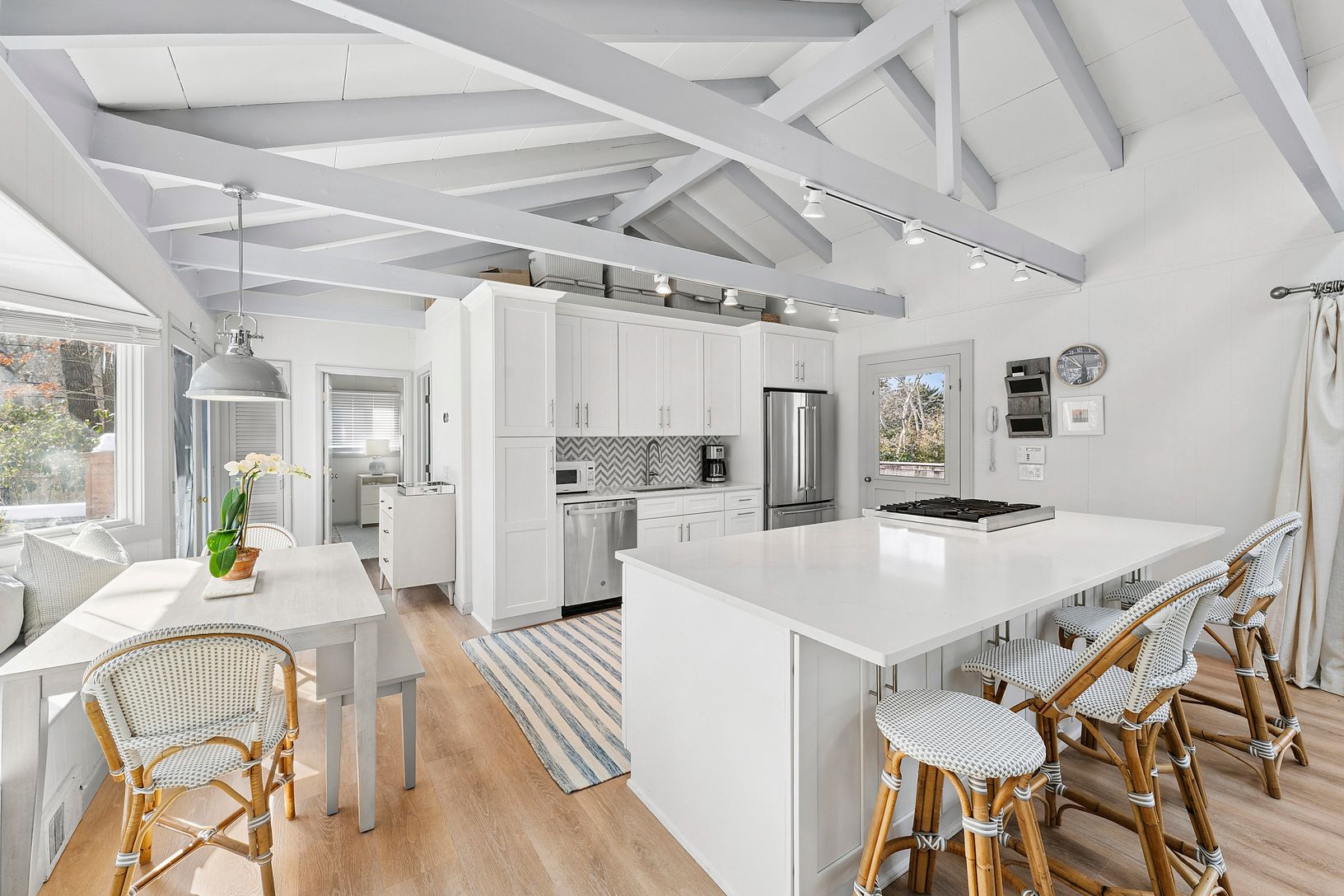 A prime location and lush flowering perimeter is the perfect setting for this completely charming 3 bedroom, 2 bath beach house. An open floor plan with vaulted beamed ceilings, skylights, and fireplace adjacent to a covered porch is a delight to enjoy in all seasons. The bright white kitchen is equipped with stainless steel appliances and lots of counter space. A dining banquette with picture window looks out to the magnificent pool, patio an