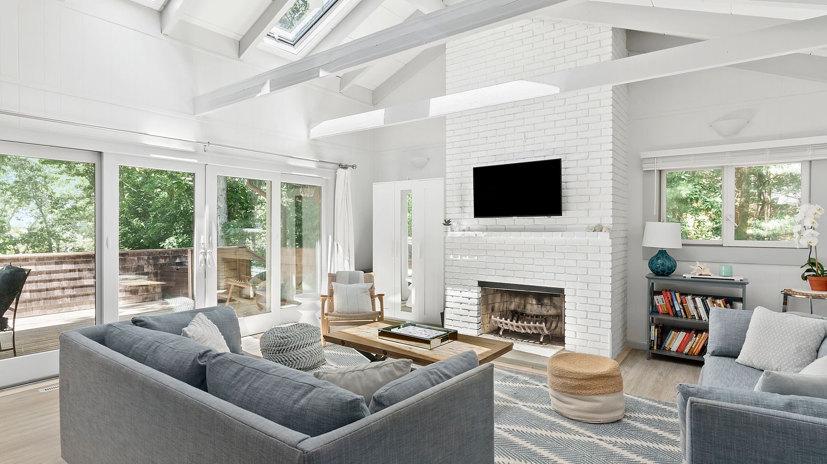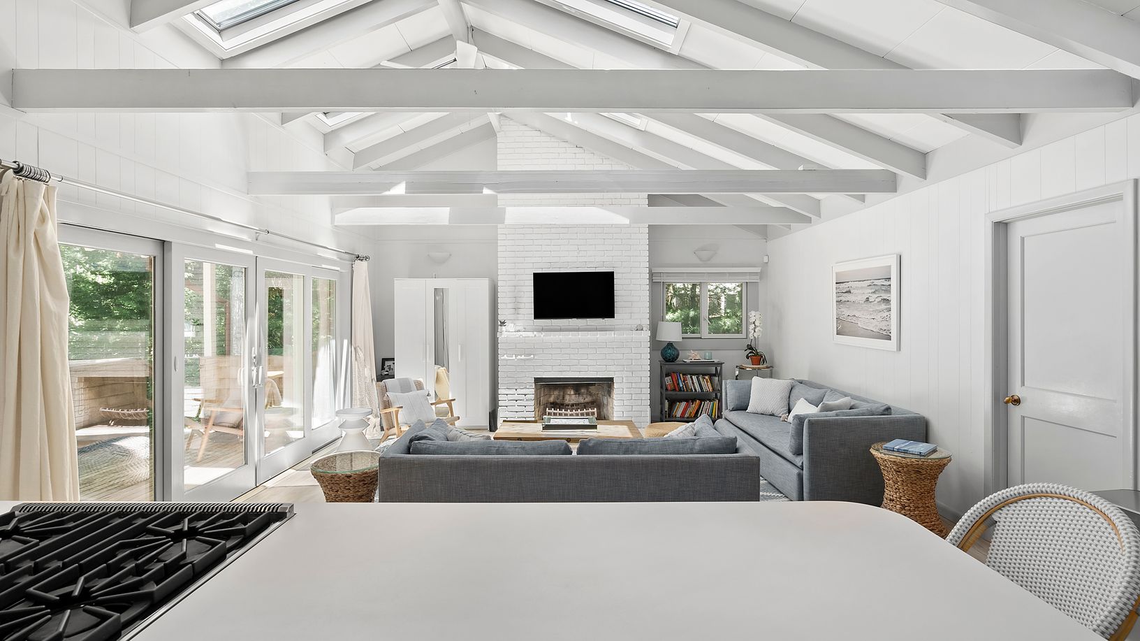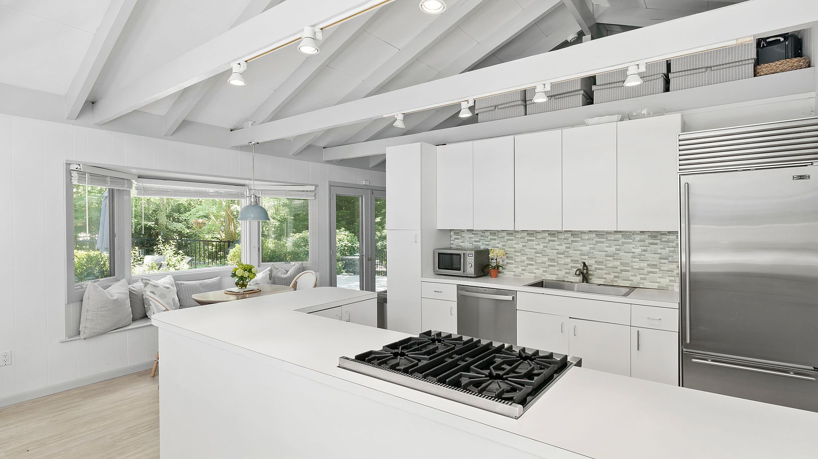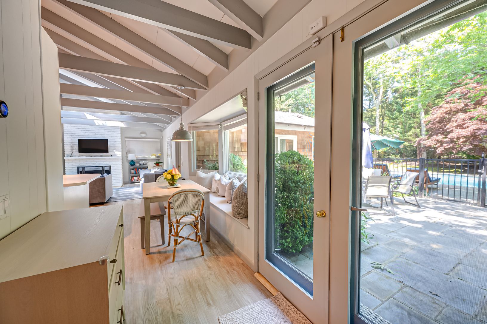 A prime location and lush flowering perimeter is the perfect setting for this completely charming 3 bedroom, 2 bath beach house. An open floor plan with vaulted beamed ceilings, skylights, and fireplace adjacent to a covered porch is a delight to enjoy in all seasons. The bright white kitchen is equipped with stainless steel appliances and lots of counter space. A dining banquette with picture window looks out to the magnificent pool, patio an