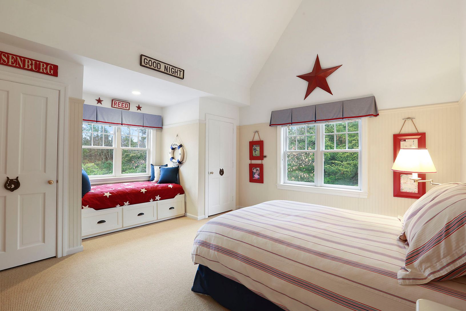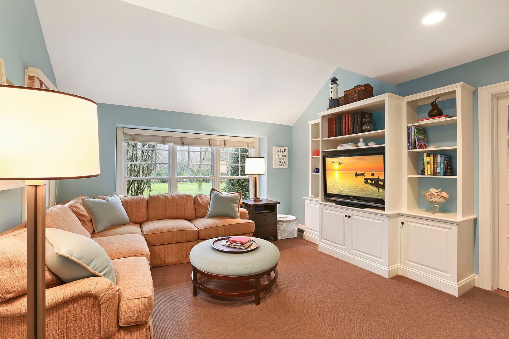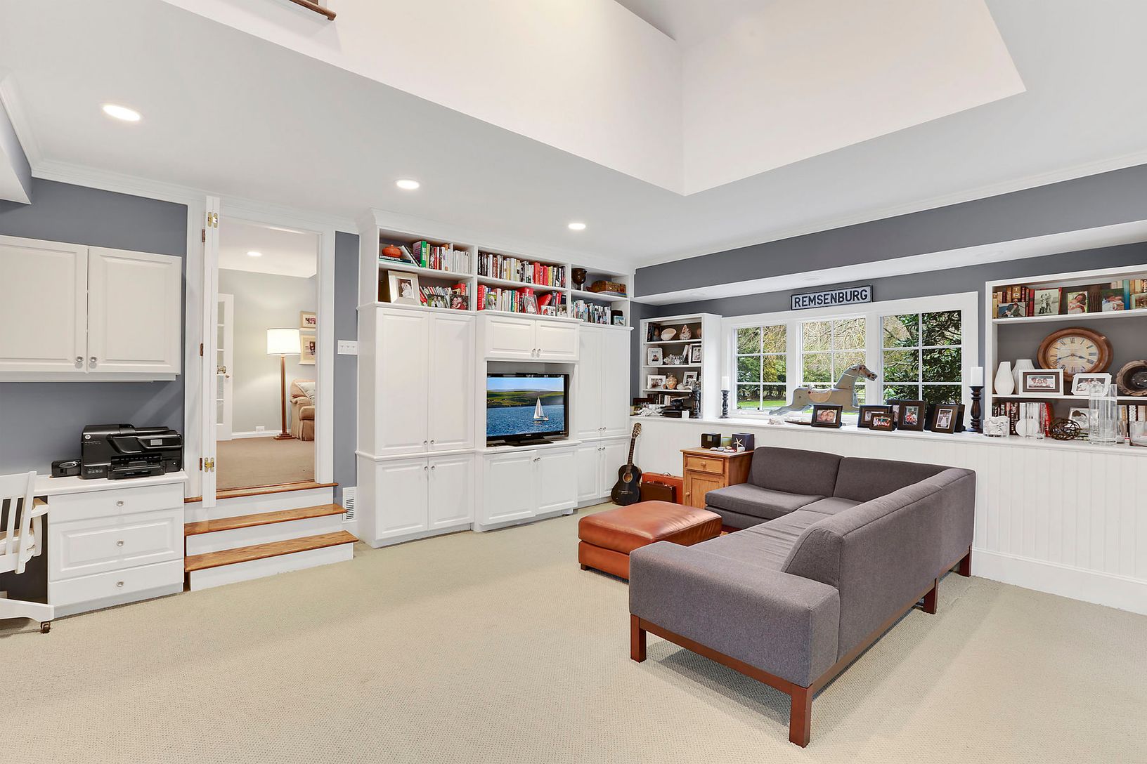 Nestled on a private 1.6 acres in the bucolic hamlet of Remsenburg in the Hamptons is this pristinely maintained and updated Post Modern with 4 bedroom and 4 ½ baths. The first floor includes a spacious master suite, charming kitchen, dining room, den, and a living room with vaulted ceiling and fireplace. There's also a huge family room/kids space with built-in desks and loft spaces and a finished basement. The second floor features 3 large be