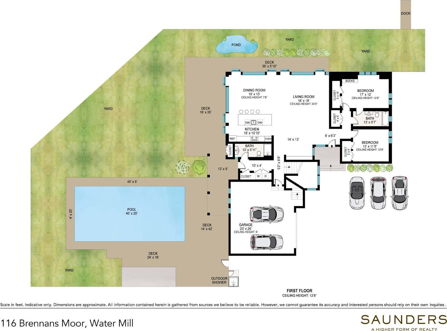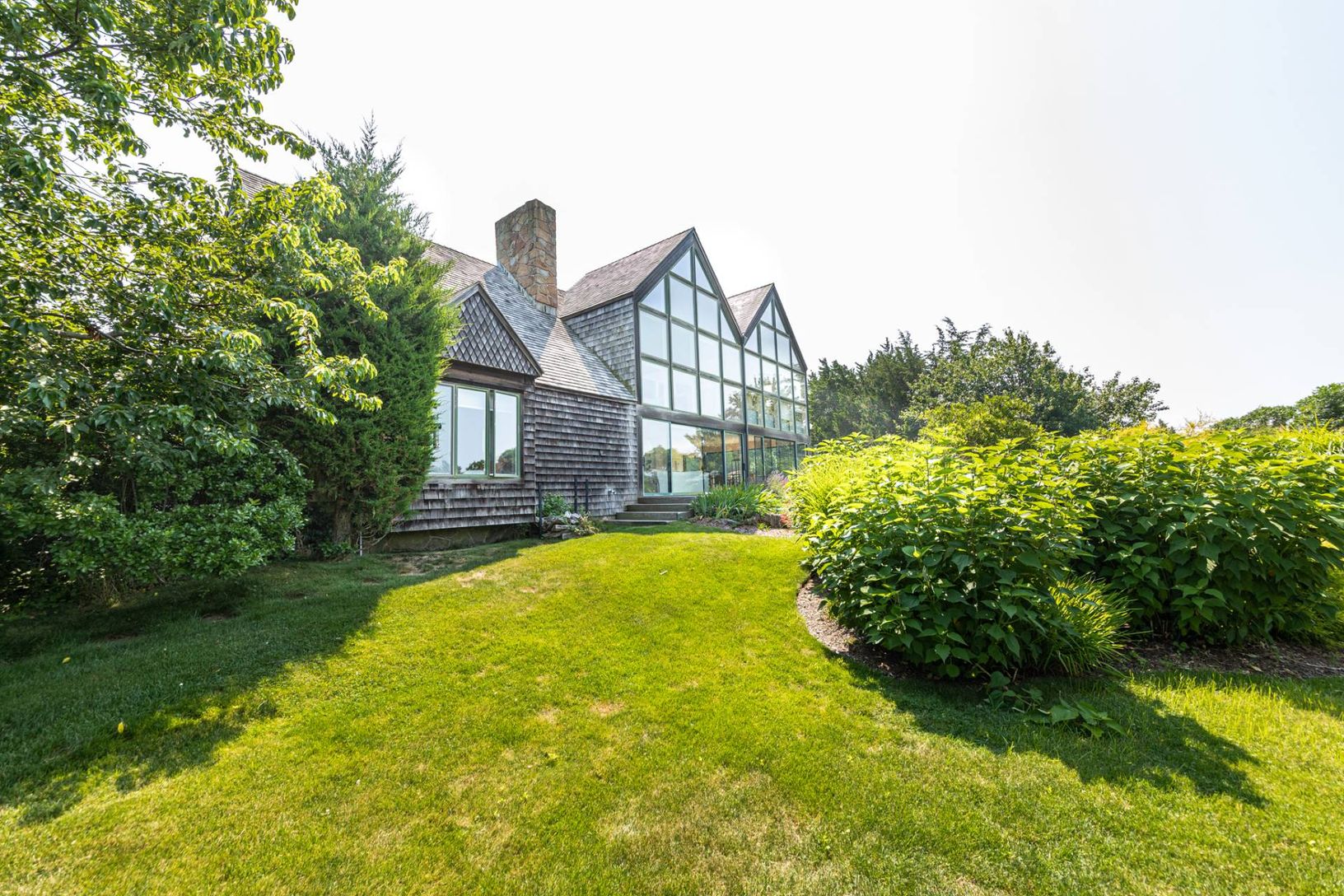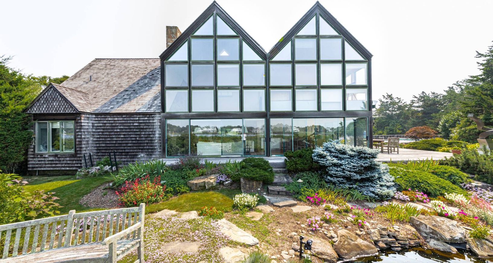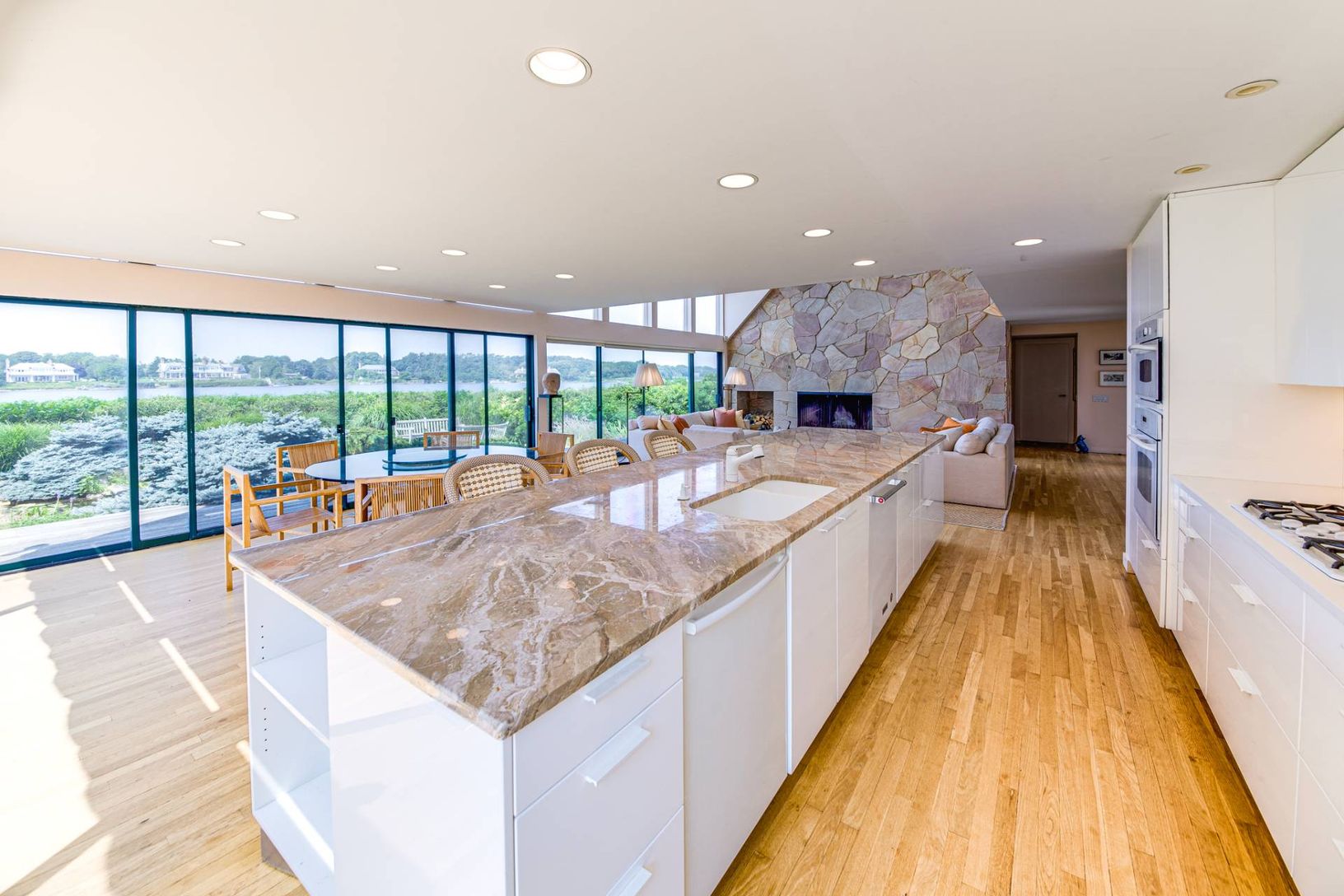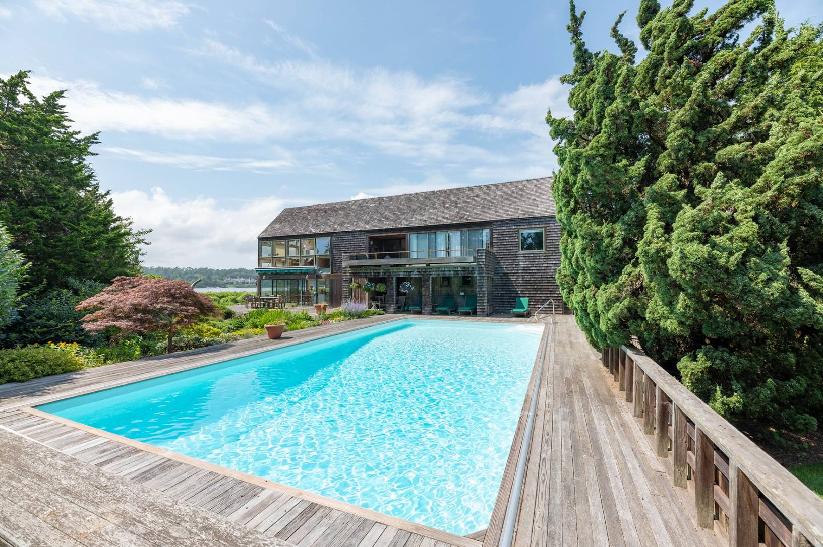 Enjoy spectacular sunsets and panoramic water views across Mecox Bay from this 1.2+/- acre bayfront property with dock and waterside pool. Never listed for sale, this rare opportunity will not last. Enter the front door and your gaze is drawn through the house, the walls of glass and out to the water beyond. It feels like you are floating on a private oasis, creating a very unique, intimate water experience. This beautiful contemporary home fe