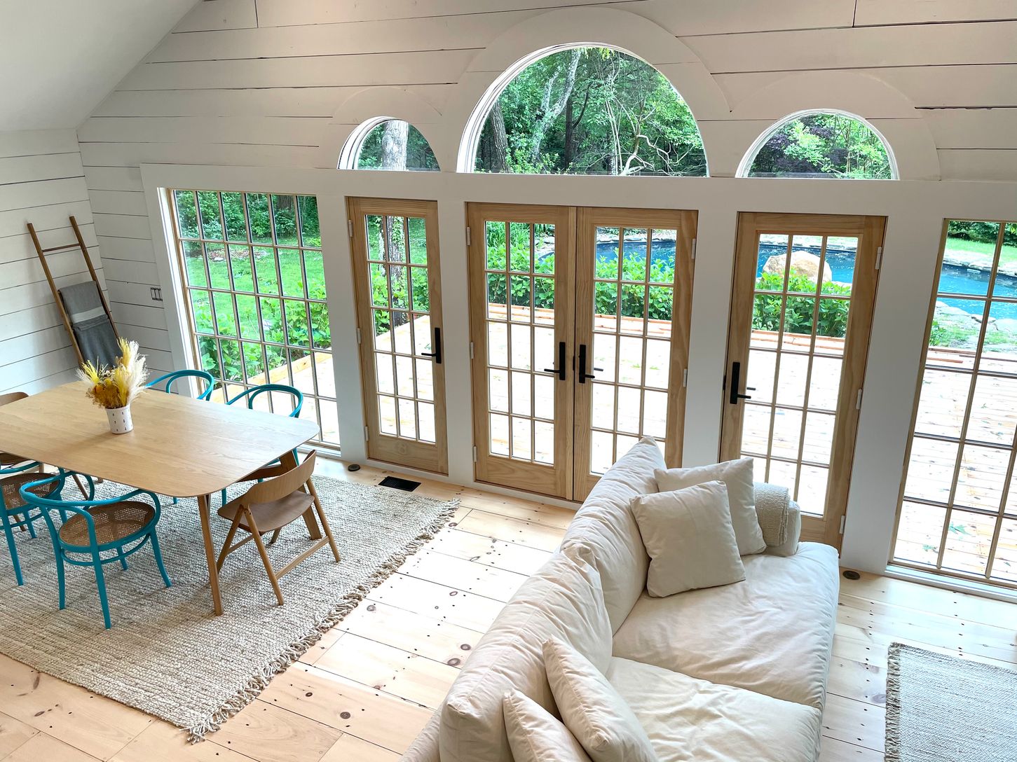 Enjoy a sojourn in East Hampton in this chic farmhouse newly renovated in 2021, with 4 bedrooms and 2 baths. The location is unbeatable - just seconds to the bay beach on Three Mile Harbor and with perimeter trees affording privacy. Open living areas are flooded with light - sunlight just streams into the double height living room, dining and eat-in kitchen with peninsula seating and appliances by Bertazzoni and Liebherr. Original wide plank w