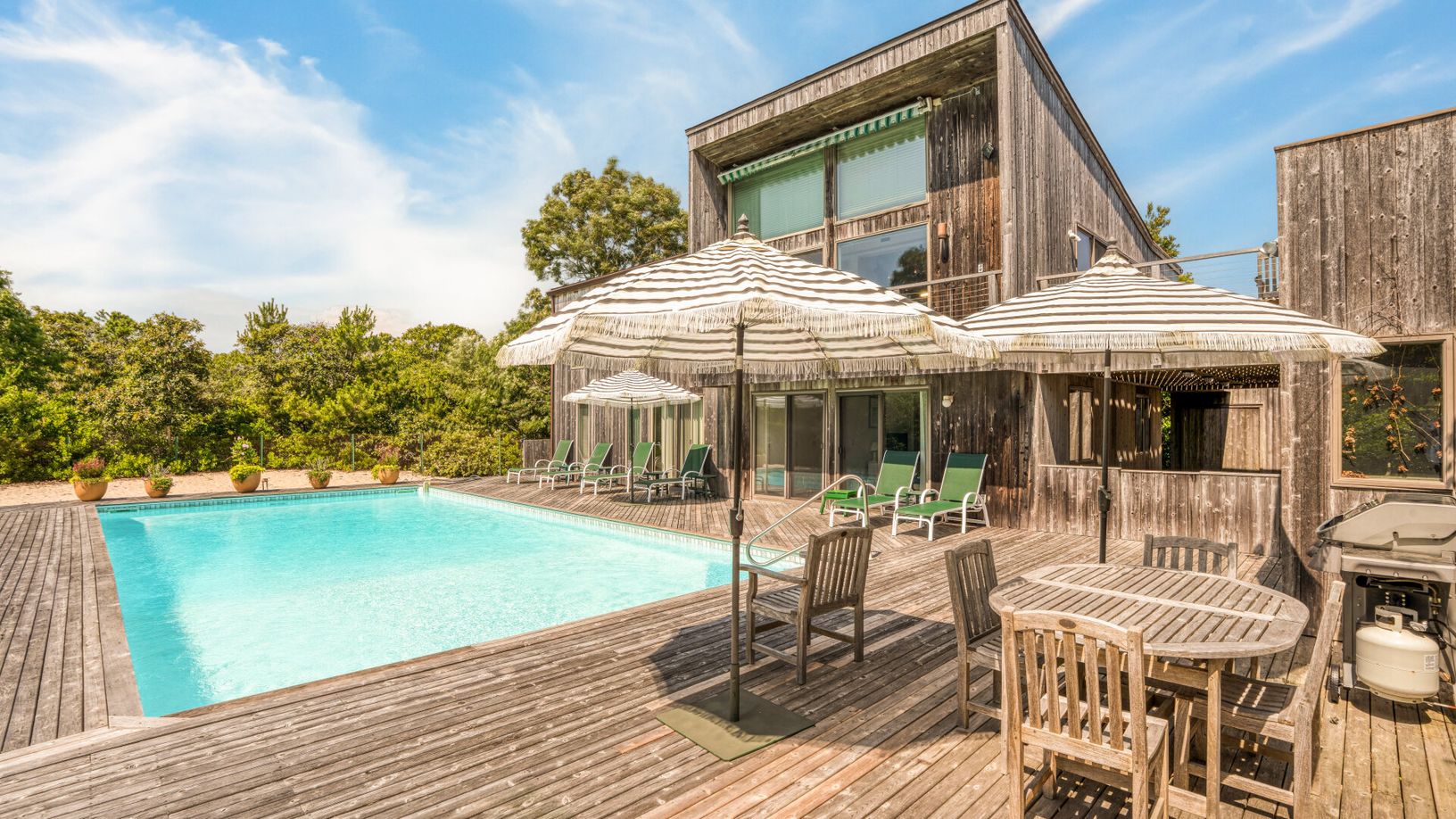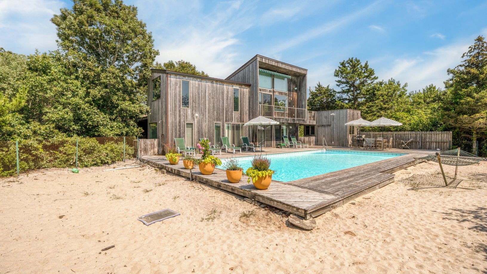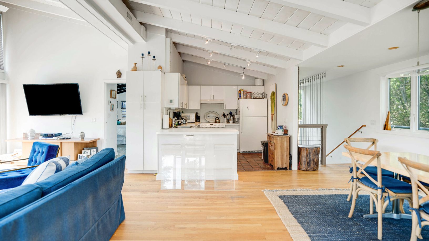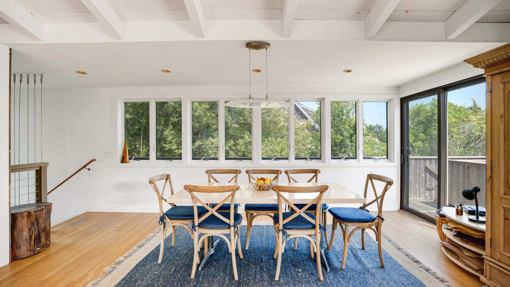Talk about beach home perfection! This incredible Amagansett home encompasses the essence of Hamptons beachside living. Step foot through the front door and be welcomed by a sunlit living space with wooden raftered ceilings and oversized beachy couches. The open-plan of the ground floor will lead you seamlessly f
