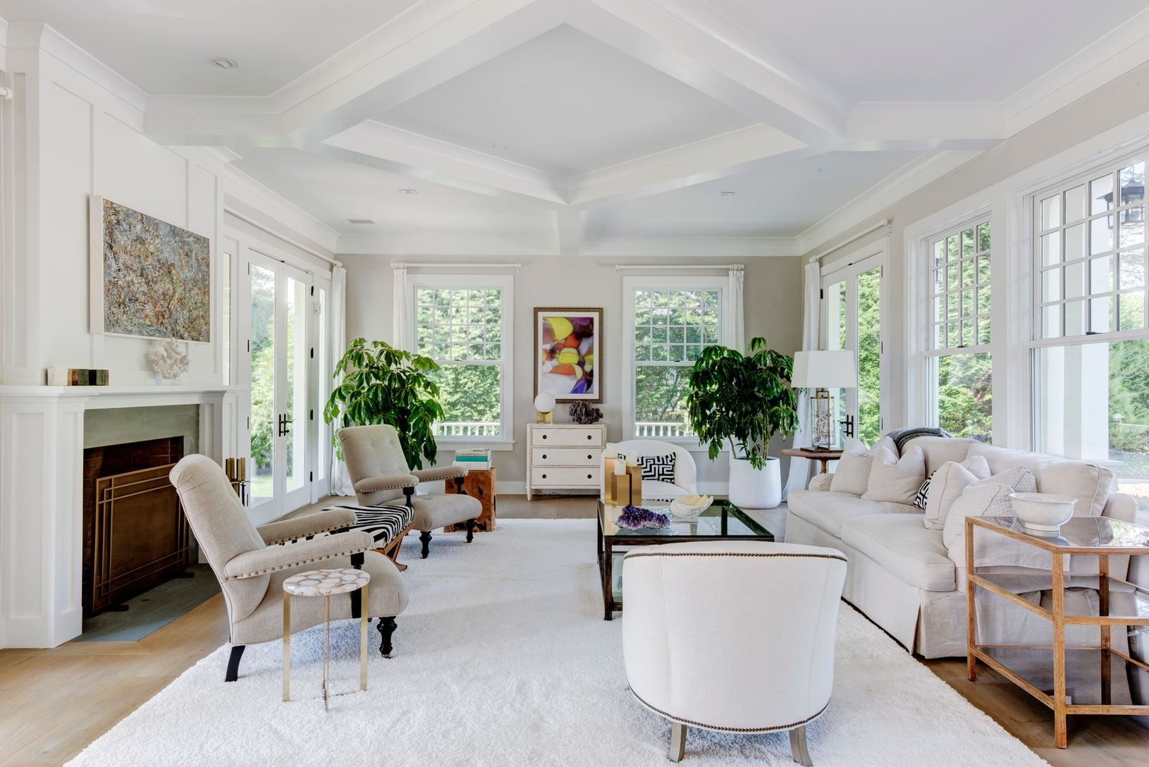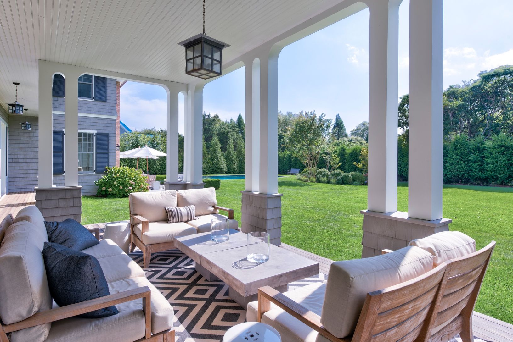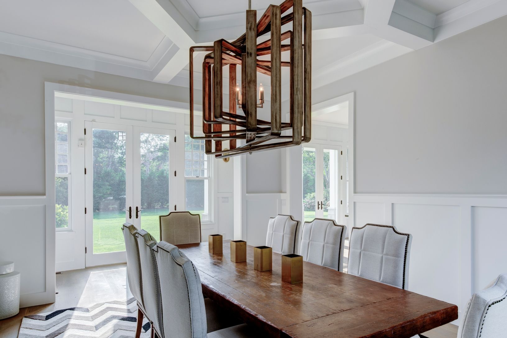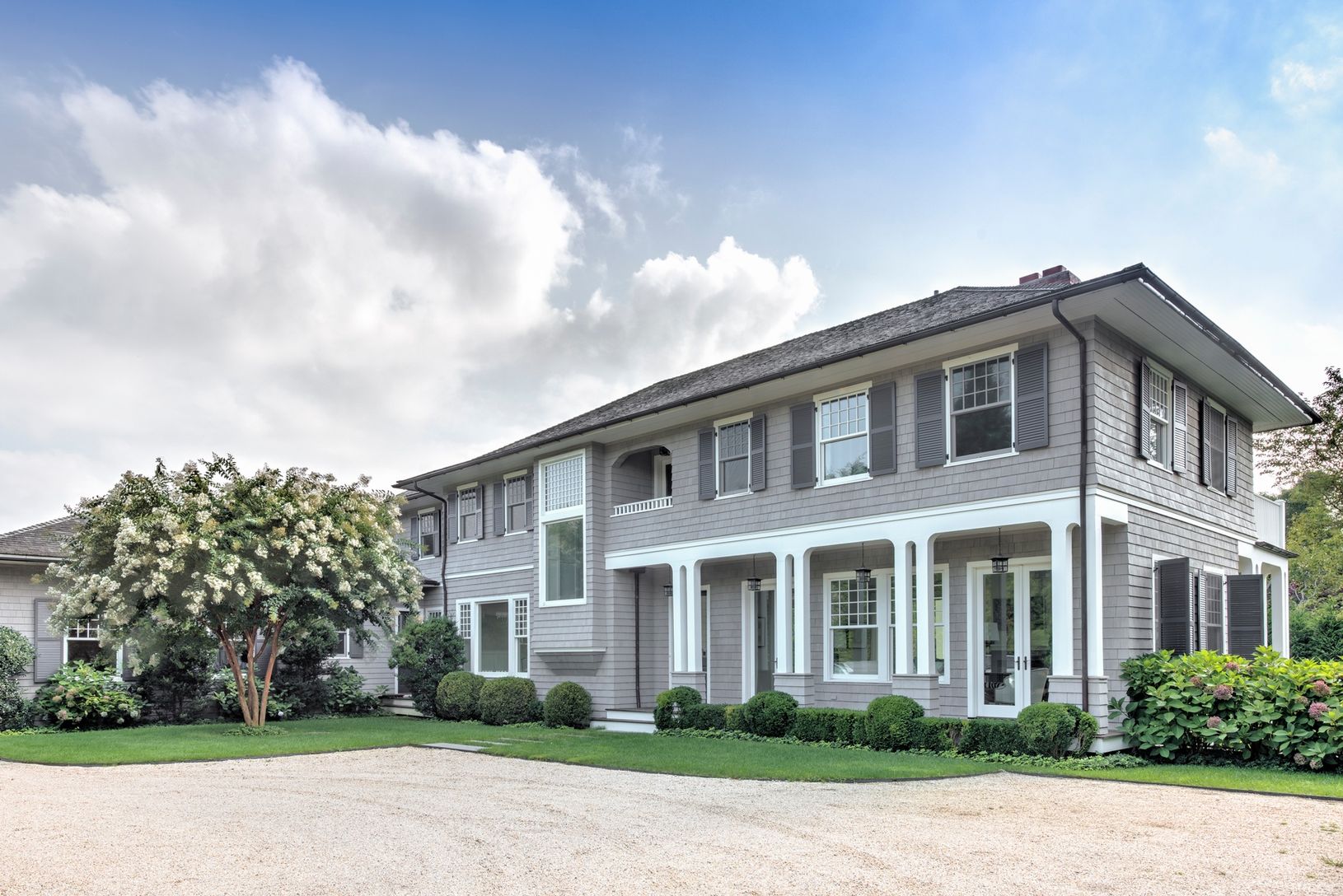 Travel down a long drive through motorized gates to arrive at this spectacular shingled traditional of over 5100 sf. on .76 acres in the Amagansett Lanes. Step into the entry foyer to see an expansive lawn through 8' tall glass French doors by Kolbe and Kolbe. The main level with 10' coffered ceilings opens to an elegant living room w/fireplace and covered porch with sunset views perfect for intimate outdoor entertaining. The sumptuous dining