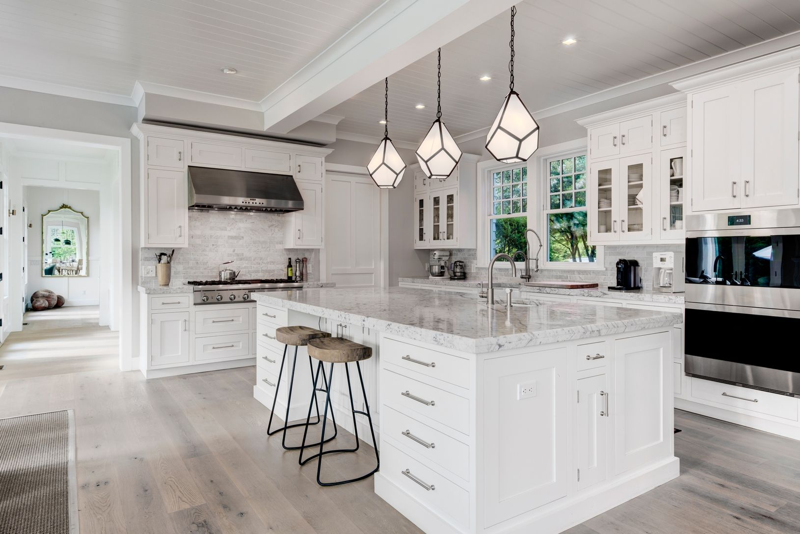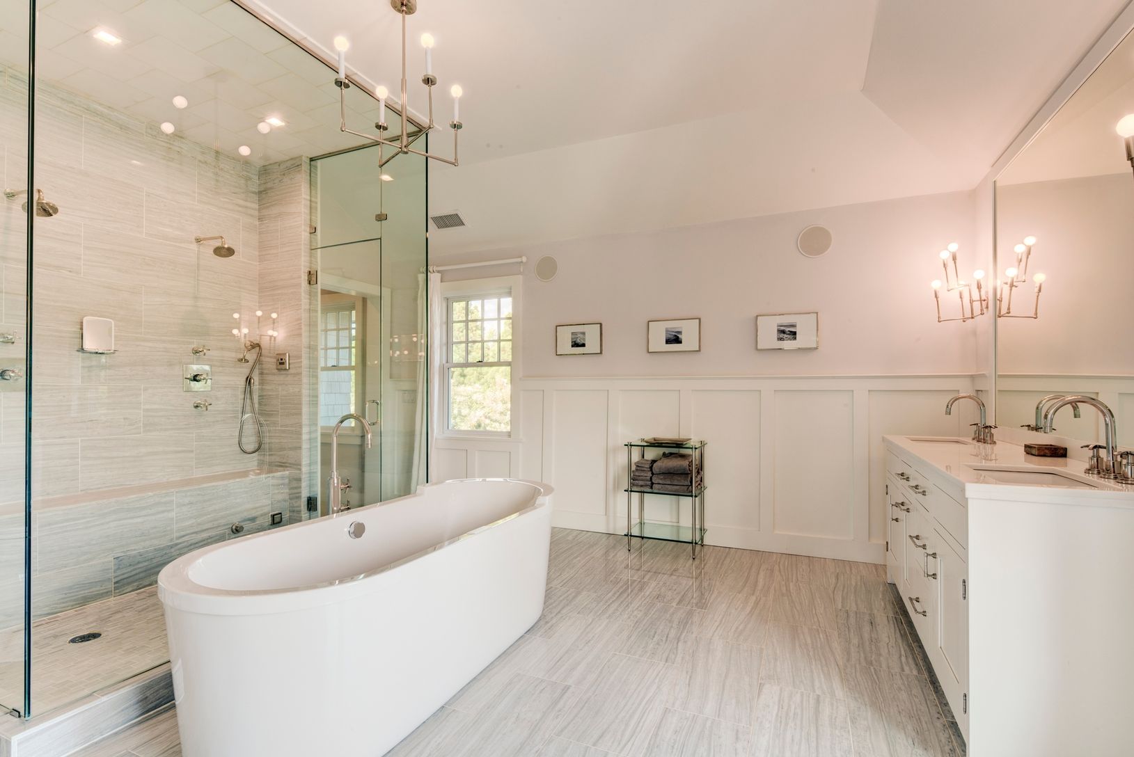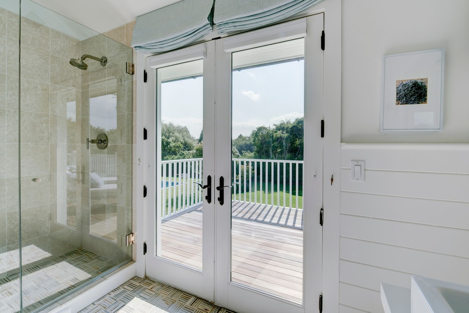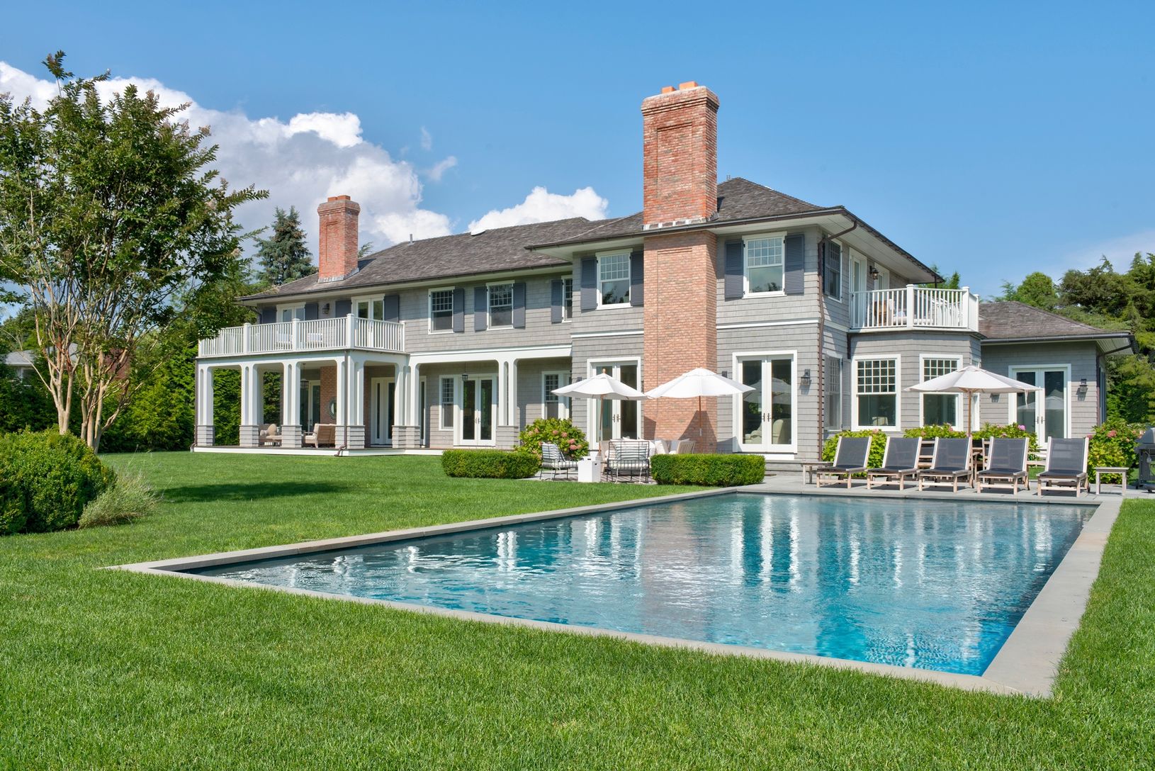 Travel down a long drive through motorized gates to arrive at this spectacular shingled traditional of over 5100 sf. on .76 acres in the Amagansett Lanes. Step into the entry foyer to see an expansive lawn through 8' tall glass French doors by Kolbe and Kolbe. The main level with 10' coffered ceilings opens to an elegant living room w/fireplace and covered porch with sunset views perfect for intimate outdoor entertaining. The sumptuous dining