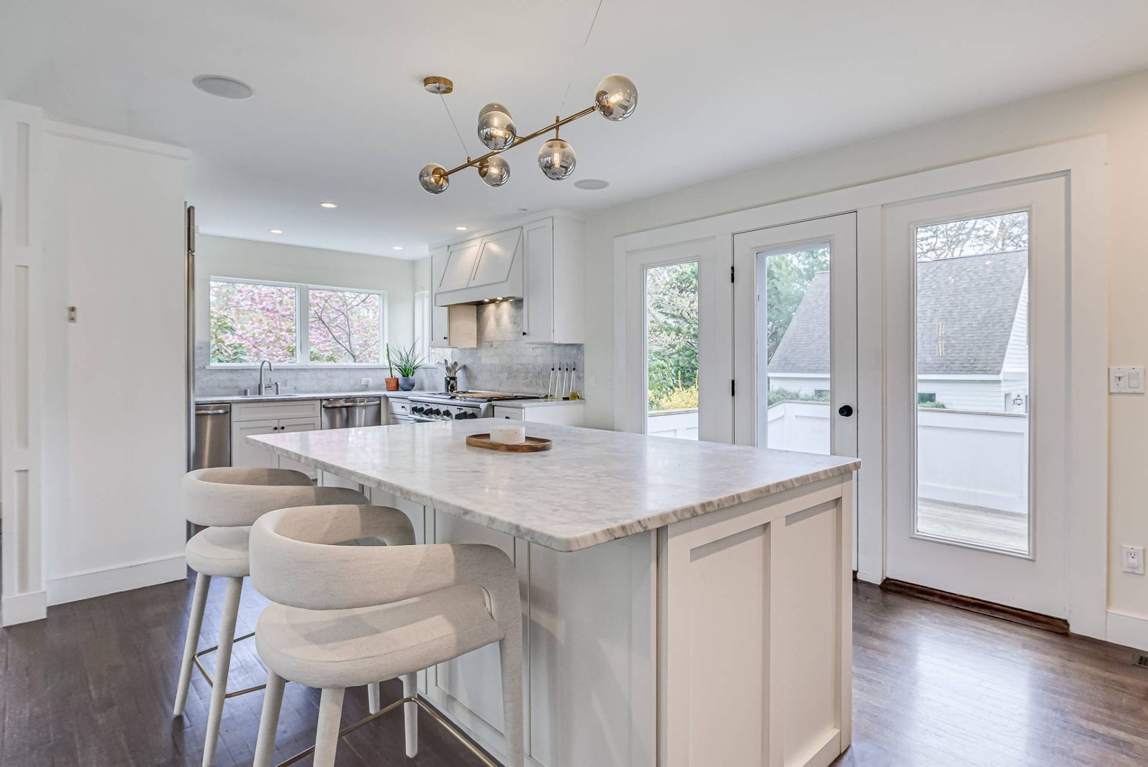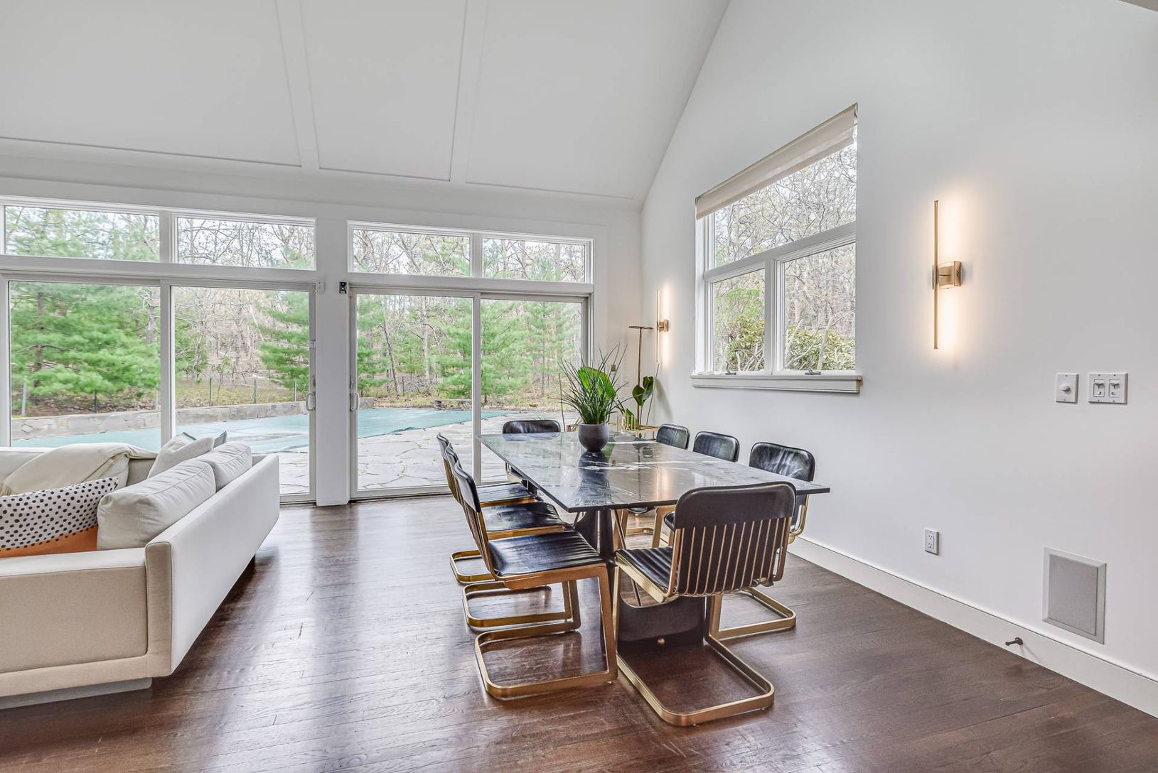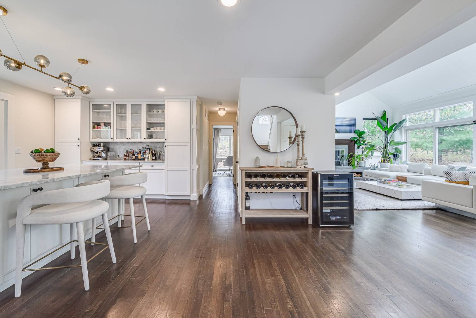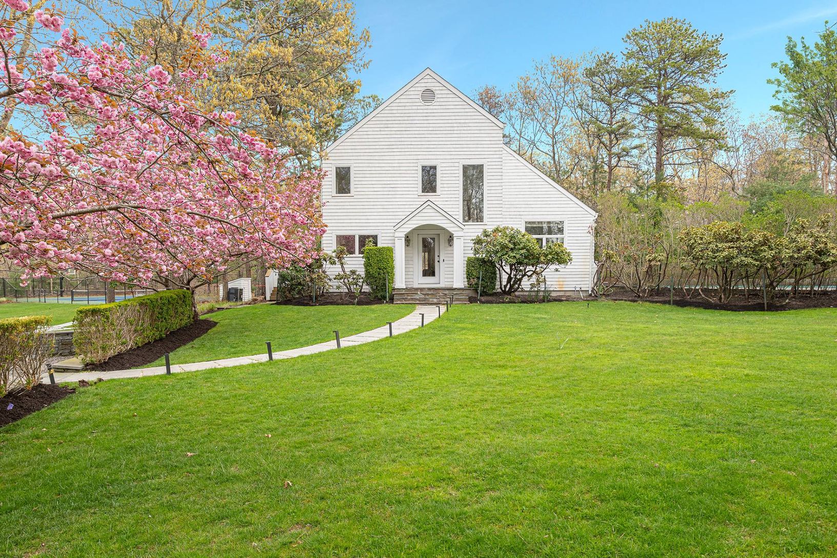 Located only 3.5 miles to East Hampton Village and Sag Harbor Village, on a private five full acres with tennis, pool and spa, this four bedroom home has everything you might need and then some. The oversized gourmet kitchen has Carrara marble countertops, two dishwashers, an expansive island and a separated bar area. It adjoins the dining area and the double height, open concept great room with a wall of glass doors providing easy pool access