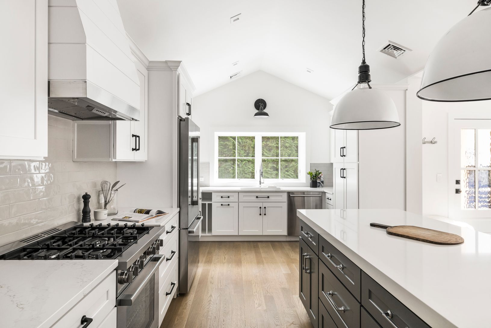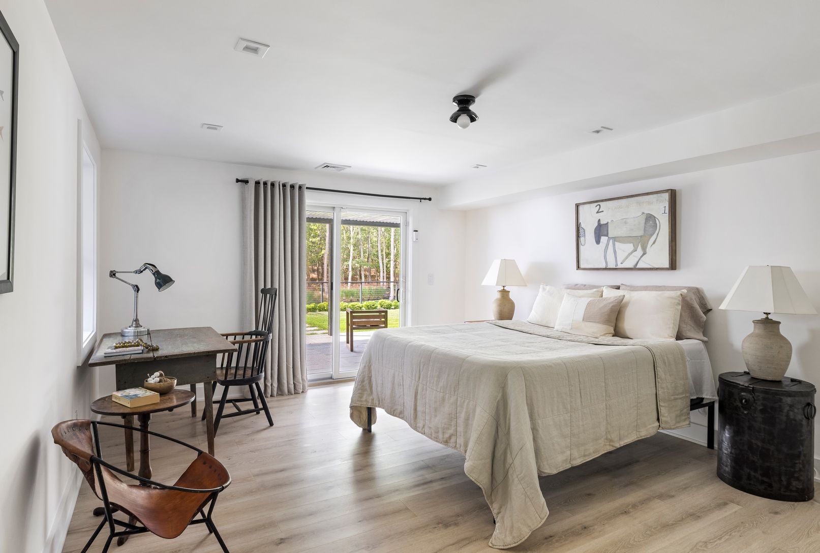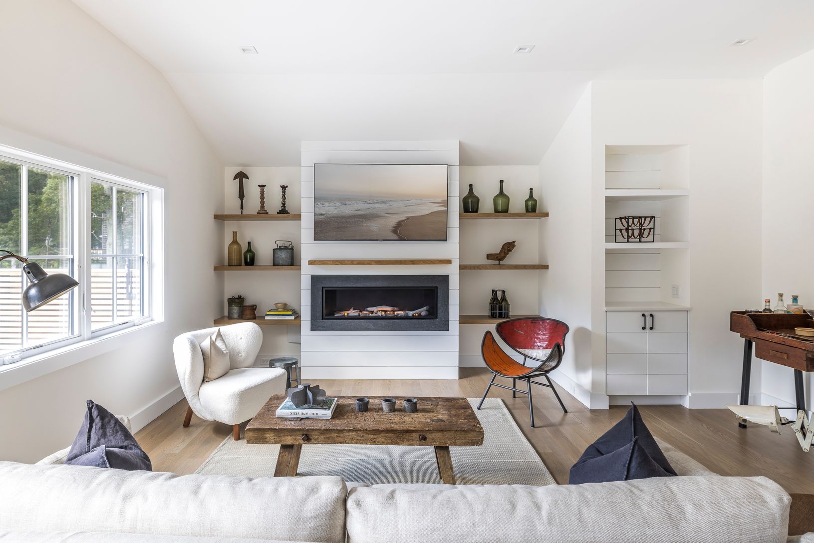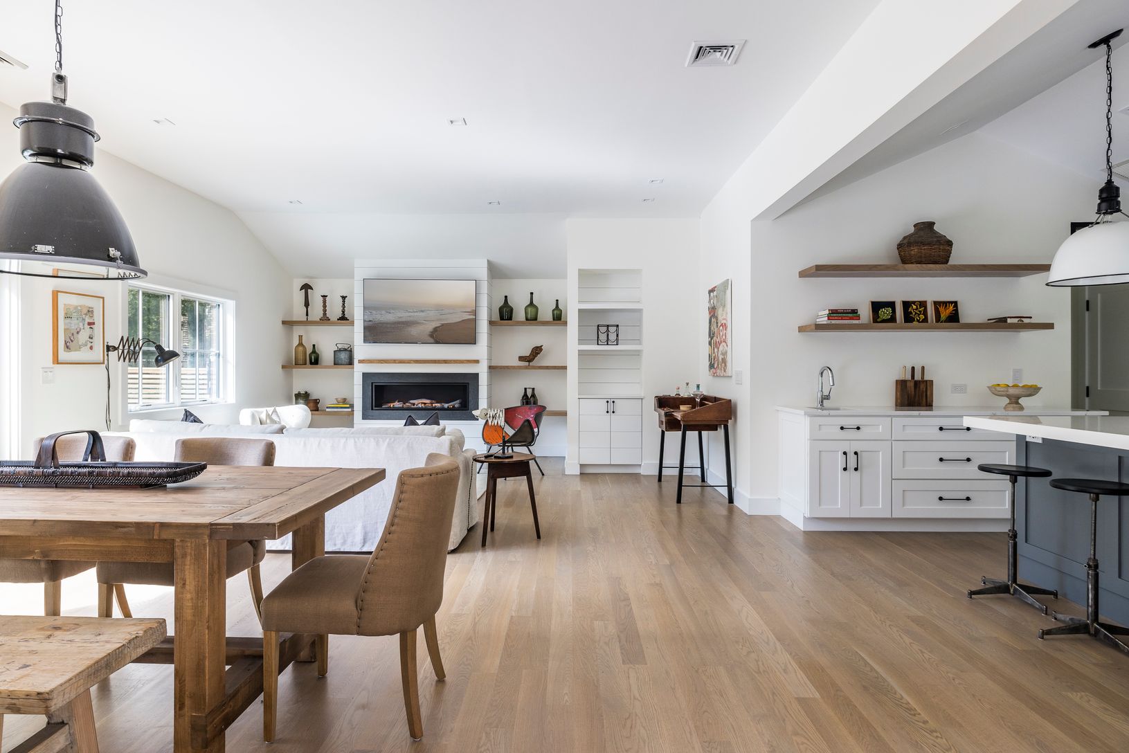 Set on a private acre, this gut-renovated Southampton home offers a breathtaking transformation with 4 bedrooms, 5 baths, and an open-concept kitchen, dining, and living room featuring cathedral ceilings, white oak plank flooring, and a gas fireplace. The exterior is an oasis, showcasing a stunning 18' x 38' heated gunite pool, bluestone decking, custom stone gas fire pit, and lush landscaping. An impressive entertainment room with polished co