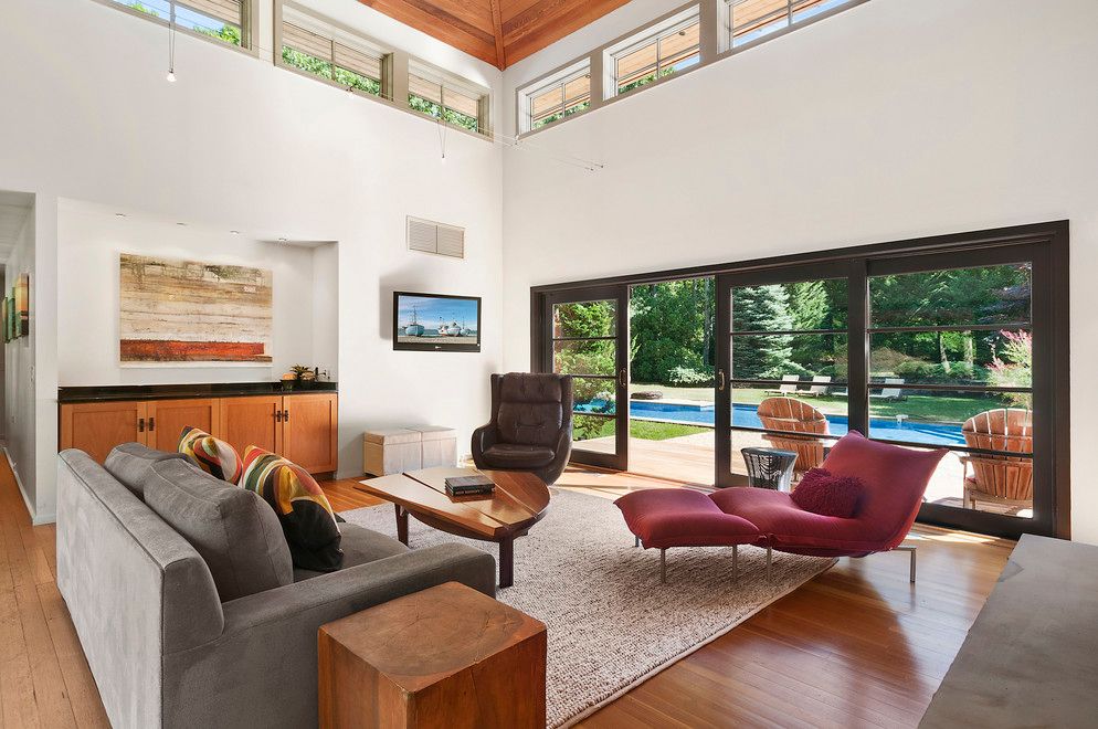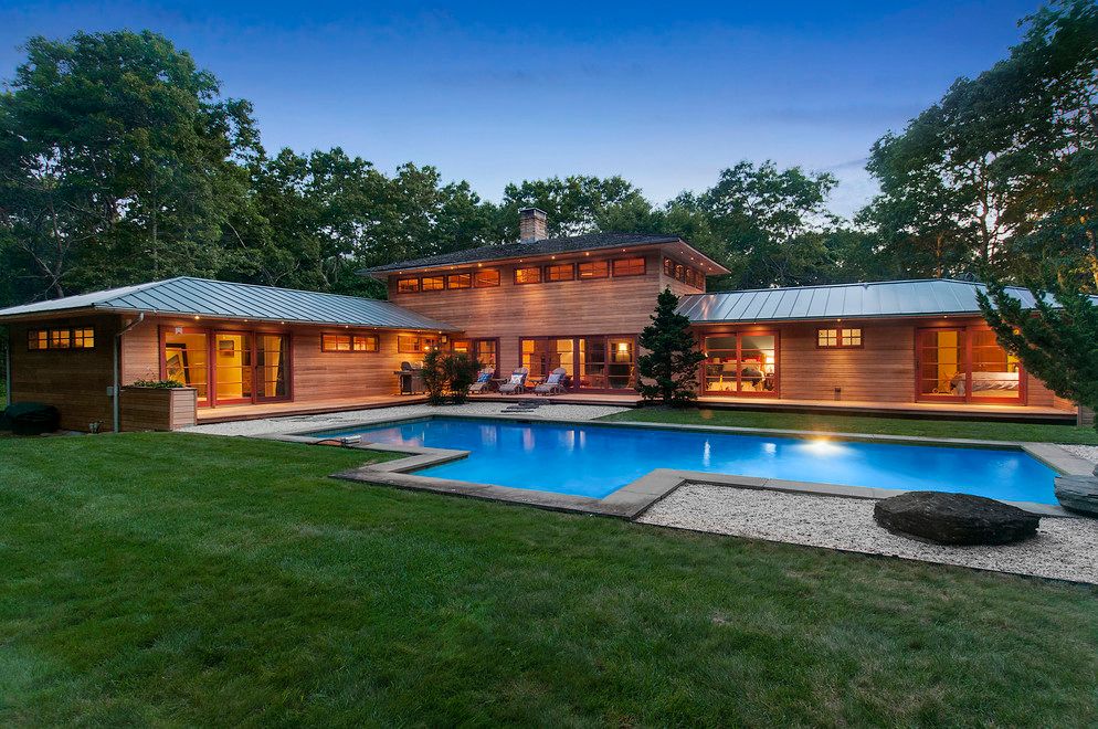 Set on two gorgeous acres of beautifully landscaped property in desirable Sagaponack, this modern 4 bedroom, 3 bath home has so much to offer. Enjoy the pleasures of single-level living, and double your living/entertaining space by bringing the outdoors in via floor-to-ceiling glass doors that open on to mahogany decking, heated gunite pool and gorgeous gardens. The gourmet kitchen and double-height great room with an immense double-sided ston