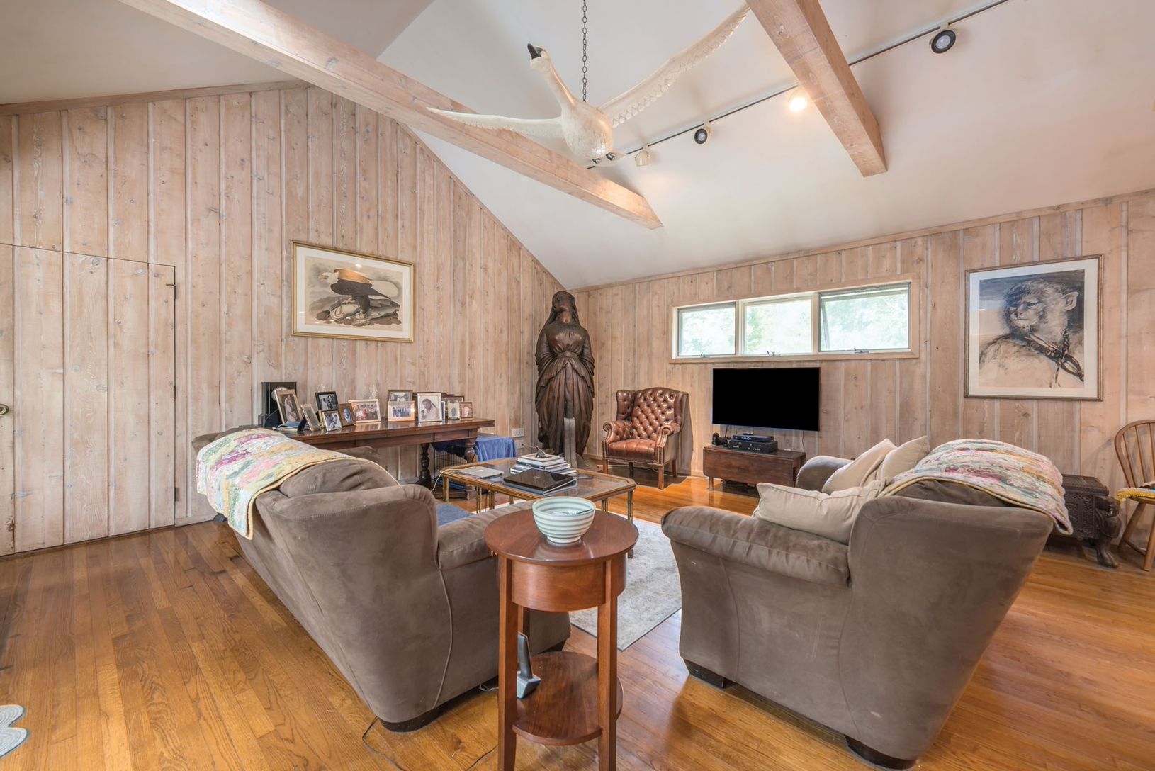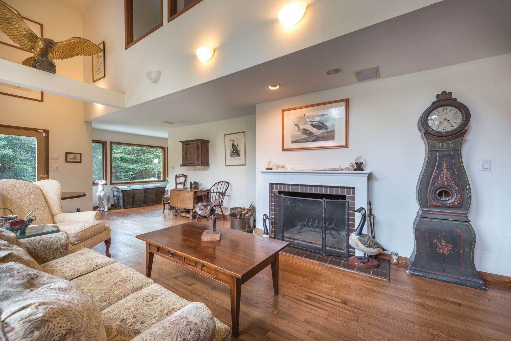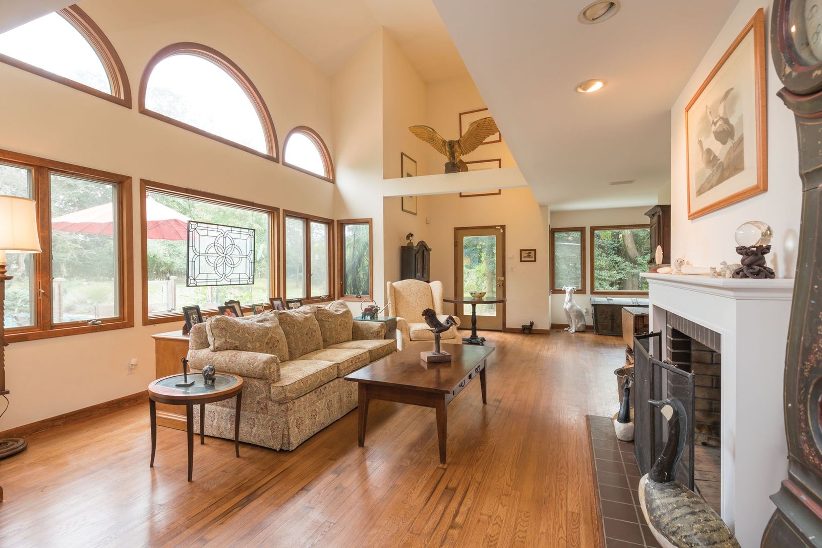 Country meets contemporary in this architecturally unique 3,600 +/- sq. ft. home located on one of the most desirable streets in bucolic Remsenburg. Highlights include a first floor master with screened porch; spacious rooms with soaring ceilings, rustic beams and clerestory windows; and a huge kitchen/great room with wood-burning fireplace and rough-hewn wood walls. There's also an open living room with fireplace, library with walls of bookca