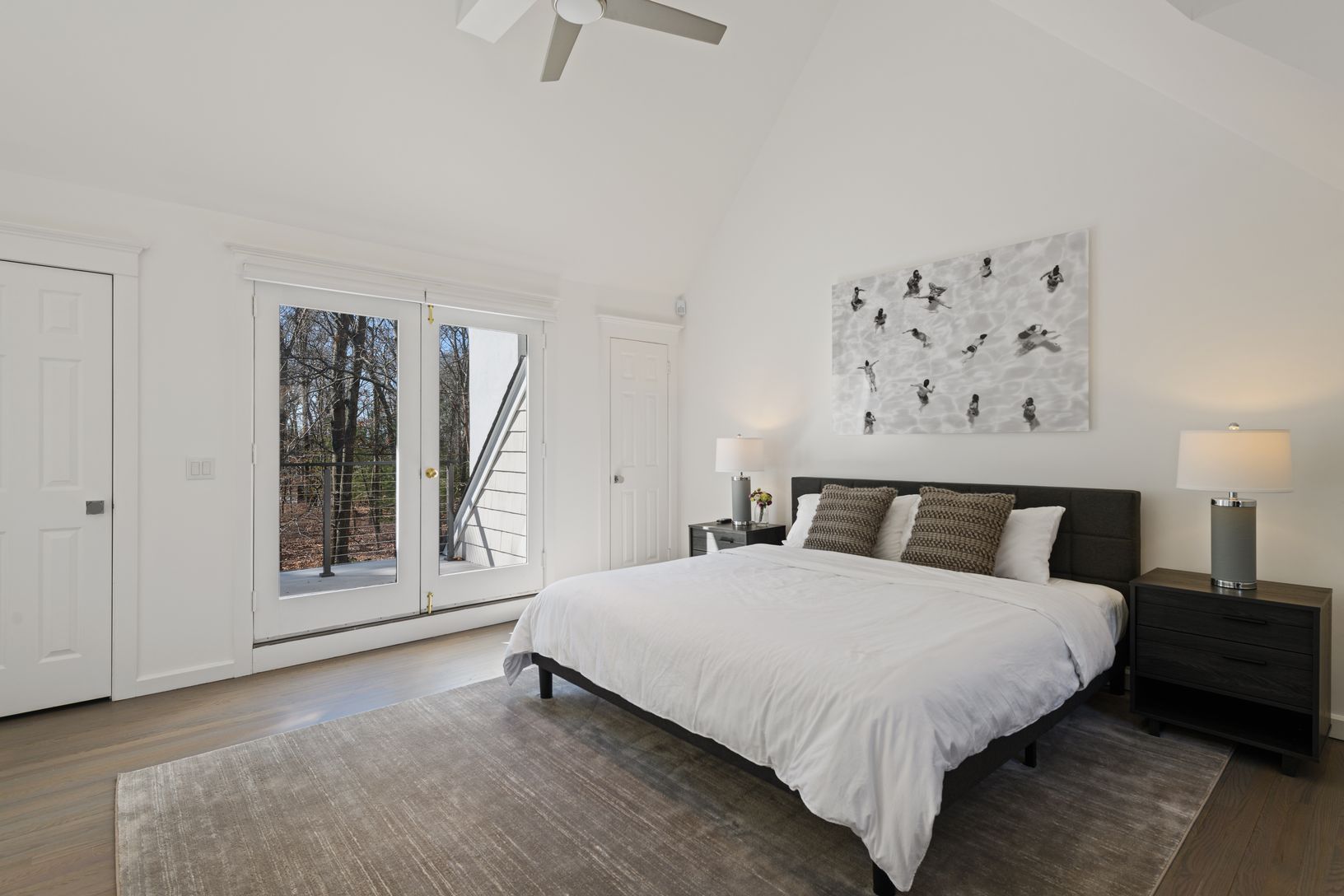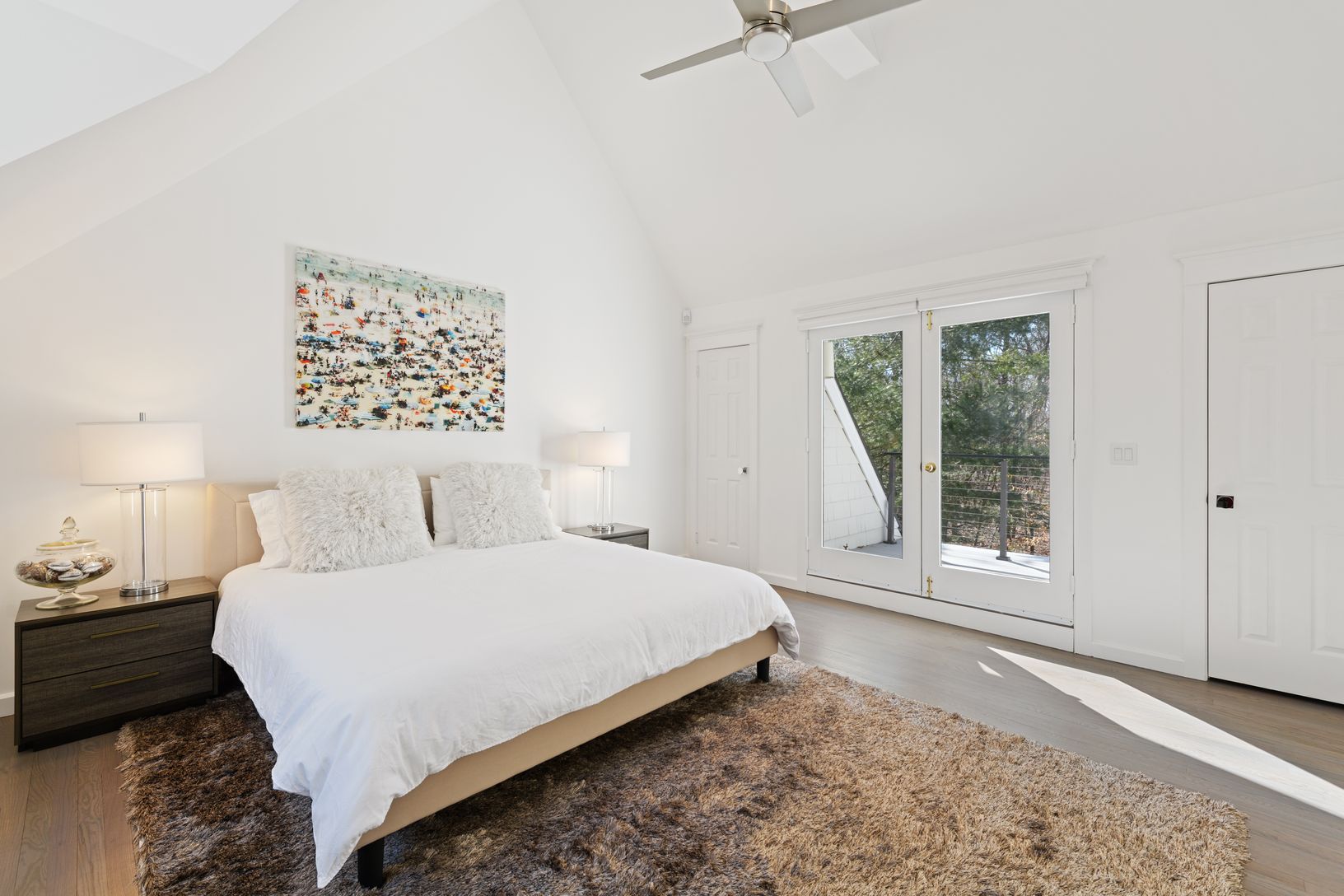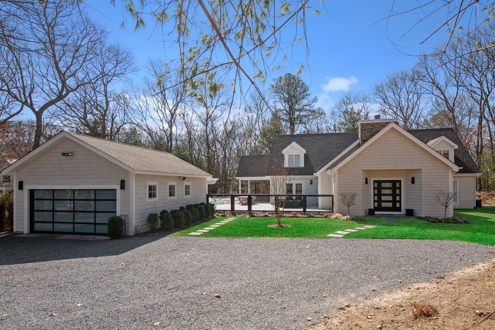 Just minutes from East Hampton Village, this beautifully renovated Post Modern home is nestled on a cul-de-sac. Featuring 4 very large bedrooms all with luxurious en-suite bathrooms, privacy is achieved with the Master bedroom and a guest bedroom on the main floor and two guest rooms on opposite sides of the house on the 2nd floor. The cathedral ceiling great room hosts beautiful light all day long, and is cozy at night with its roaring fire