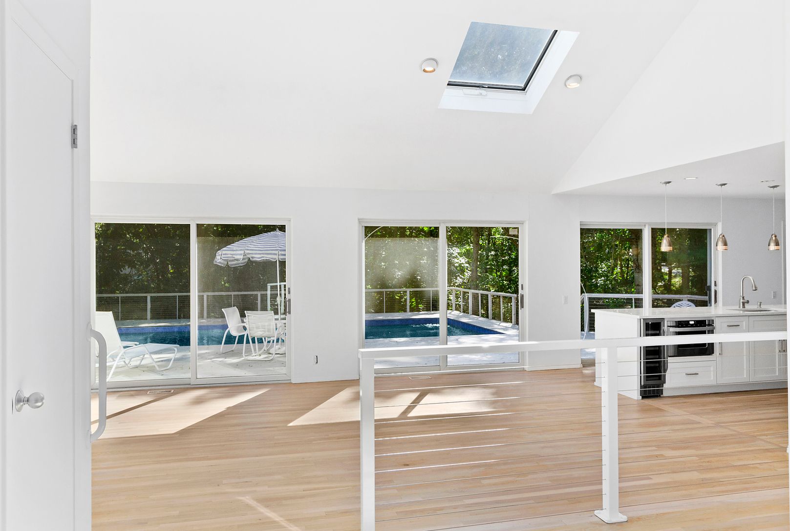 In one of East Hampton's most conveniently located and highly coveted neighborhoods, is this 4 bedroom, 31/2 bath beautifully renovated one-level sleek and stylish Contemporary home. Amenities include an open-floor plan, fully-equipped kitchen, fireplace, detached one car garage, CAC, and glass doors that lead out to a spacious deck and heated pool. Set nicely back on a private 3/4 acre, this home for all seasons is minutes away from the villa