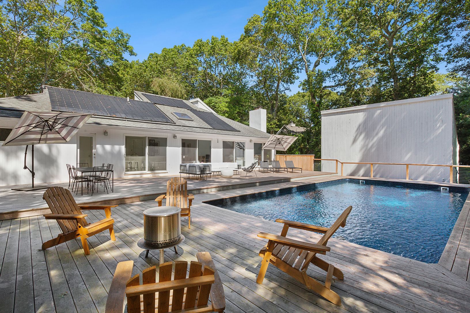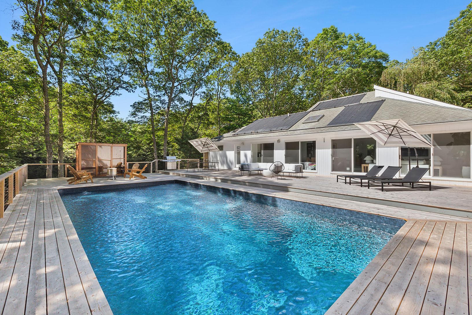 In one of East Hampton's most sought-after neighborhoods, just a mile from the Village, discover this impeccably renovated contemporary retreat. Meticulously redone from top to bottom in 2017, the four-bedroom, three-and-a-half-bath single-level home is sleek, stylish, and filled with natural light. The open layout is anchored by a chef's kitchen with top-of-the-line finishes, while soaring ceilings and a wall of glass doors invite seamless in