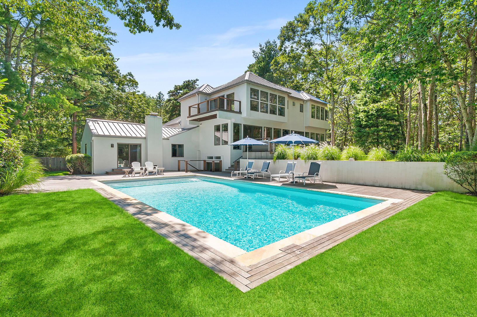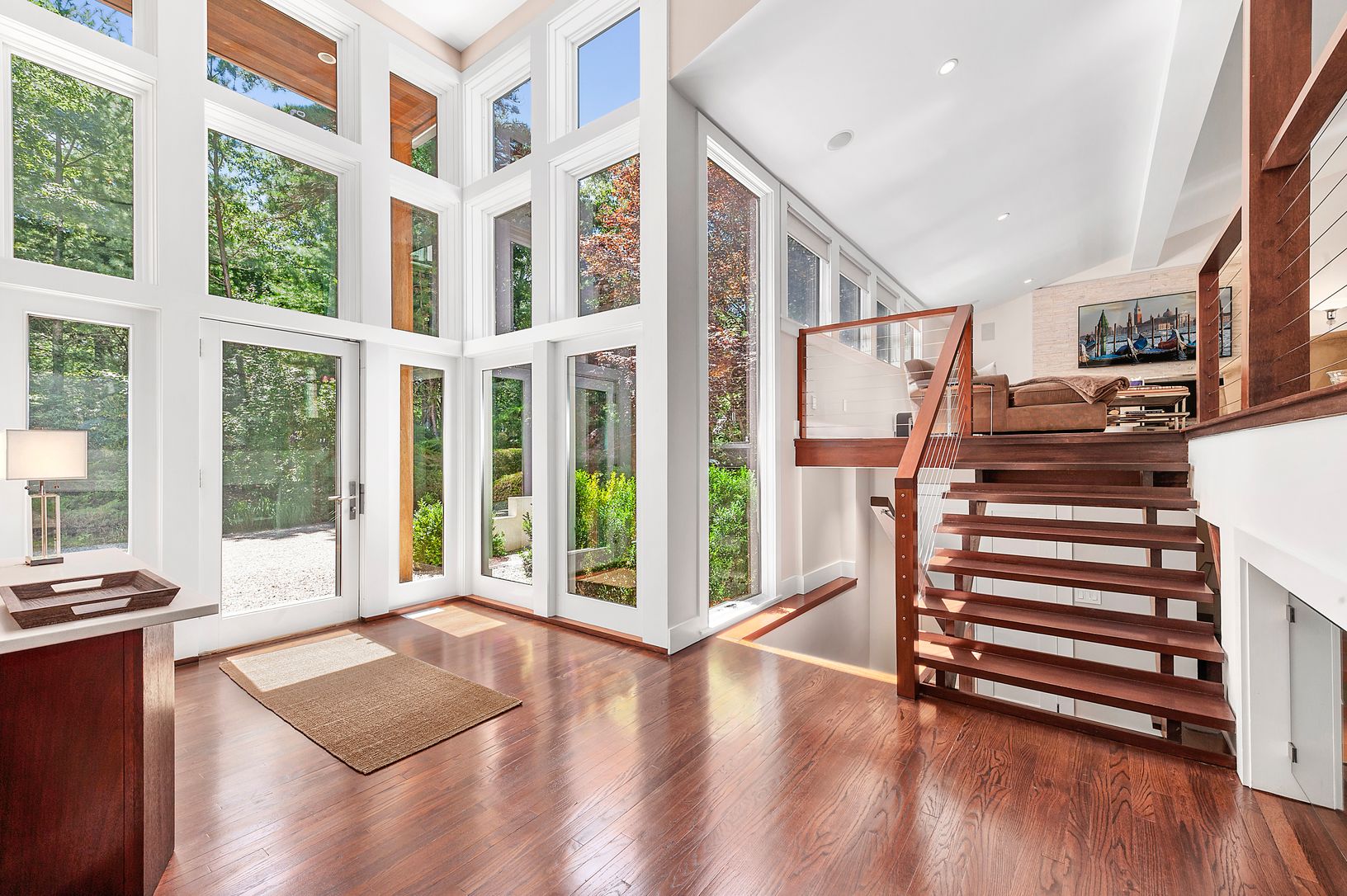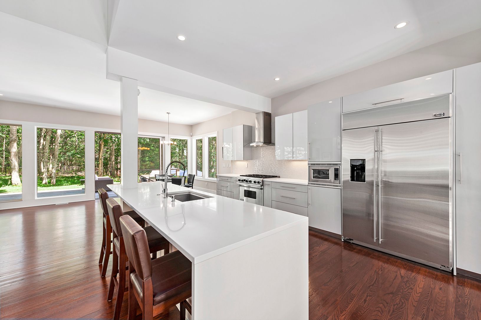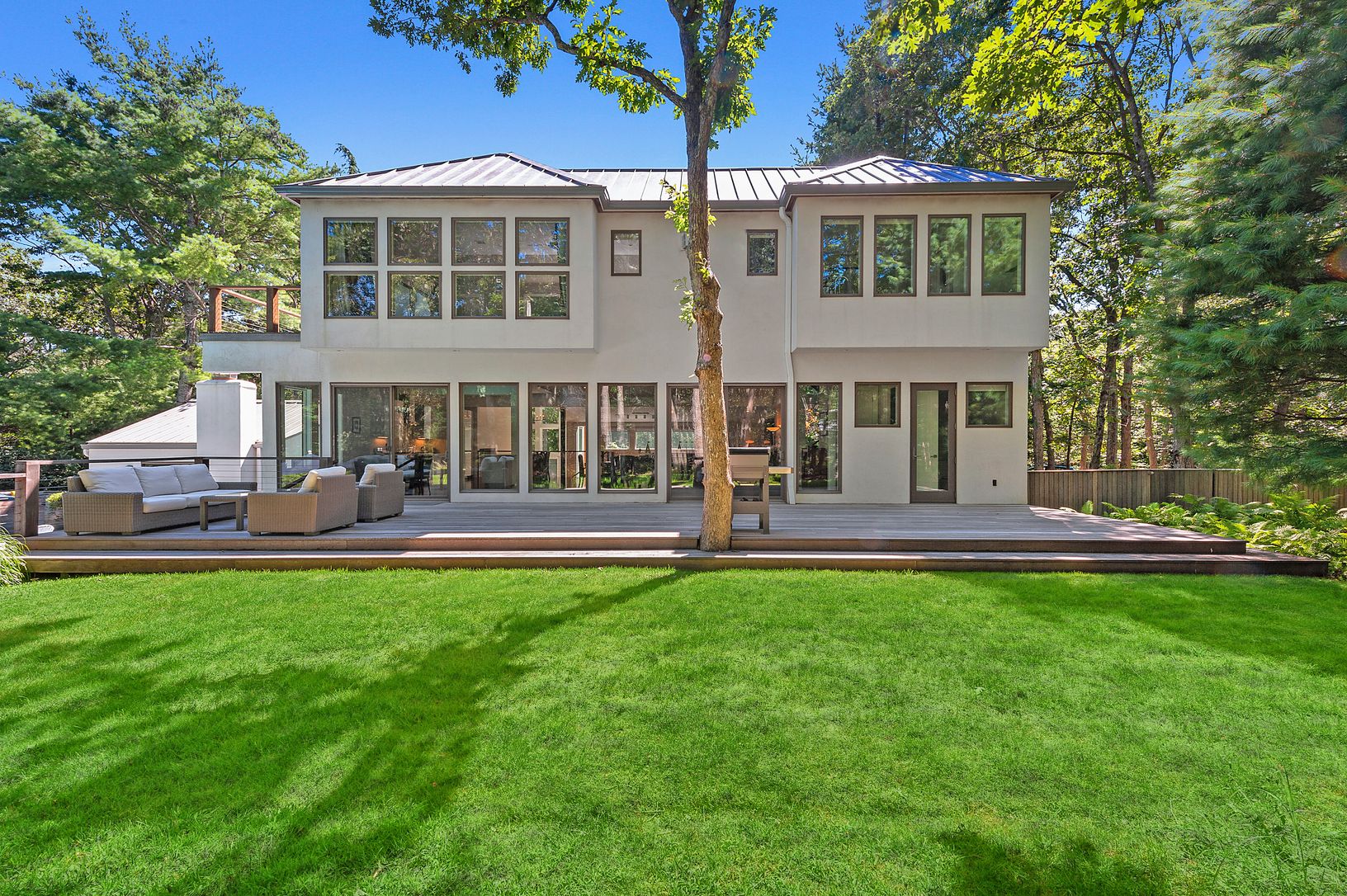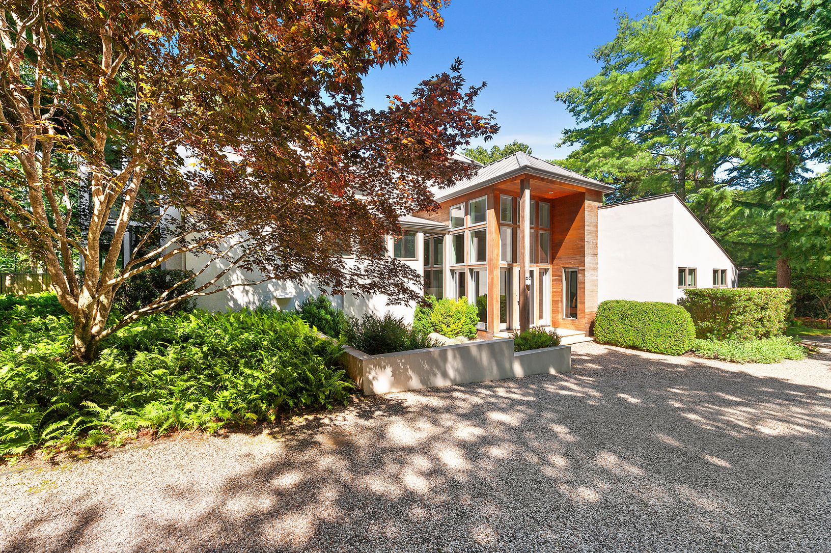 Impeccable modern residence offers four bedrooms with four full and one half bath and 4,500 sq. sf. of living space, sited on a private .78 acres. Upon entering through the double height entry foyer, walls of windows bathe the home in natural light. This residence truly embodies open plan living with a large living room area, dining room, breakfast area, and open kitchen featuring stainless appliances a Viking range and dual Miele dishwasher