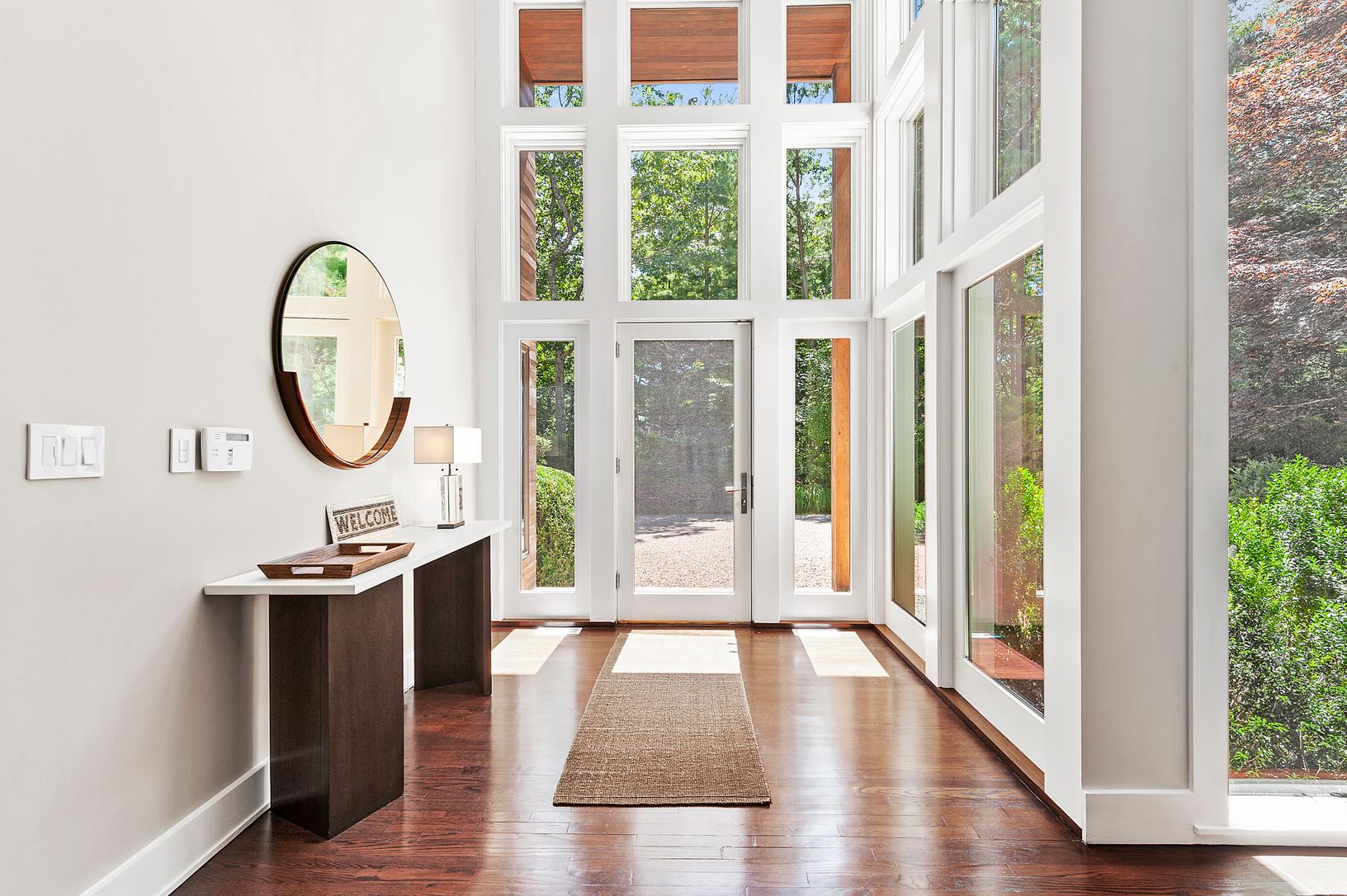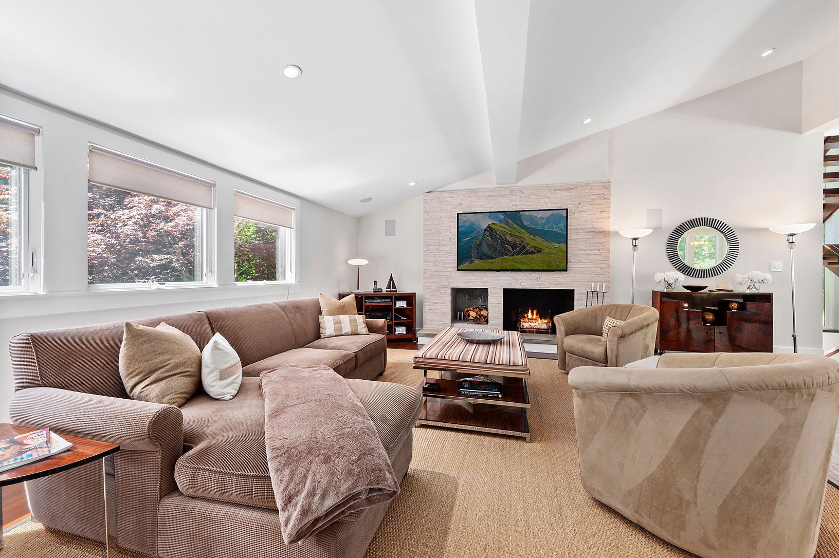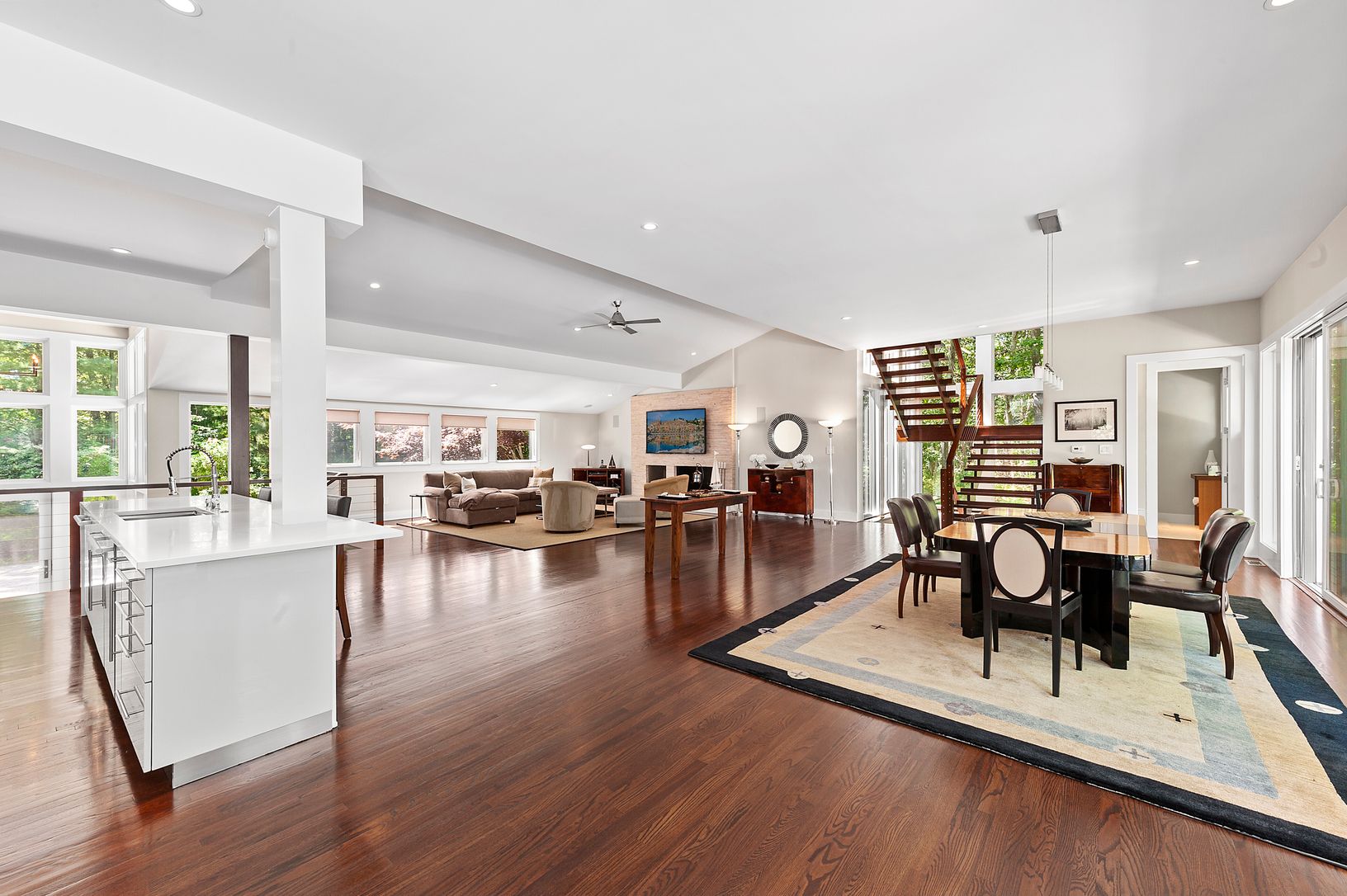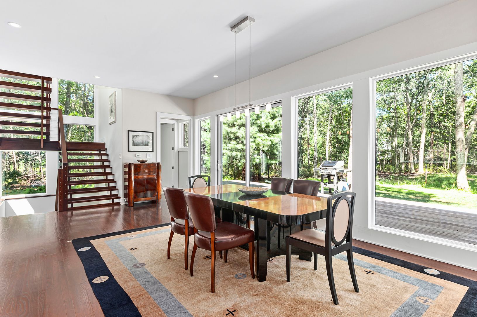 Impeccable modern residence offers four bedrooms with four full and one half bath and 4,500 sq. sf. of living space, sited on a private .78 acres. Upon entering through the double height entry foyer, walls of windows bathe the home in natural light. This residence truly embodies open plan living with a large living room area, dining room, breakfast area, and open kitchen featuring stainless appliances a Viking range and dual Miele dishwasher