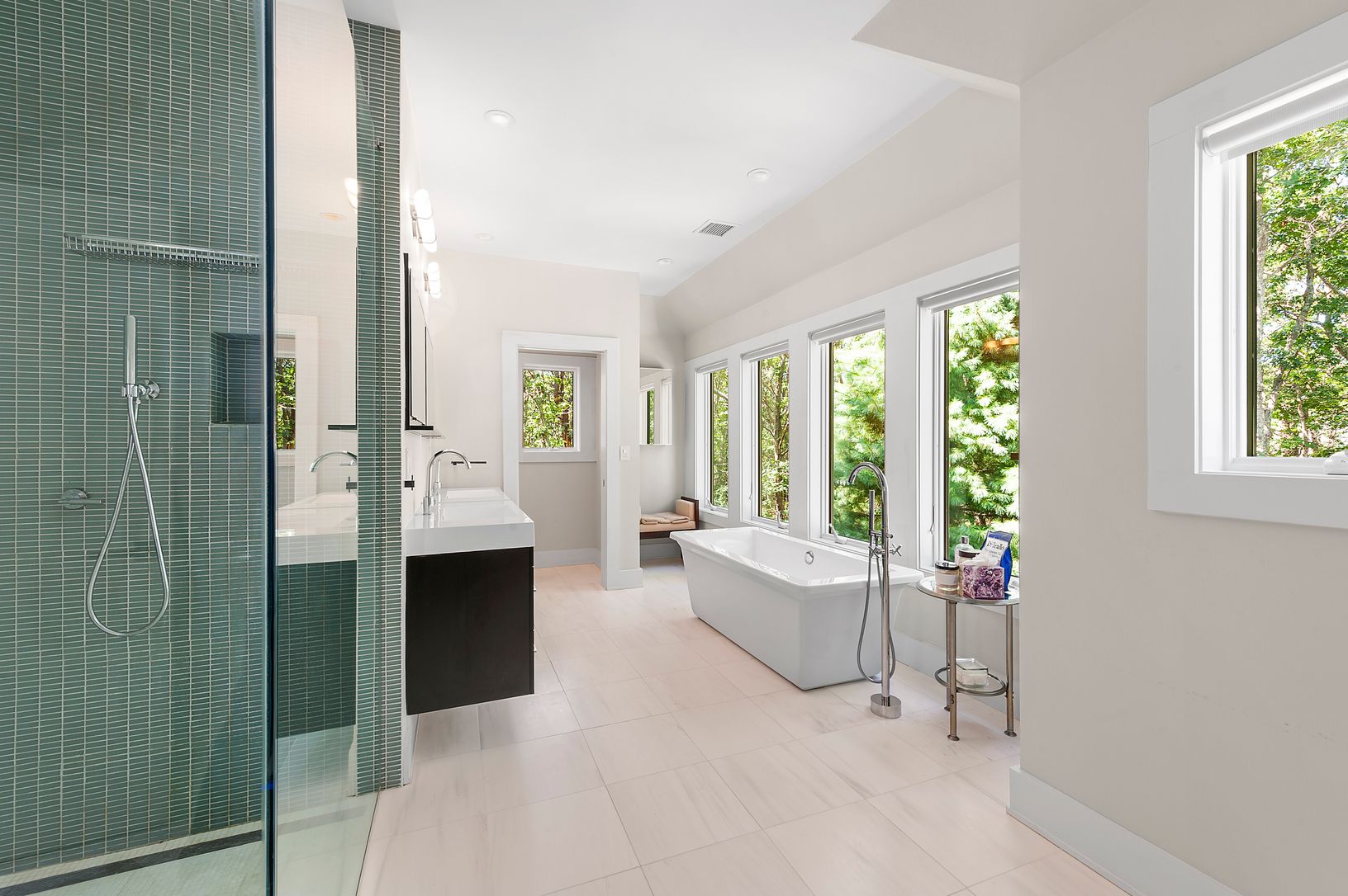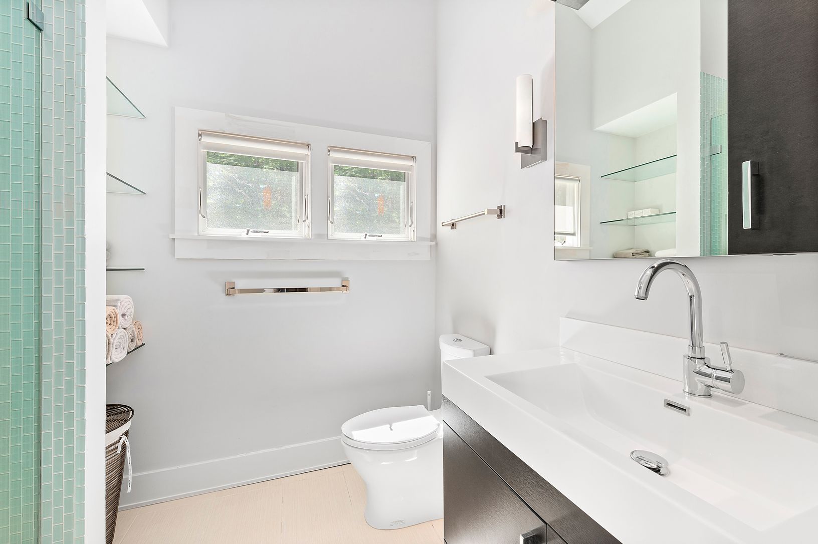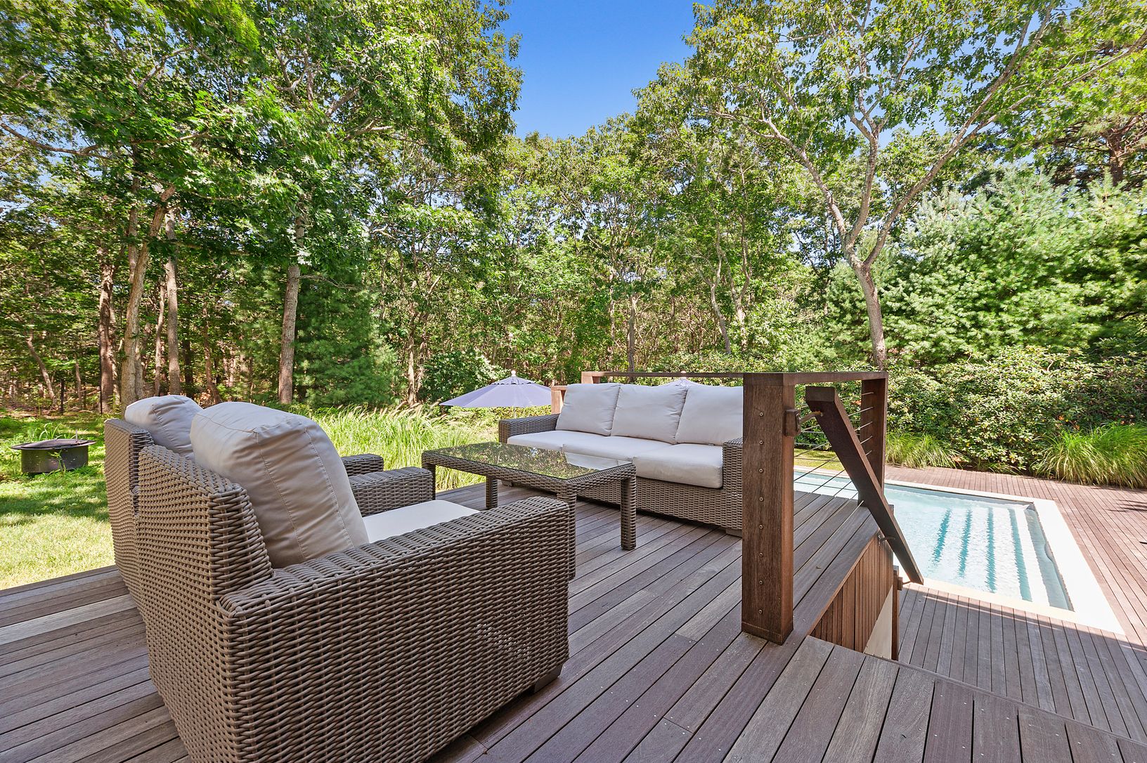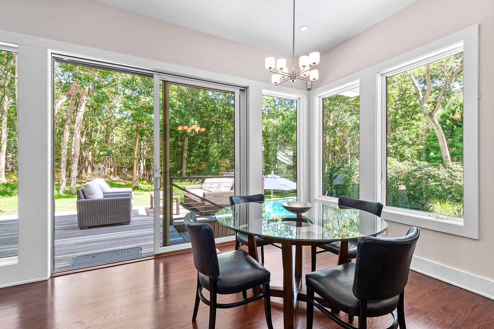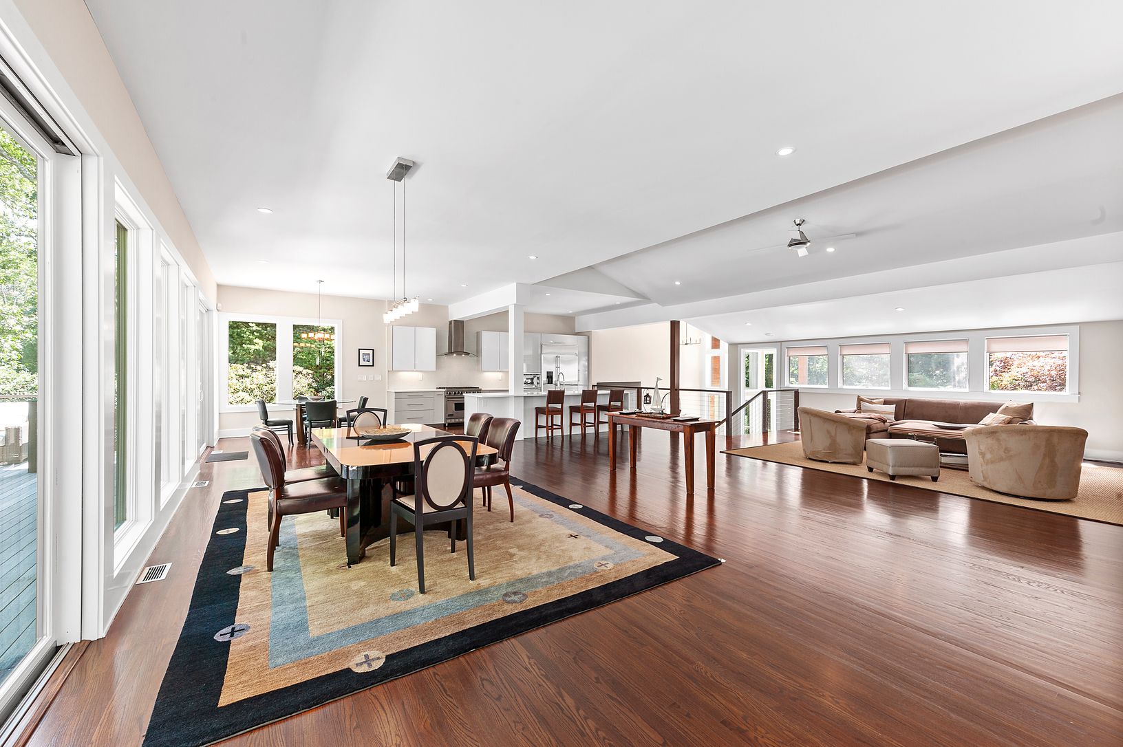 Impeccable modern residence offers four bedrooms with four full and one half bath and 4,500 sq. sf. of living space, sited on a private .78 acres. Upon entering through the double height entry foyer, walls of windows bathe the home in natural light. This residence truly embodies open plan living with a large living room area, dining room, breakfast area, and open kitchen featuring stainless appliances a Viking range and dual Miele dishwasher
