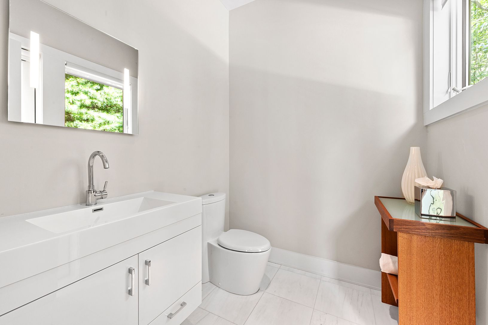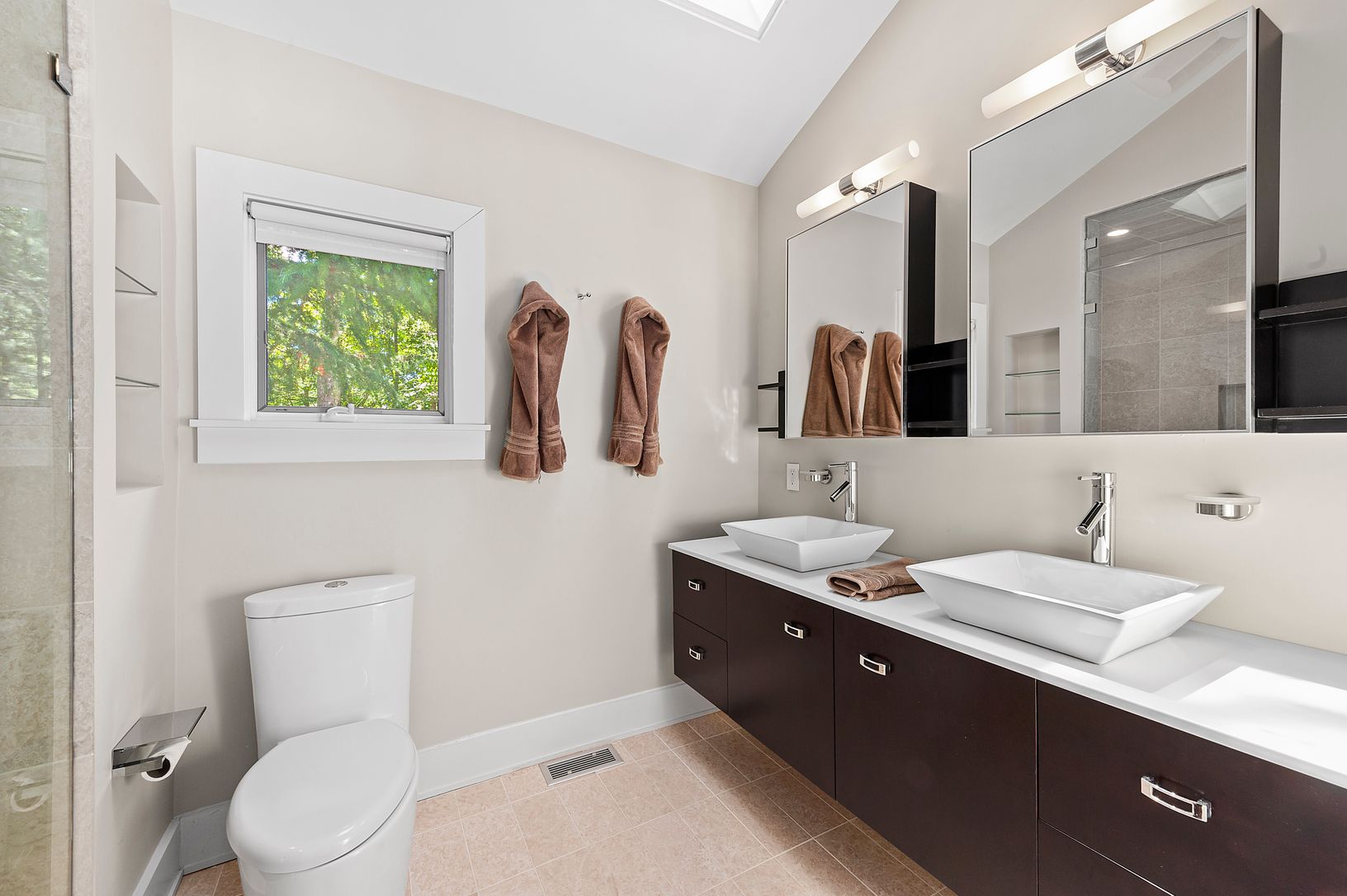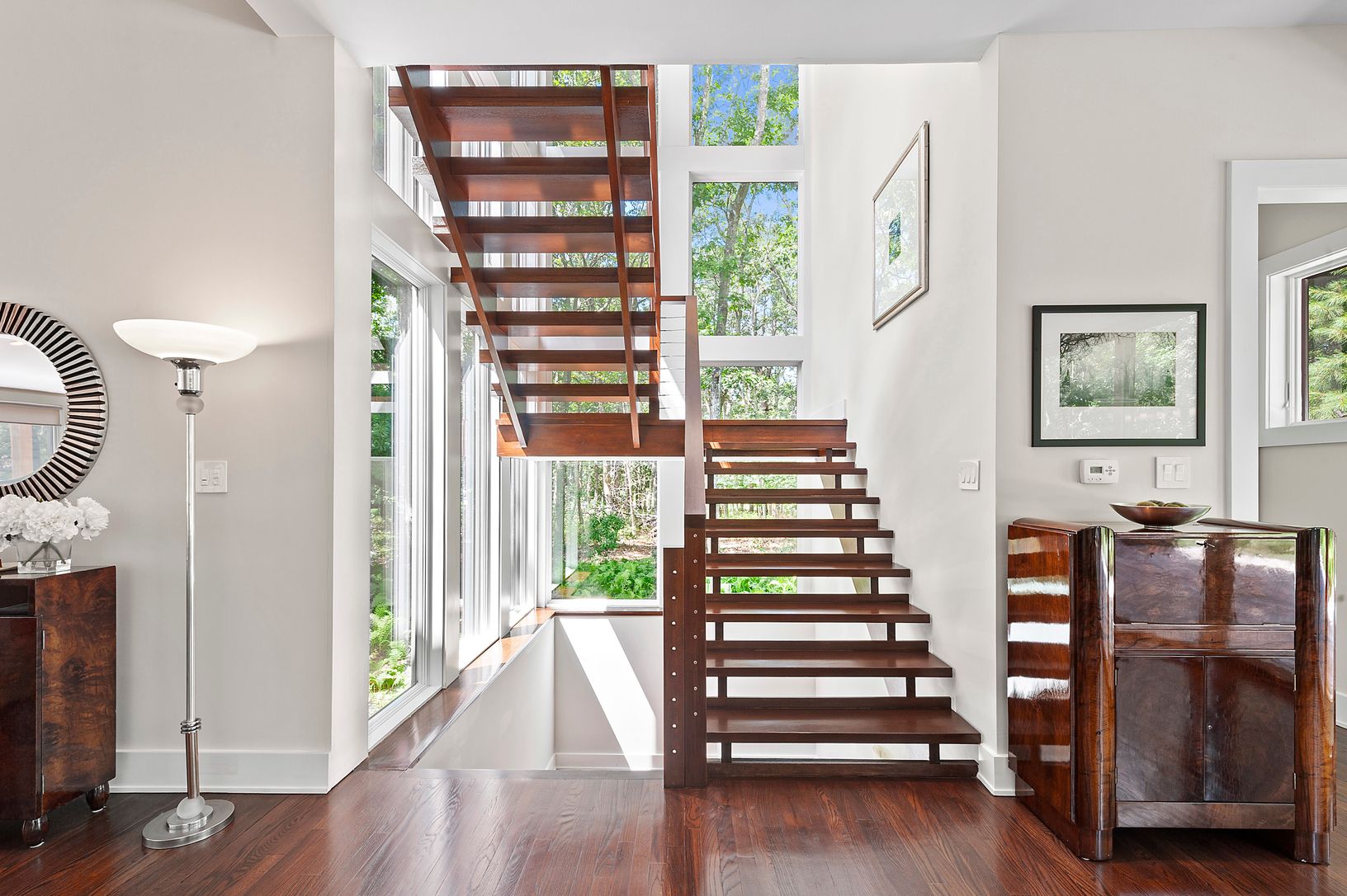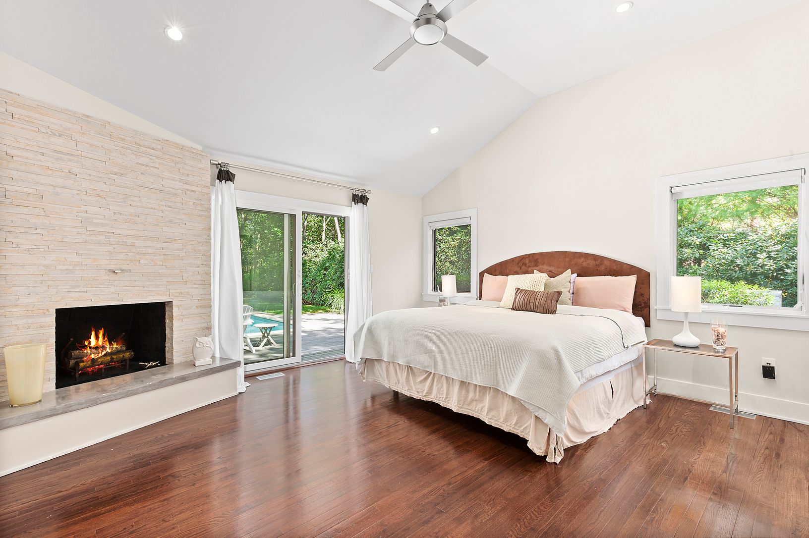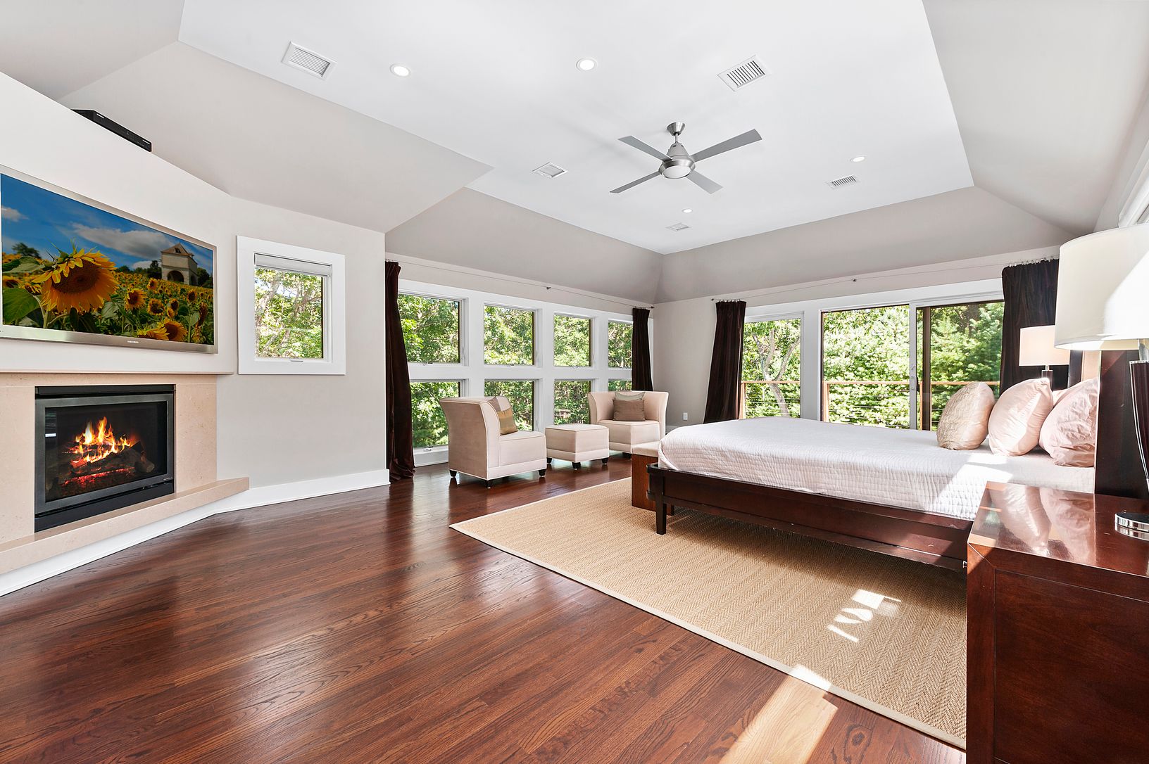 Impeccable modern residence offers four bedrooms with four full and one half bath and 4,500 sq. sf. of living space, sited on a private .78 acres. Upon entering through the double height entry foyer, walls of windows bathe the home in natural light. This residence truly embodies open plan living with a large living room area, dining room, breakfast area, and open kitchen featuring stainless appliances a Viking range and dual Miele dishwasher