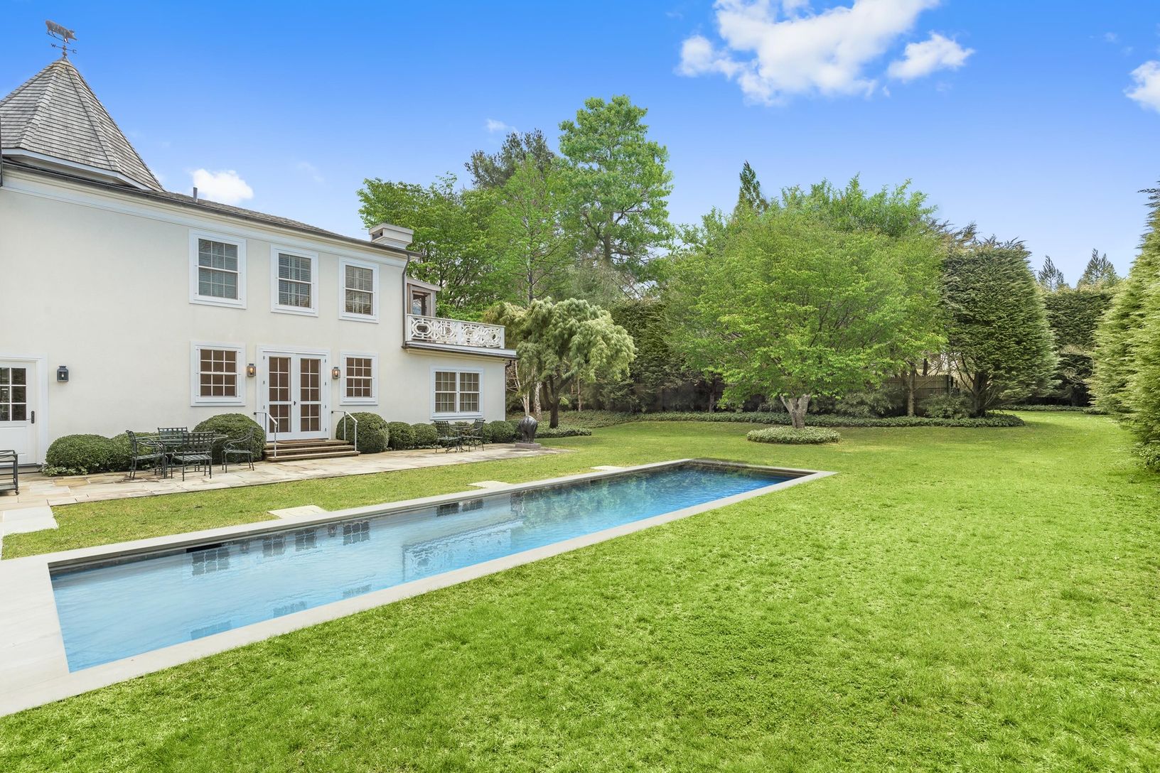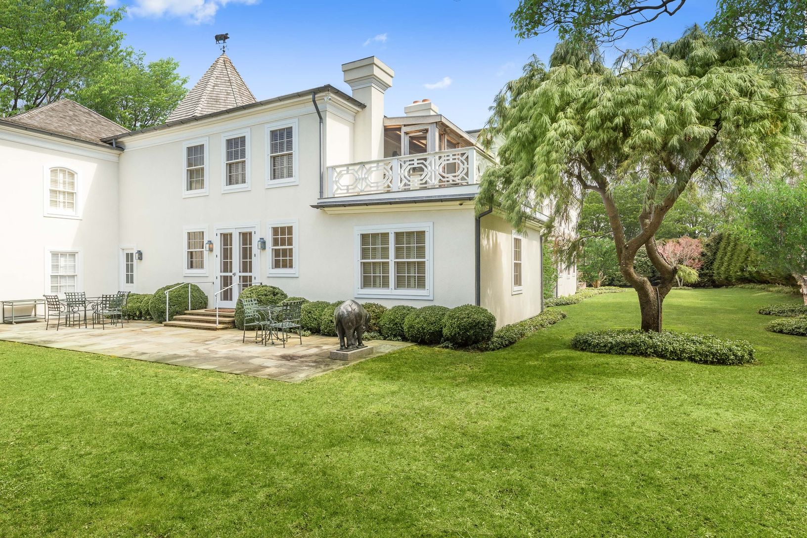 Privately situated among mature landscaping, this French style stucco residence offers 5 large bedrooms and 5 and one half bath. The house has a traditional layout featuring a chefs kitchen, formal dining room, living room and large sitting room. Two of the five en suite bedrooms are on the first floor. A large entry foyer with a curved stair case leads upstairs to the master and two additional guest rooms. Specimen trees surround the propert