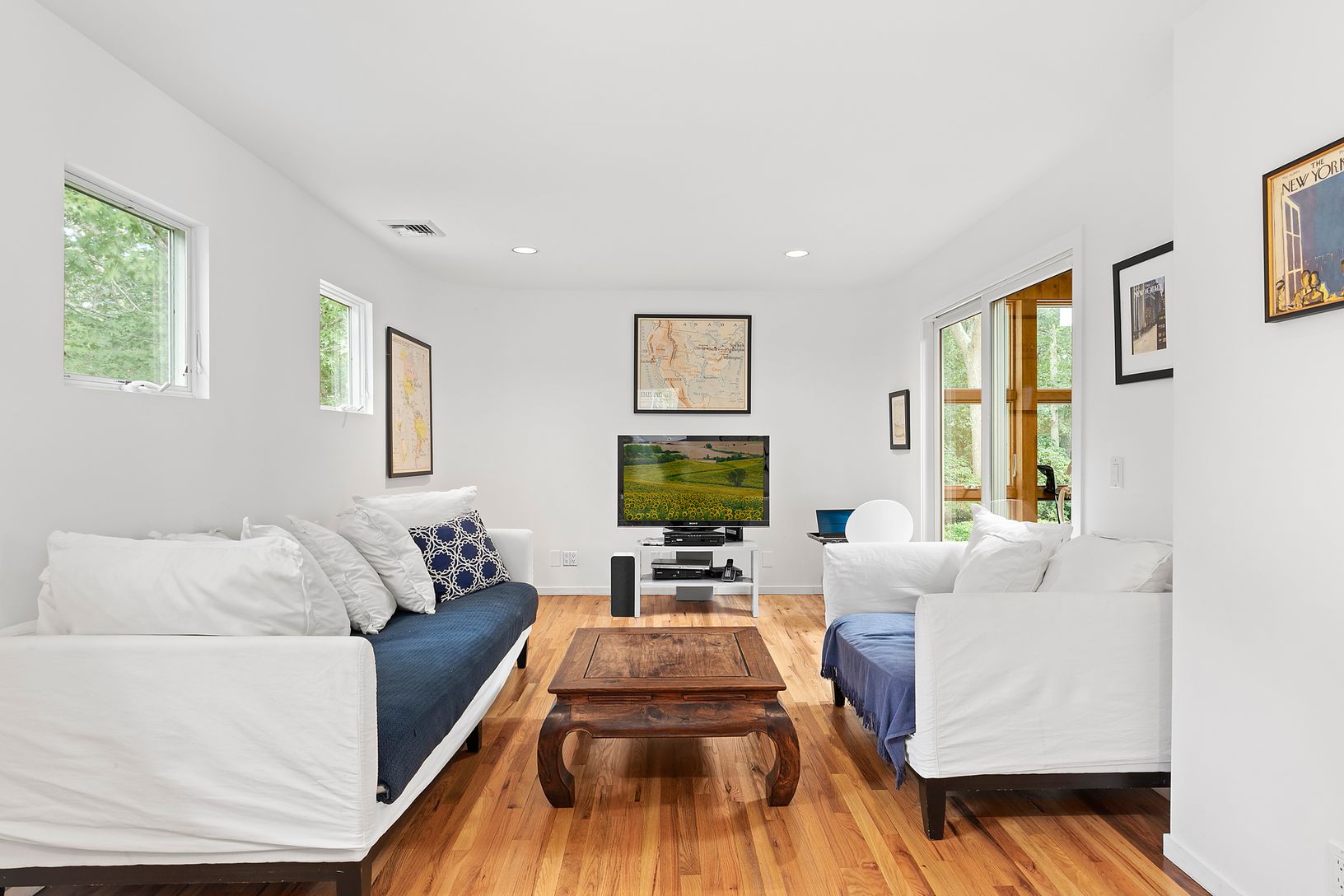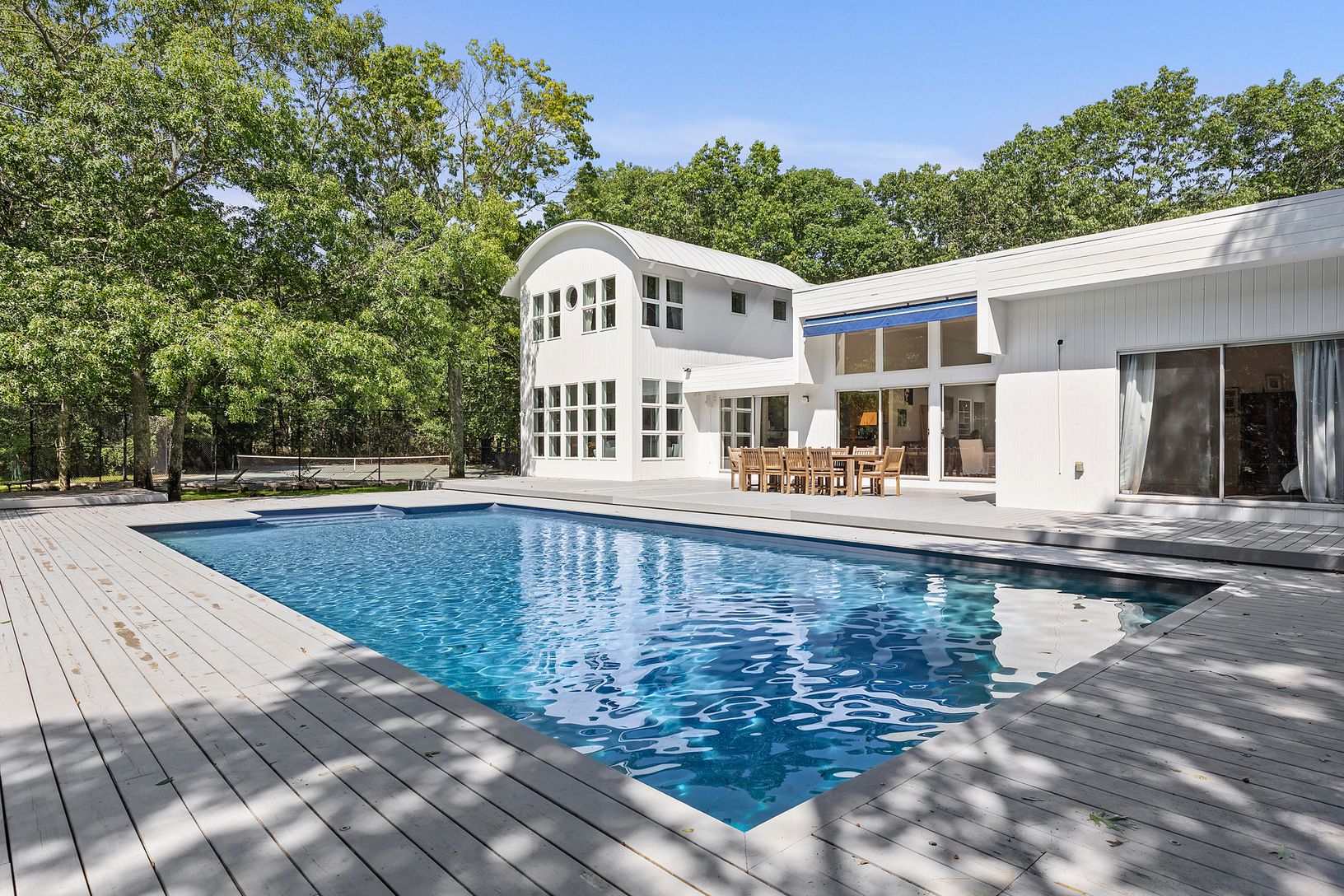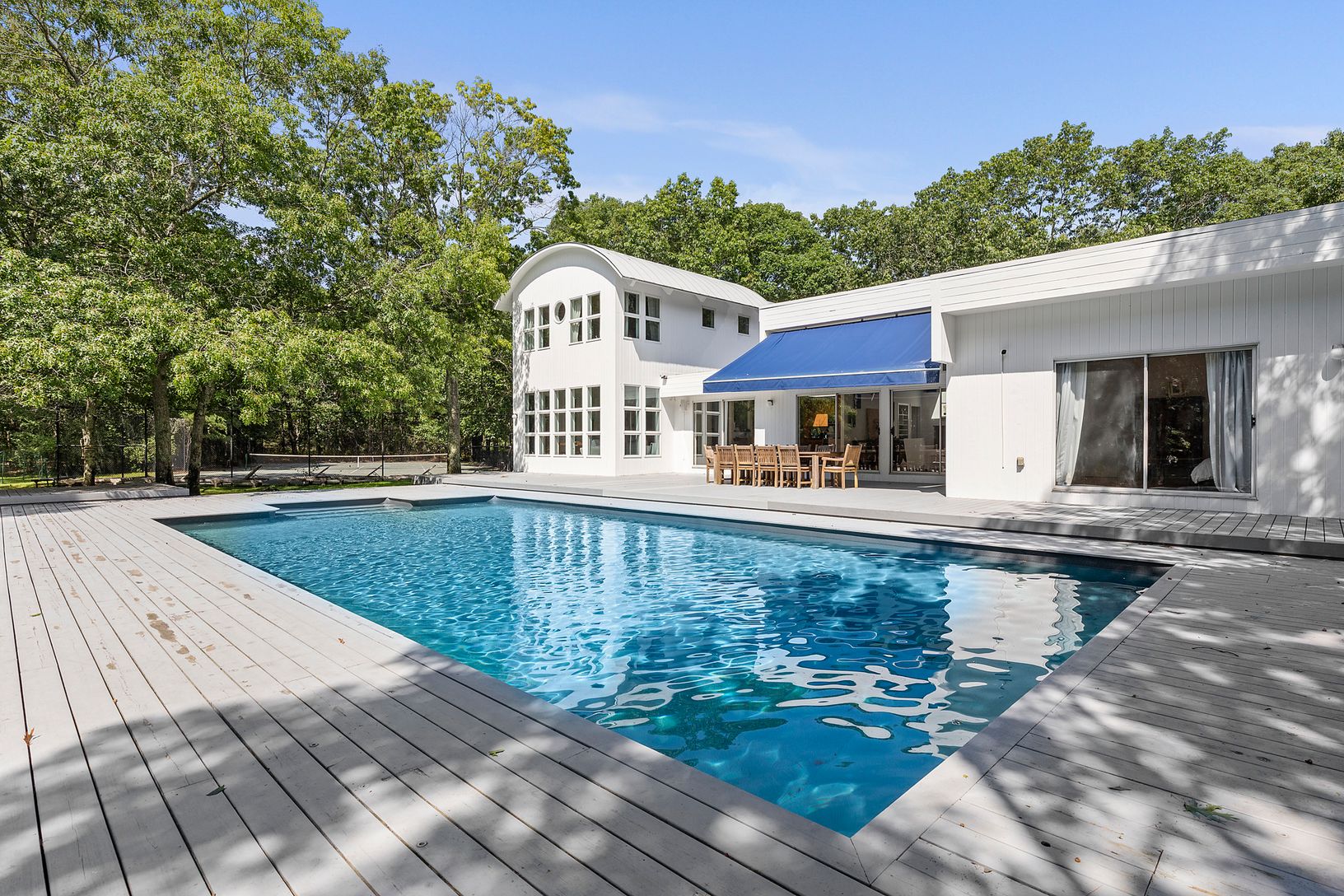 This wonderful Hamptons property is set on 1.8 +/- secluded acres offering the perfect retreat. The 5 bedroom contemporary is filled with light including a living room with soaring ceilings and fireplace, a large dining room with a wall of windows with views out to the expansive lawn. An open stainless and granite kitchen with two dishwashers, a wine cooler, and a breakfast bar is perfect for entertaining. A junior master suite, three additi