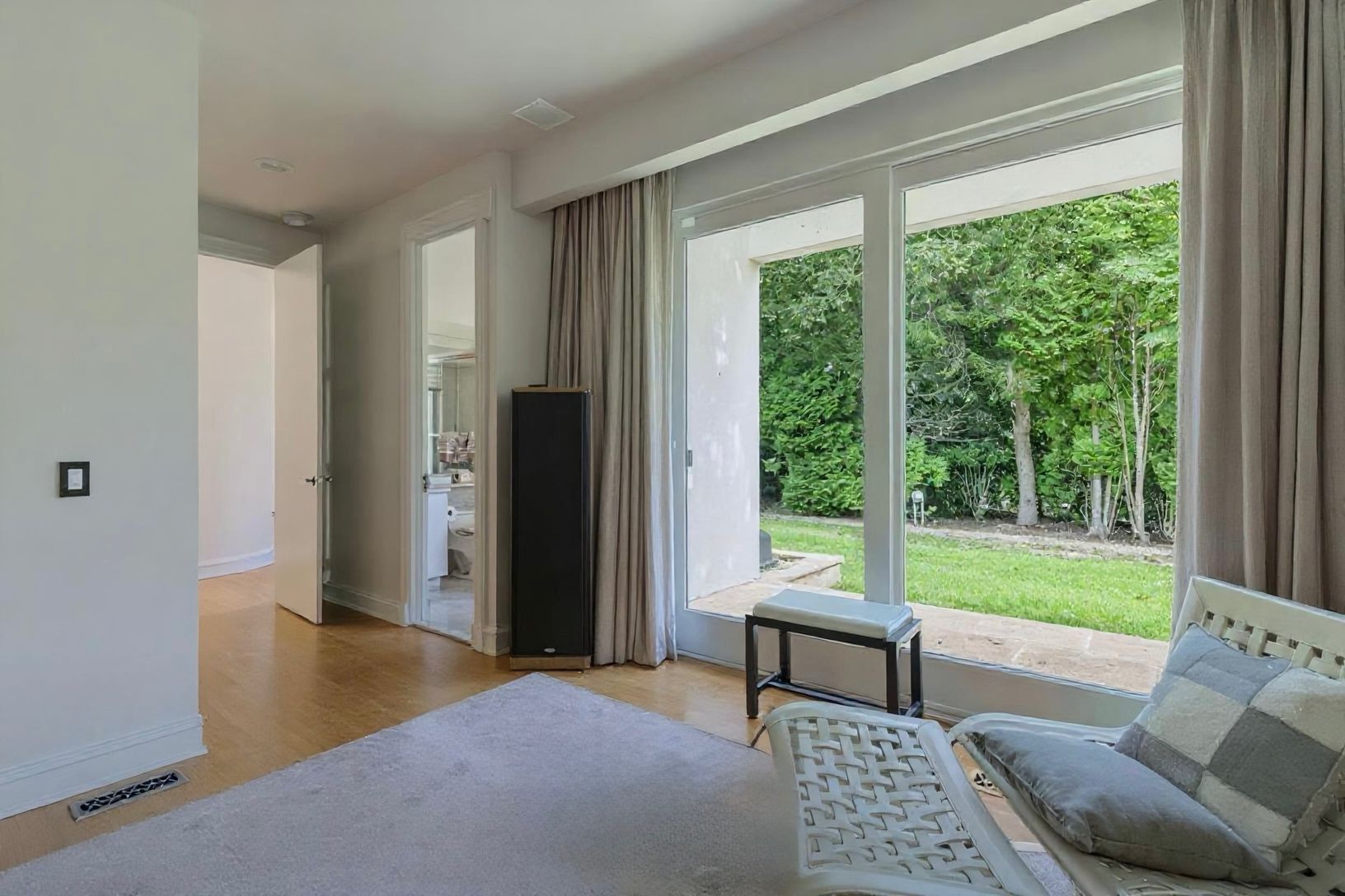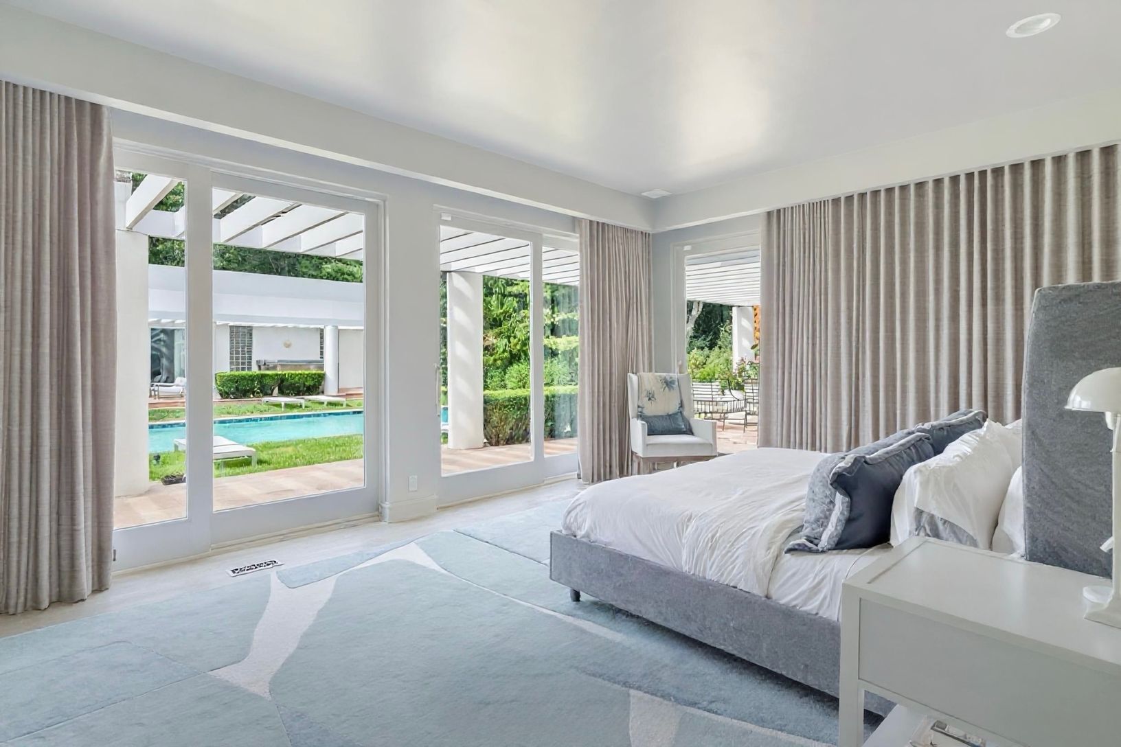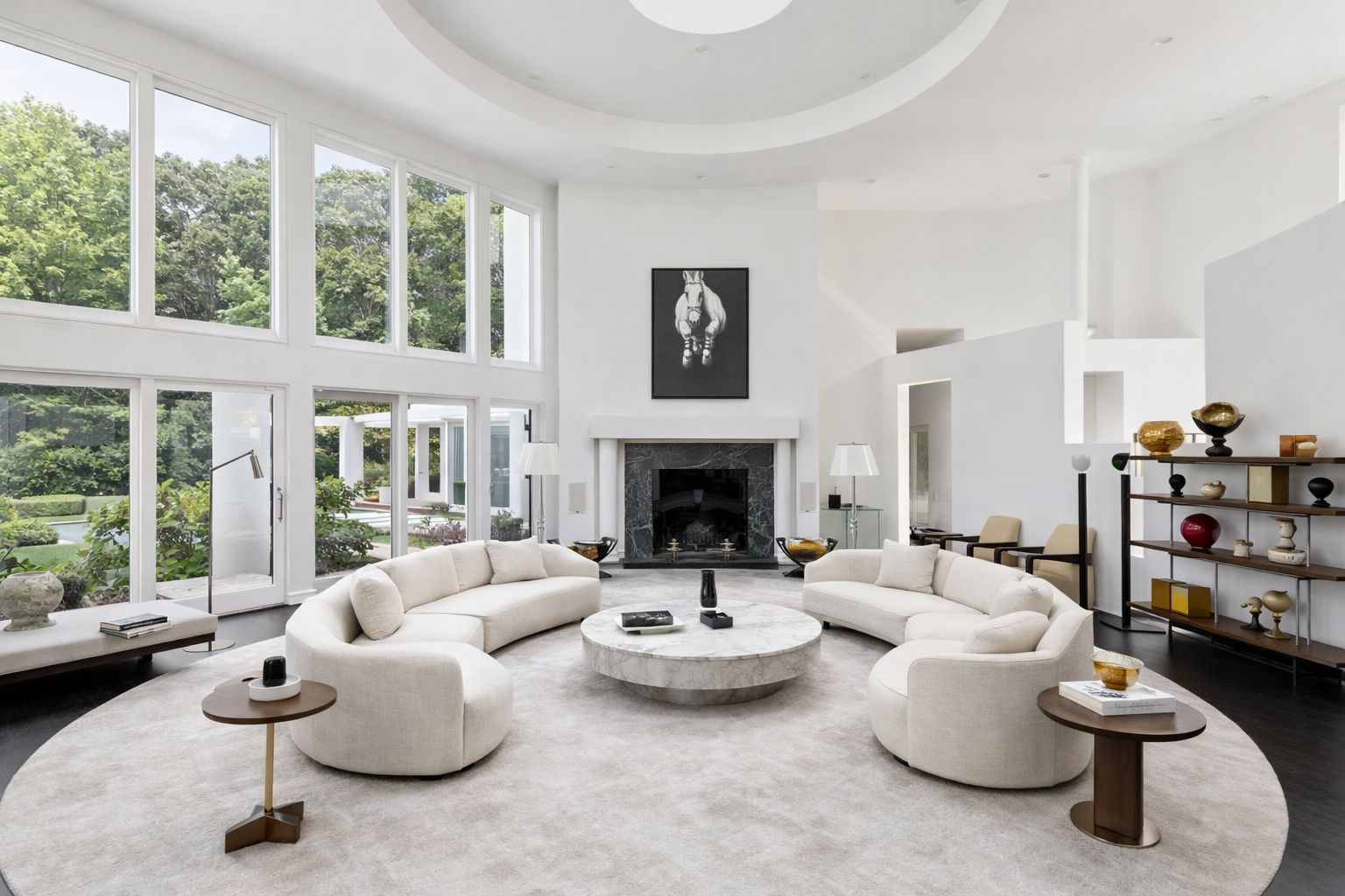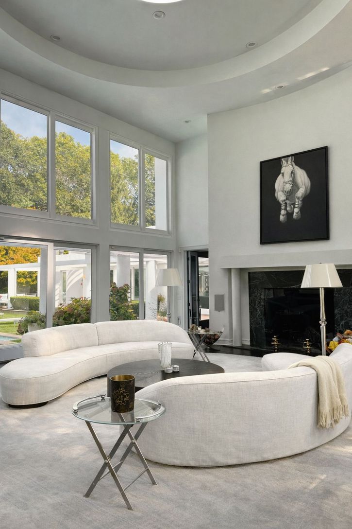 Designed with art in mind, this residence offers expansive interior walls ideal for displaying significant works, along with a series of thoughtfully scaled nooks and apses suited for sculpture. Generous outdoor areas extend the gallery experience, while the architecture itself makes a statement. Arrival is defined by a curved white stucco entry wall-clean, sculptural, and quietly dramatic-mirroring the home's flowing geometry and setting the