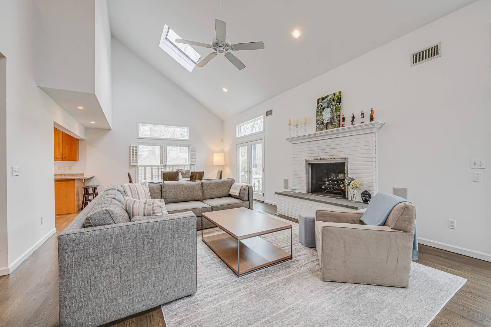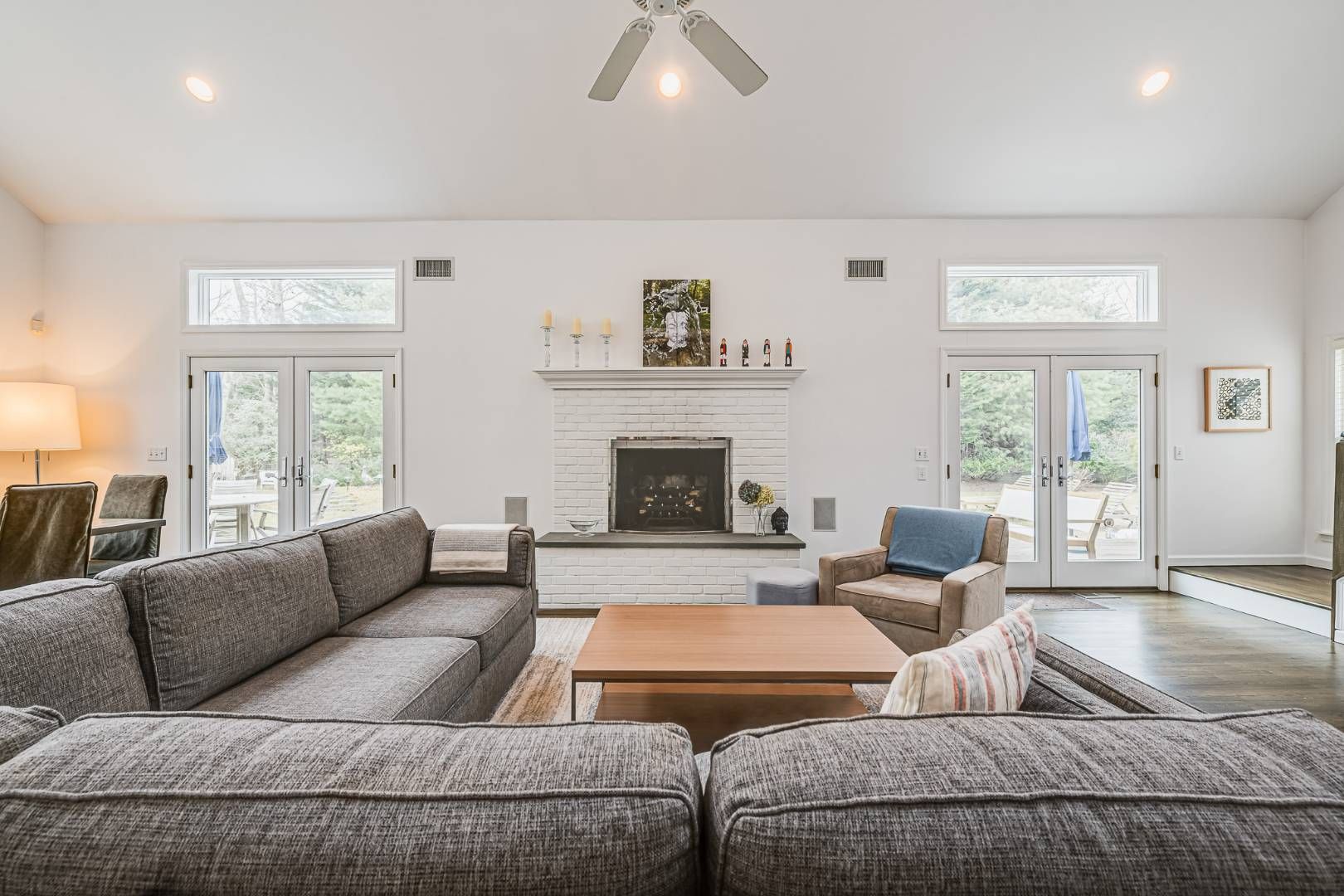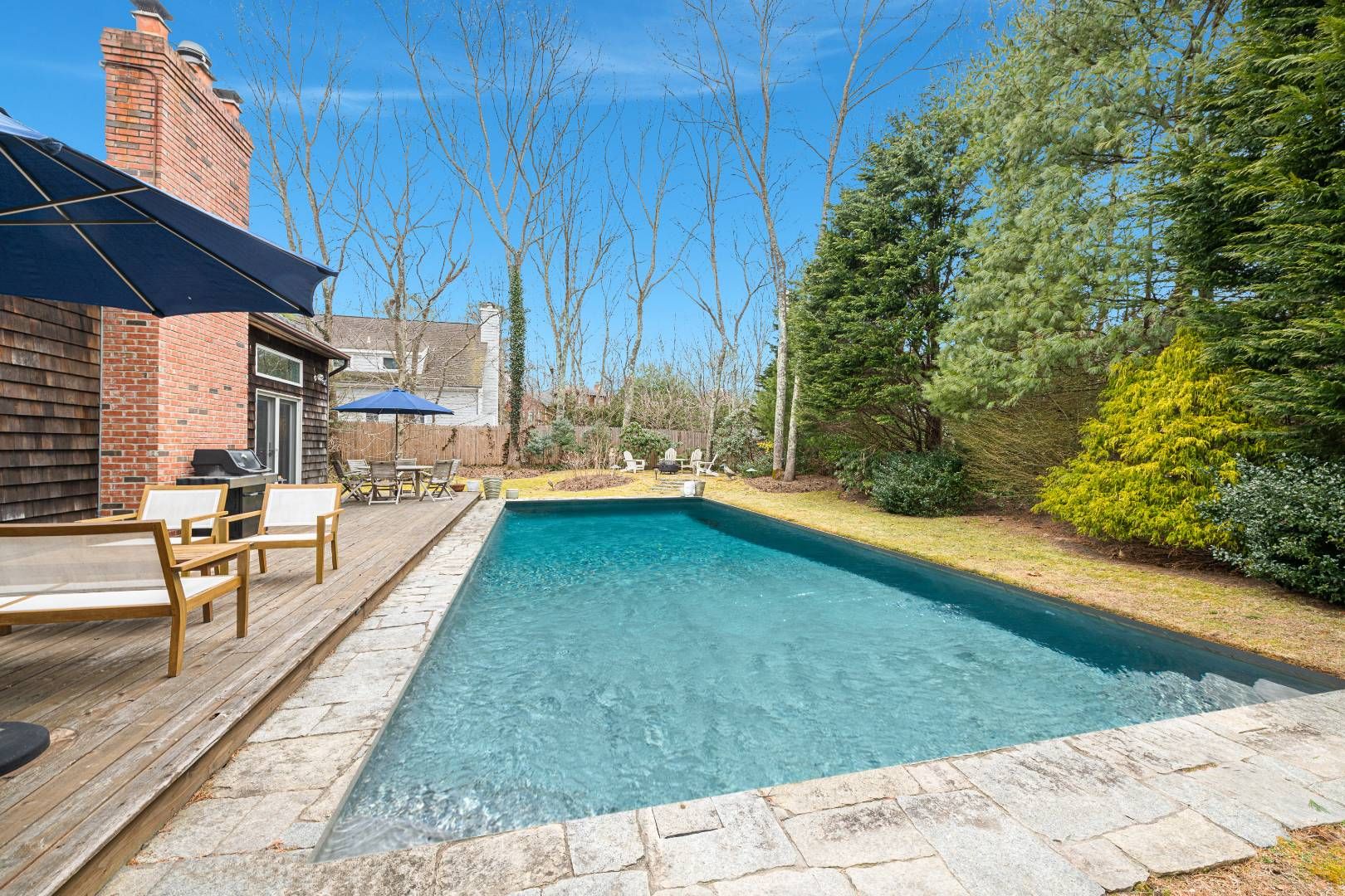 Located in East Hampton's near Northwest Woods on over a third of an acre, this well-cared for three bedroom, three and one half bath transitional style salt-box home with verdant yard and heated pool is turn-key and ready for you. Flooded with natural light from skylights in its vaulted ceiling, the gracious living room is this home's heart, and the warmth it exudes is immediately felt after entering through the front door. Features of this c