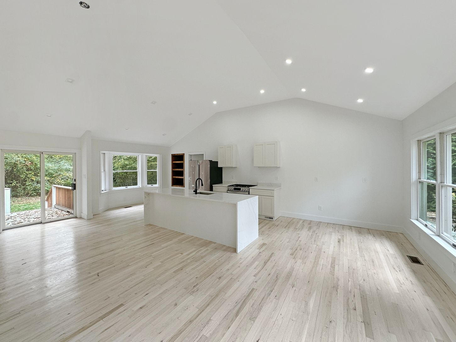 Beautifully reimagined for 2025, this stylish ranch home offers the perfect blend of Hamptons charm and modern design. The open and sun-filled living room features cathedral ceilings, skylights, and refinished hardwood floors that flow seamlessly throughout. The designer kitchen boasts a spacious center island, sleek finishes, and modern applian
