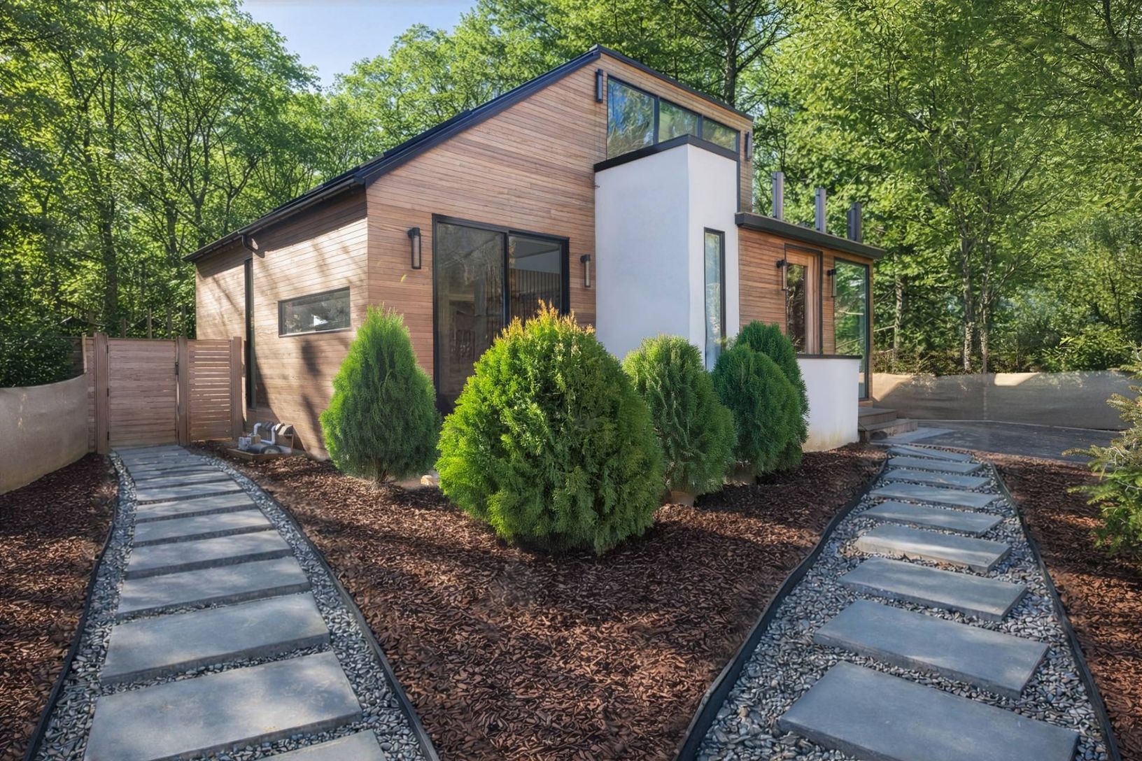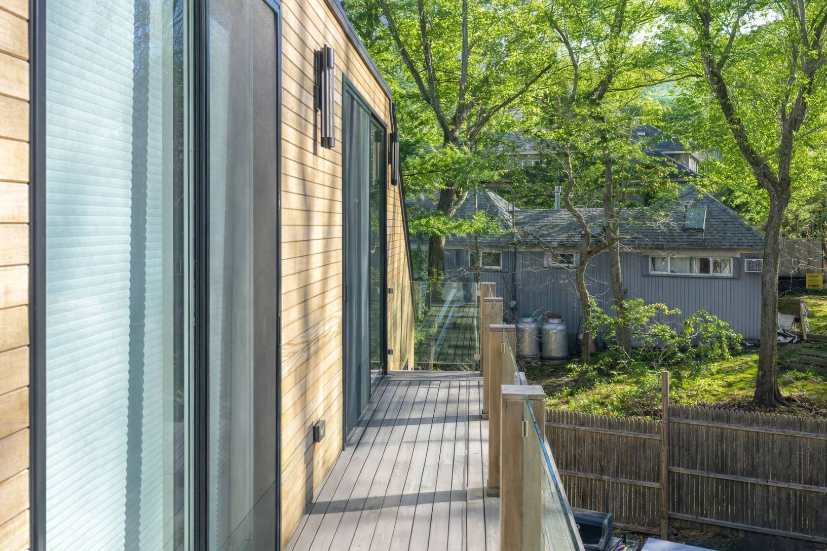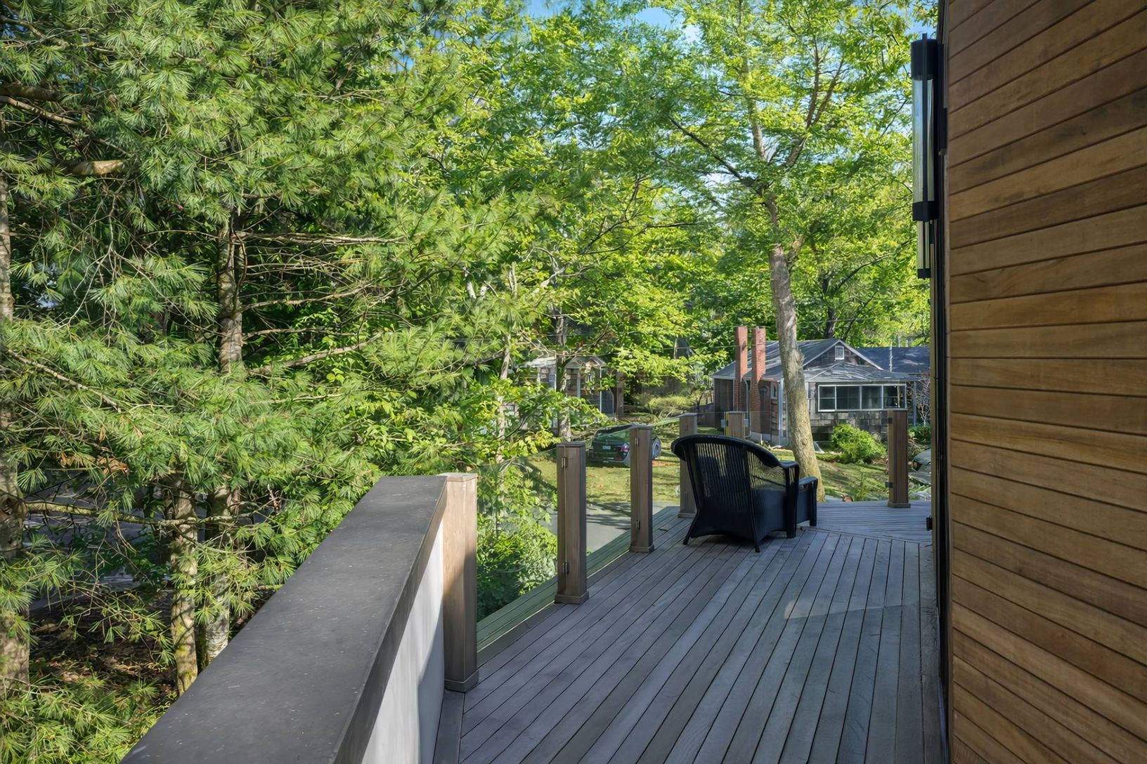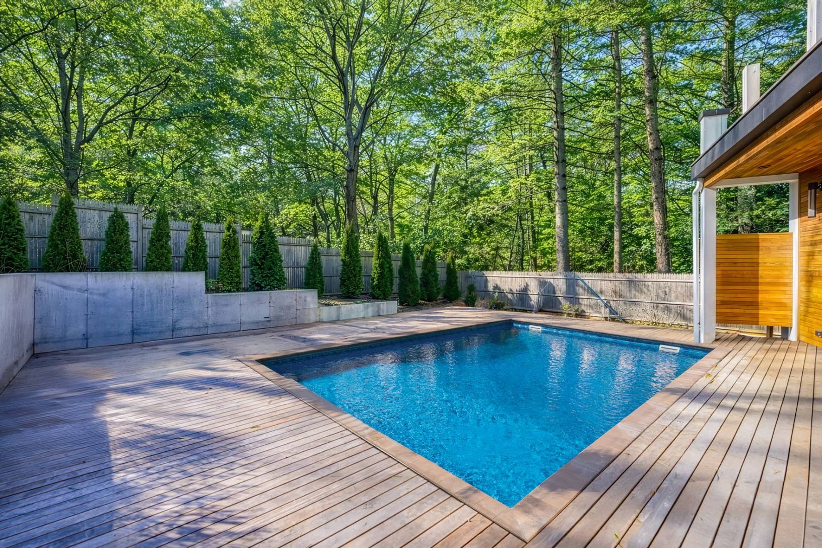 Experience luxury beachside living at 12 Maidstone Park Road, East Hampton. Just a couple blocks to the beach, this stunning three-bedroom, three-and-a-half-bath home is designed for seamless indoor-outdoor living. Brazilian tiger wood siding and tropical hardwood Brazilian grappa decks set the tone for this modern retreat. Nine-foot glass sliding doors open to a heated pool, complemented by an outdoor dining area, fire pit, and storage for bi