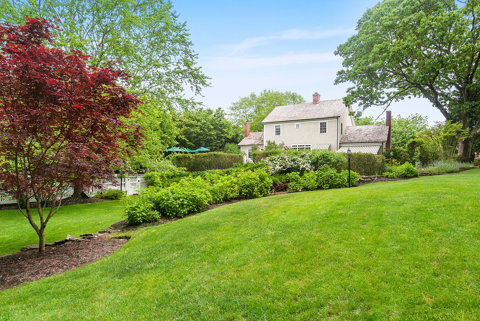 Nestled on a small village street and only a handful of homes wrap around a tranquil village green. Beautiful 4 bedroom Traditional with lovely floor plan, details include cedar roof, copper gutters and leaders, exquisite moldings. Step in to a gracious foyer, living room with fireplace, sun room with brick flooring, fireplace and French doors, brand new chefs kitchen, first floor master with fireplace, second floor master plus two guest bedro