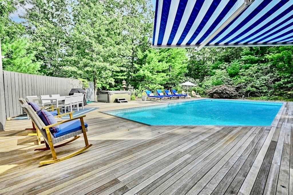 This wonderful sunlit contemporary with 3 bedrooms and 2 full baths sits close to both East Hampton and Sag Harbor Village. An open airy living, kitchen and dining area lead through sliders to a heated pool, hot tub, and expansive decking for eating, grilling, and lounging. An awning off the back makes for a perfect shady retreat on sunny and hot summer days. Bonus! A lovely outdoor shower and state of the art gym. This lovely one level home w