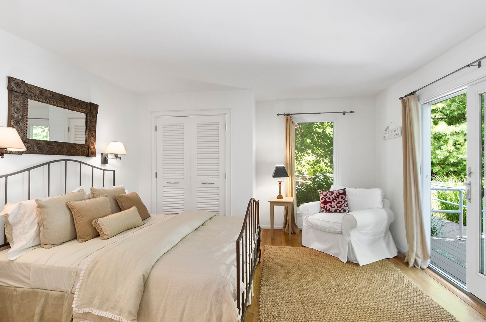 This turn-key 3 bedroom, 2.5 bath house is on 1.06 acres located near East Hamptons top marinas.The very private end of the cul-de-sac location is a nicely elevated lot and landscaped beautifully. The first floor features a complete open layout with three sliding glass doors leading out to the expansive decking. The kitchen is fully loaded with all top of the line Viking appliances and Waterworks fixtures.The first floor master bedroom opens t