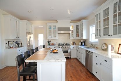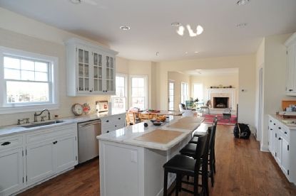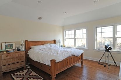 This "newer" Post Modern is on a very quiet cul-de-sac of new homes, perfect for a main residence or vacation home. The tasteful 4-5 bedroom home boasts an oversized living/dining room with cathedral ceilings, a kitchen with custom white cabinetry and Carrera countertops and a family room with fireplace overlooking the back yard and pool. Oversized light-filled windows, attractive wainscoting and trim work and custom marble in every bathroom