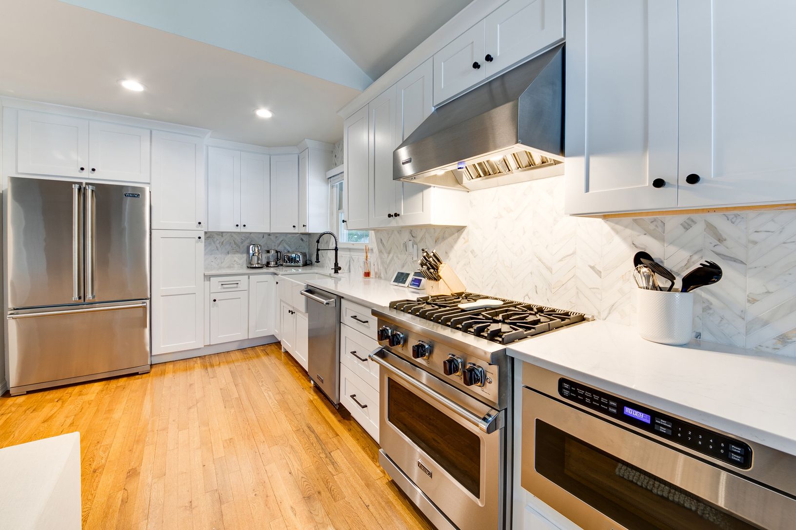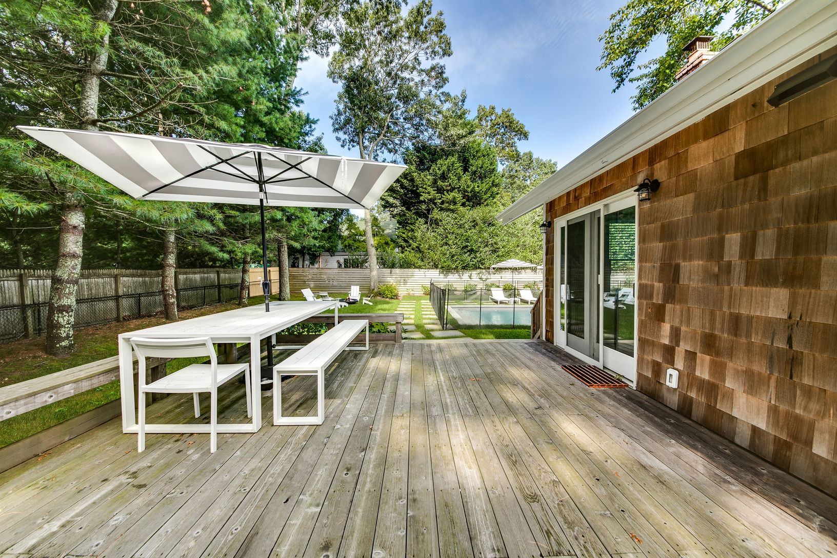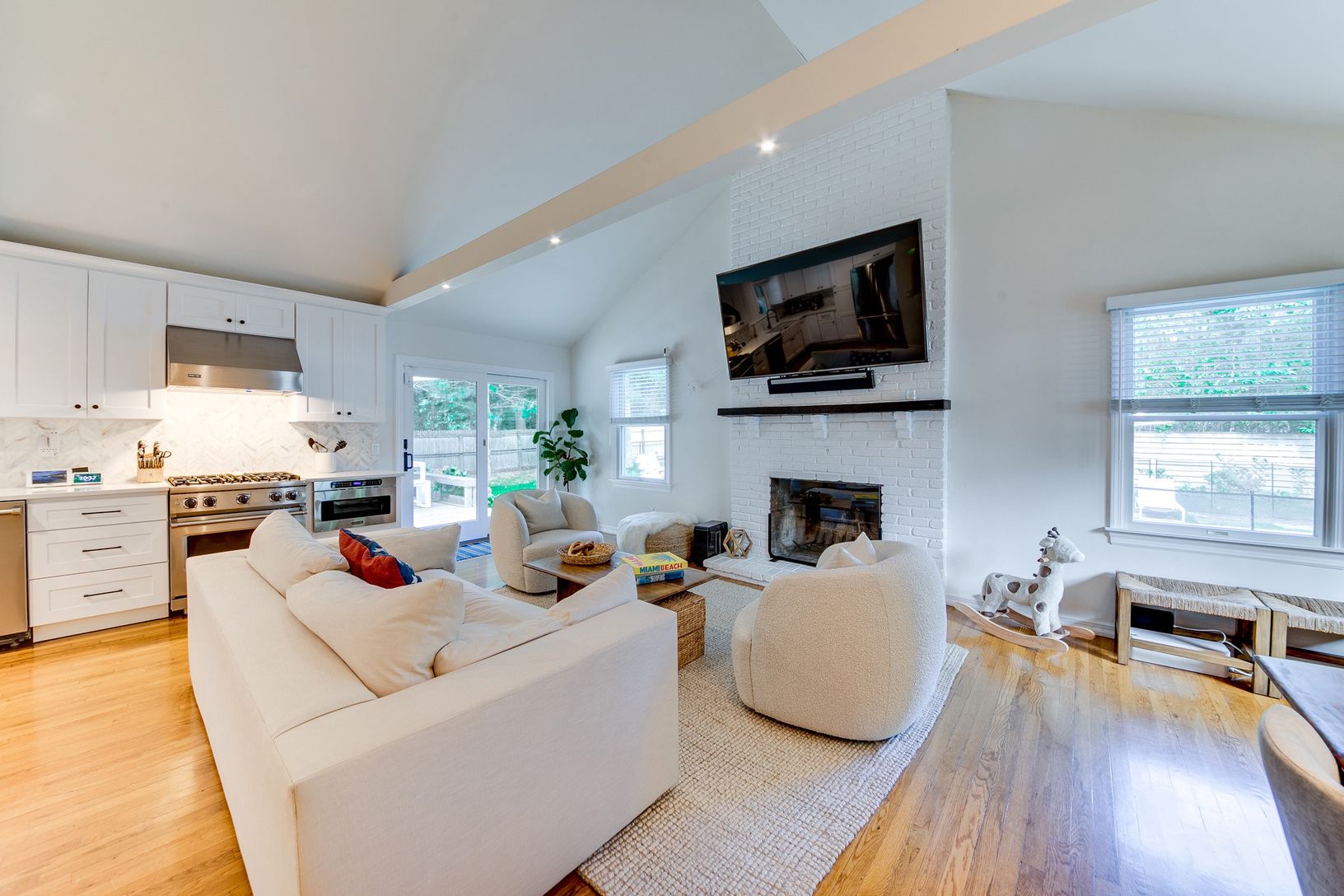 Nestled behind a private, gated entry in a peaceful Springs neighborhood, this jewel of a property awaits. The charming cedar-shingled home was beautifully renovated in 2022 and boasts a light and bright aesthetic synonymous with Hamptons living. A spacious open-plan living area features vaulted ceilings and includes a new, custom kitchen with Viking appliances, an adjacent dining area, and a large living space centered around a wood-burning f