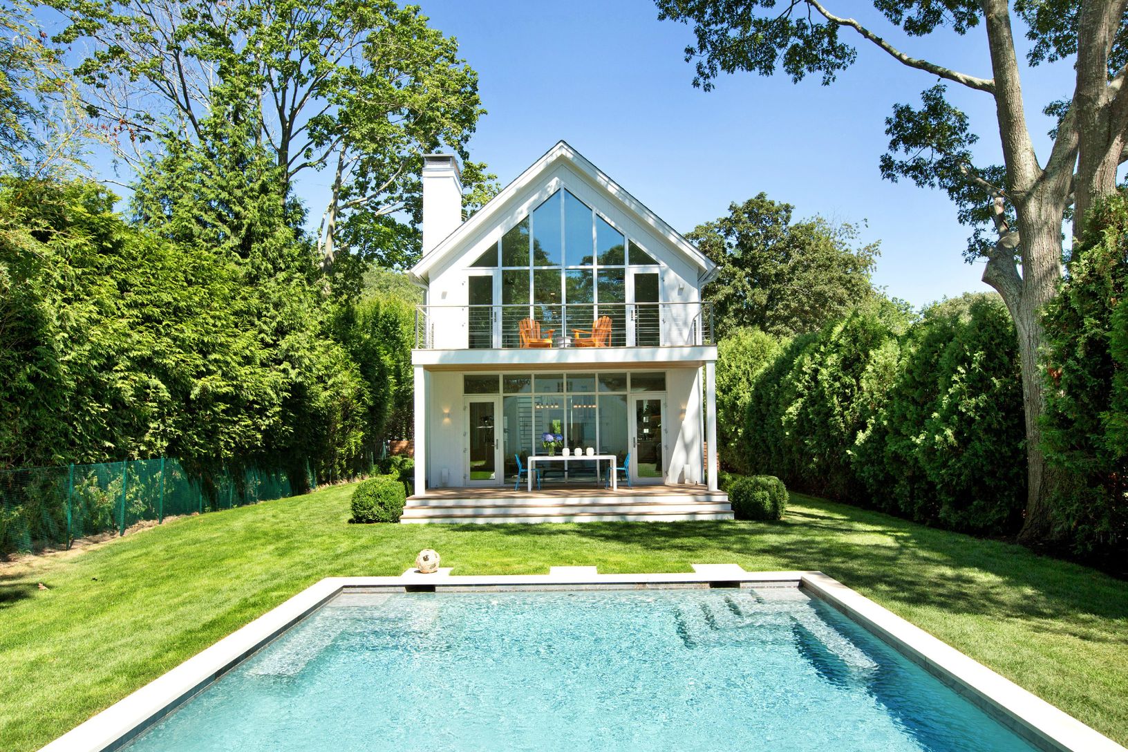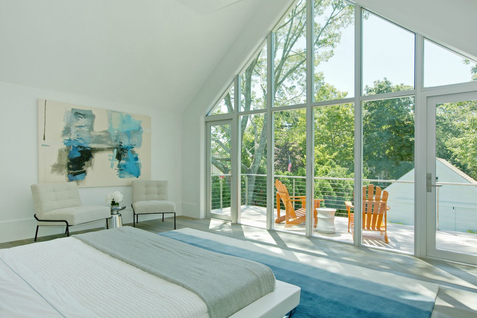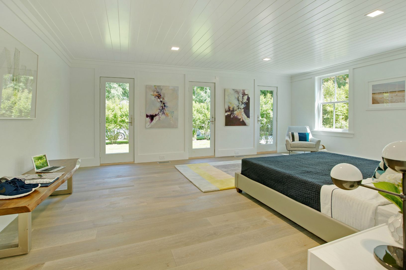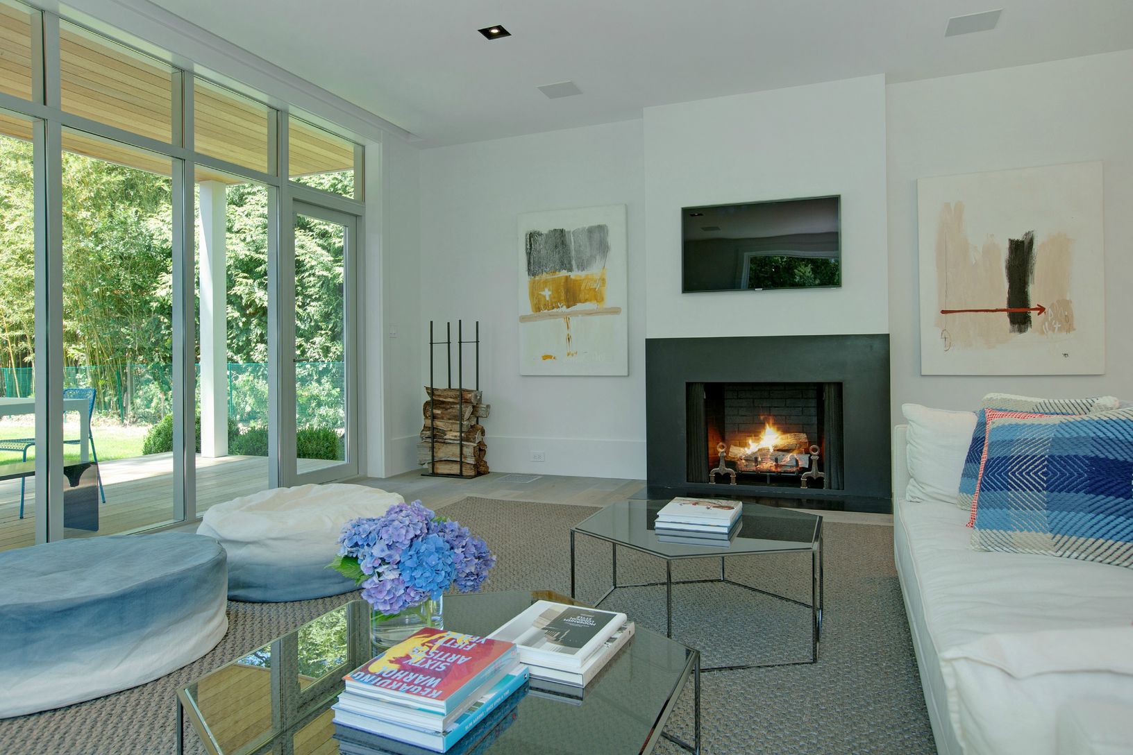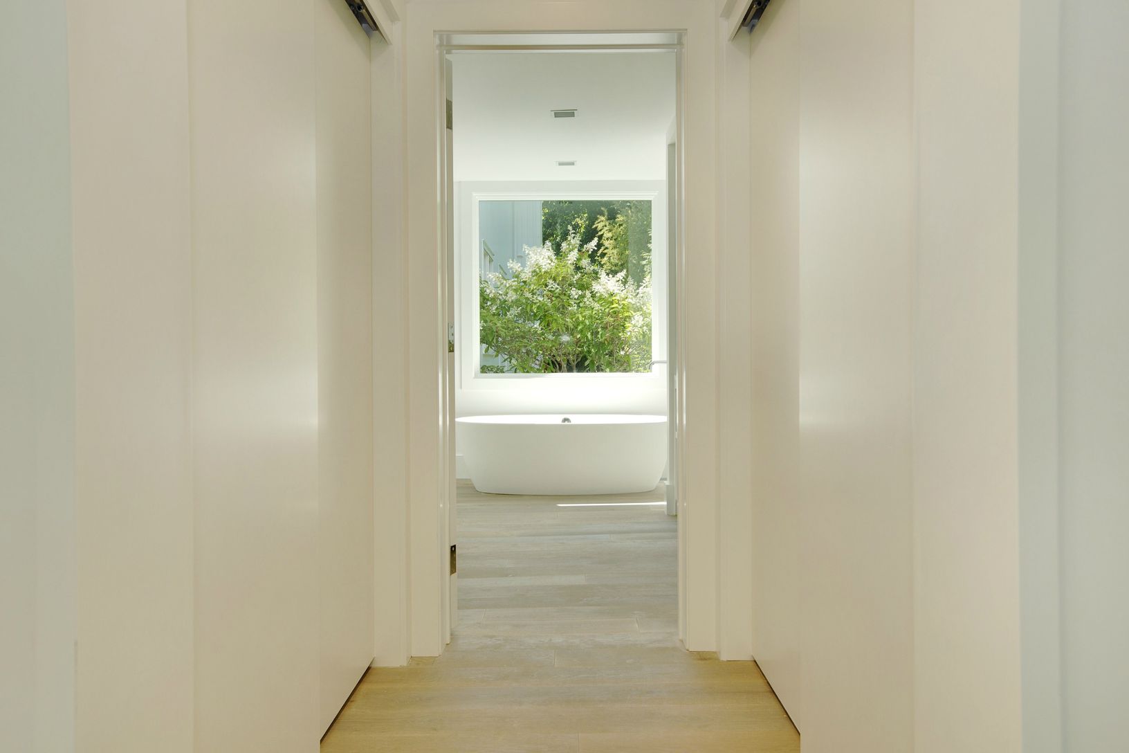 Tucked away on a cul-de-sac in Sag Harbor Village, features a magnificent home created by Premier designer Pembrooke & Ives and architect, David Griffin DGi+d. One enters the house through a two-story glass and steel atrium connecting the two wings. The open living area with 9-foot ceilings, oversized windows and a custom glass and steel curtain wall of windows and doors, lets the outdoors in. Throughout the home are wide plank European oa