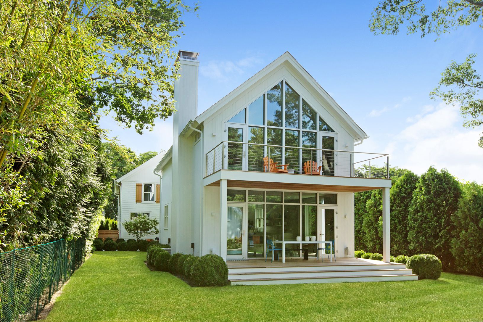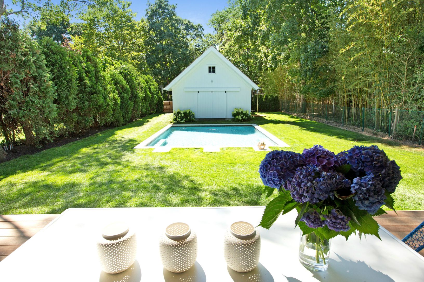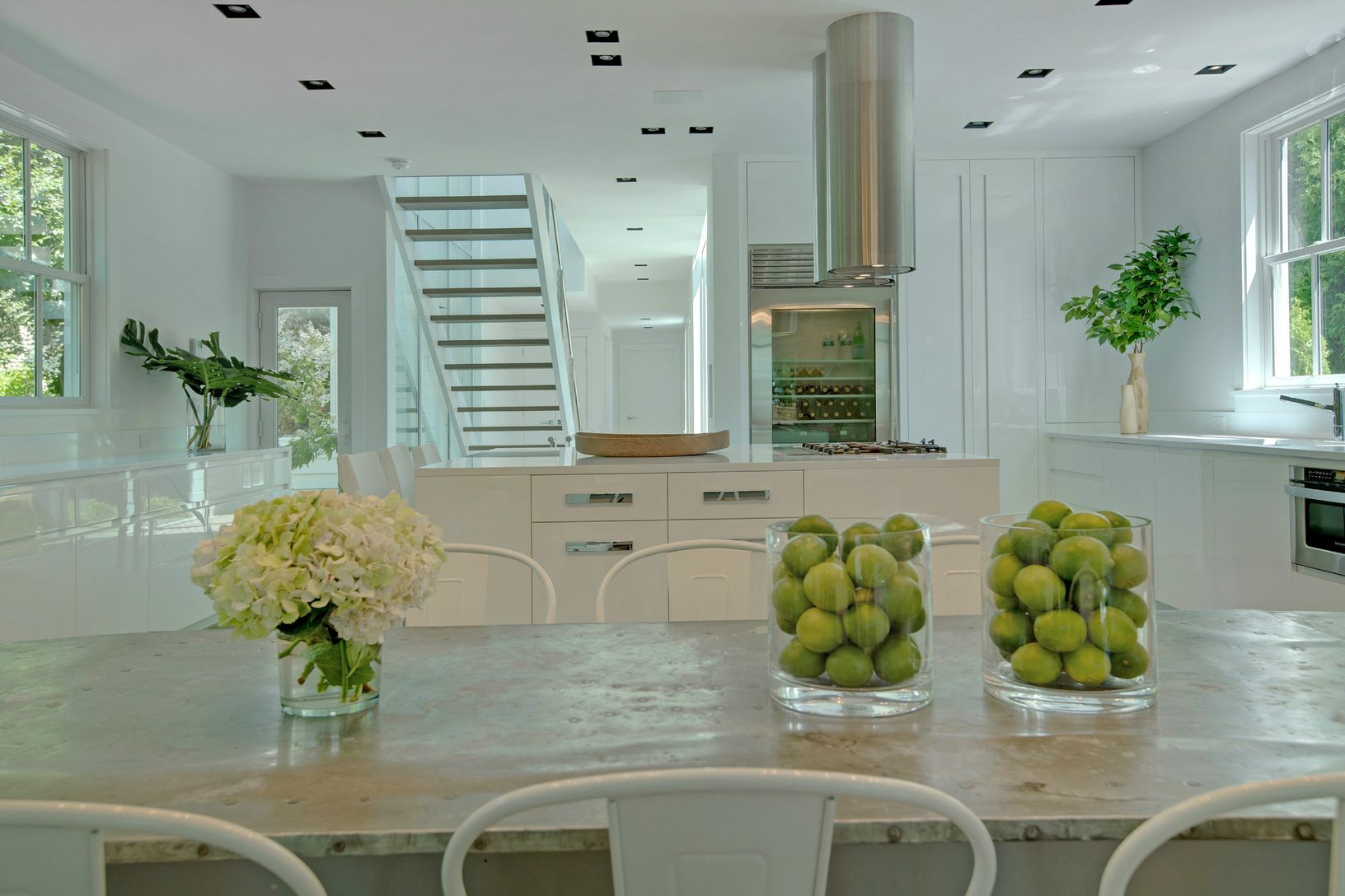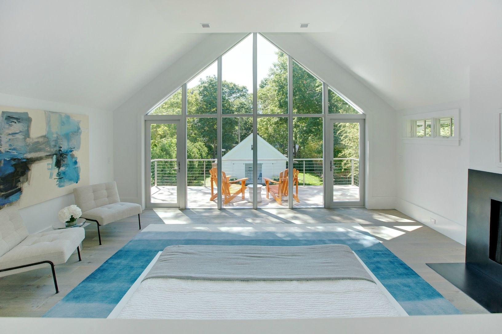 Tucked away on a cul-de-sac in Sag Harbor Village, features a magnificent home created by Premier designer Pembrooke & Ives and architect, David Griffin DGi+d. One enters the house through a two-story glass and steel atrium connecting the two wings. The open living area with 9-foot ceilings, oversized windows and a custom glass and steel curtain wall of windows and doors, lets the outdoors in. Throughout the home are wide plank European oa