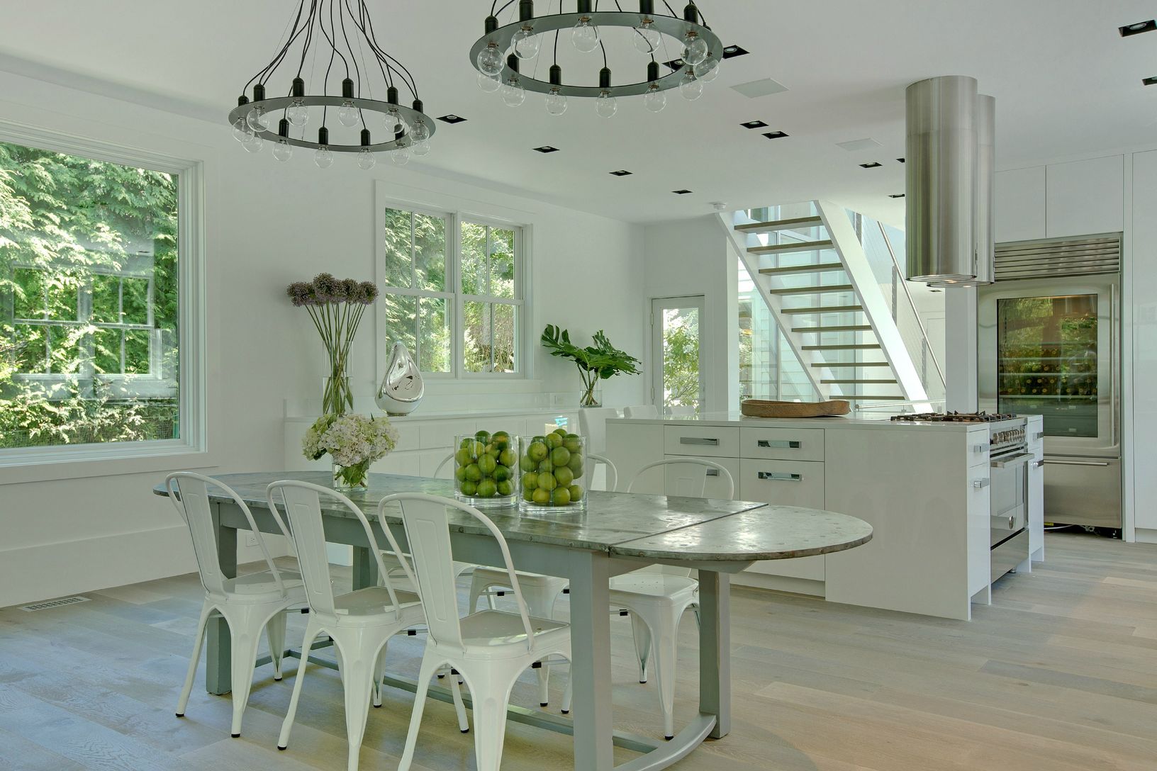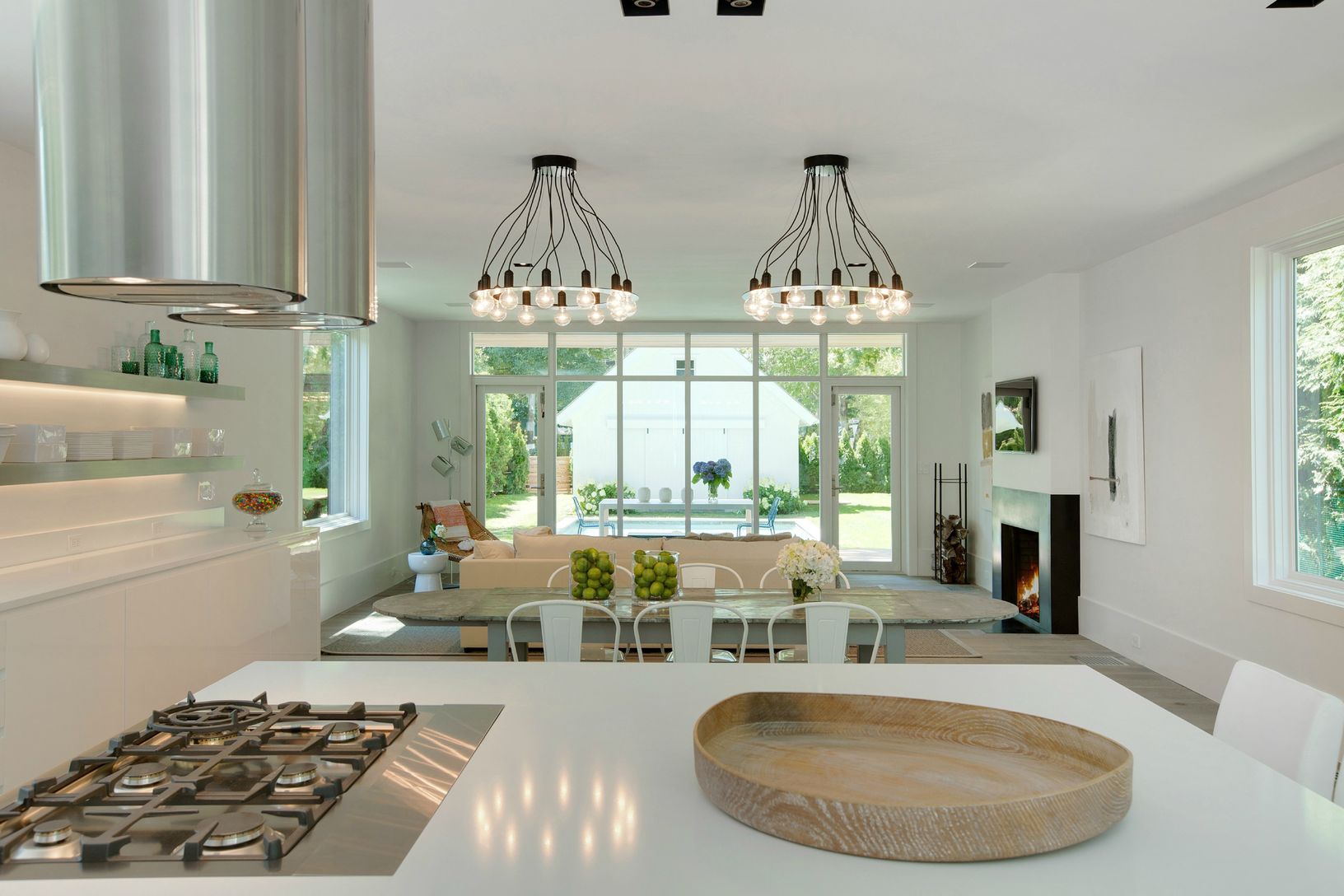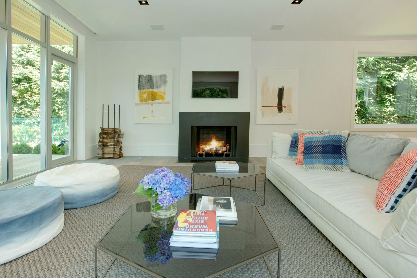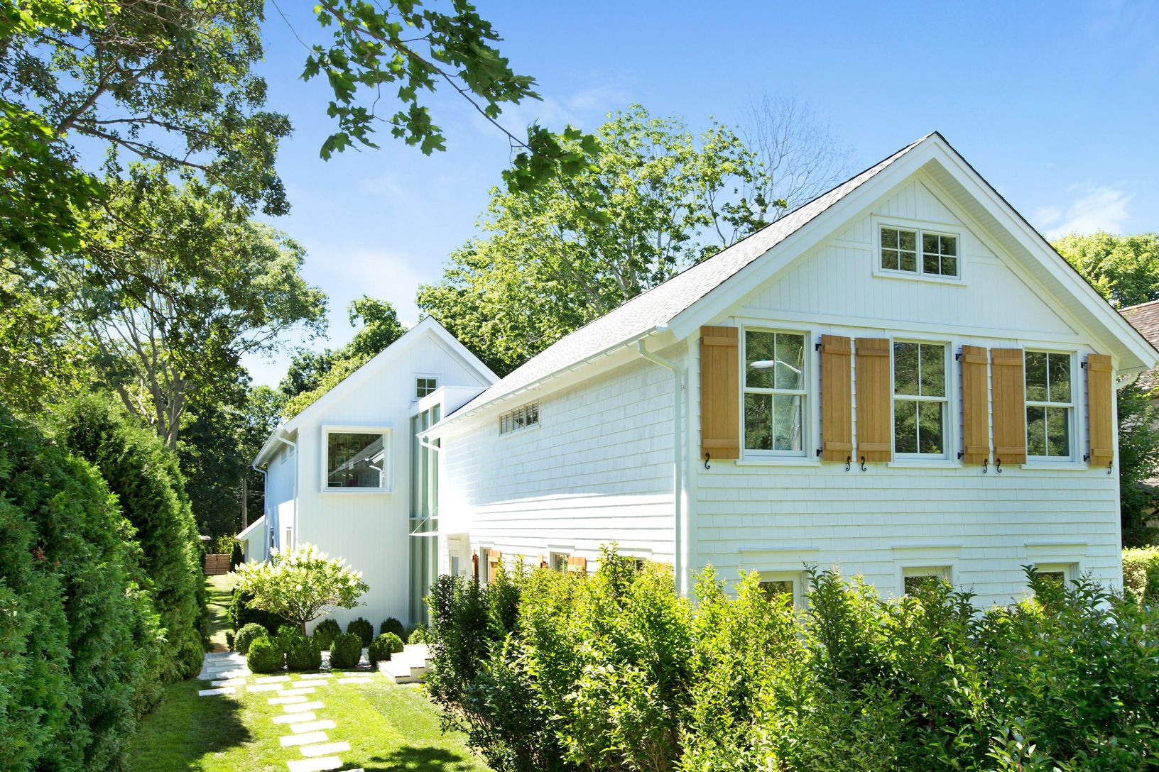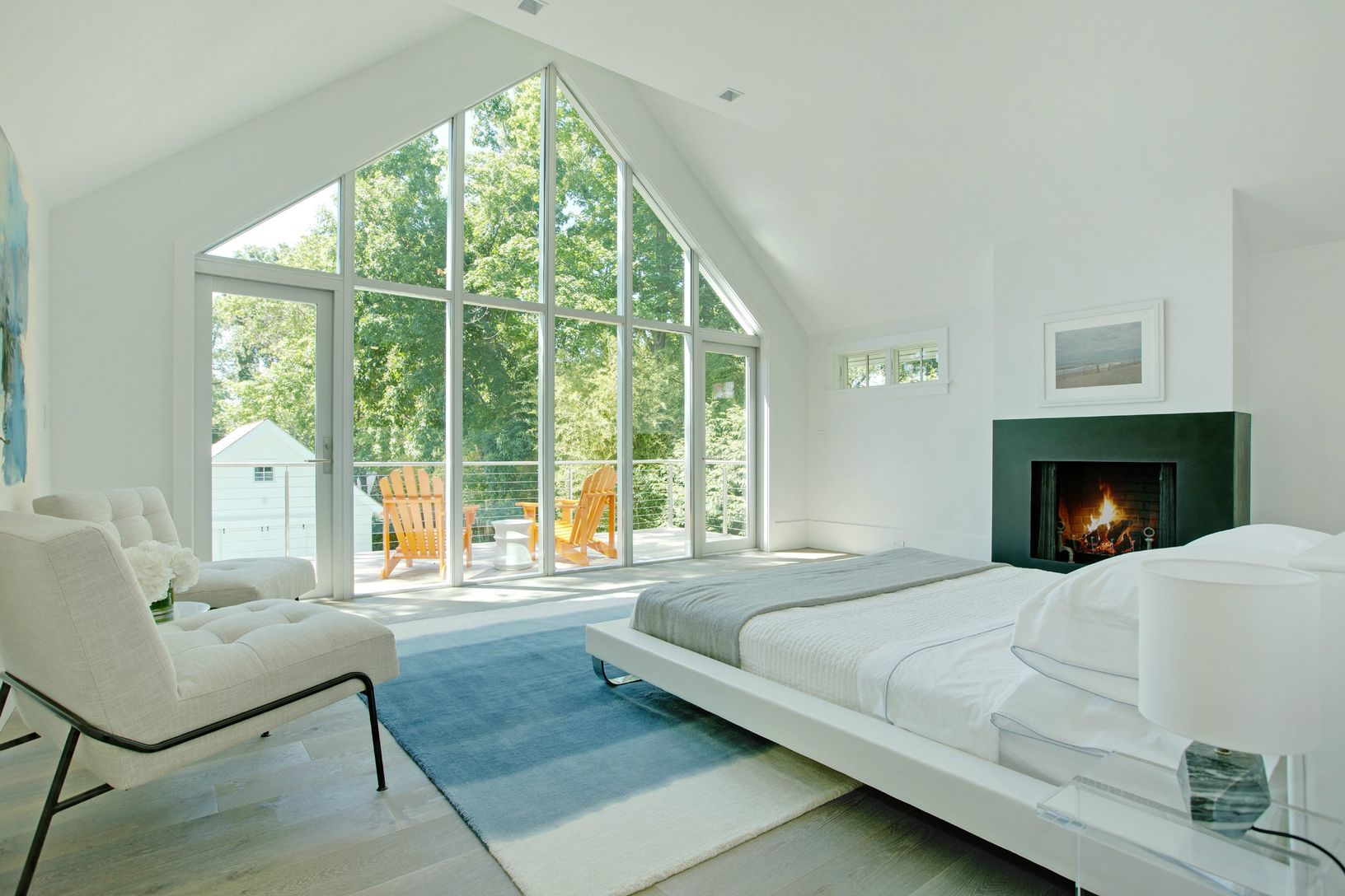 Tucked away on a cul-de-sac in Sag Harbor Village, features a magnificent home created by Premier designer Pembrooke & Ives and architect, David Griffin DGi+d. One enters the house through a two-story glass and steel atrium connecting the two wings. The open living area with 9-foot ceilings, oversized windows and a custom glass and steel curtain wall of windows and doors, lets the outdoors in. Throughout the home are wide plank European oa