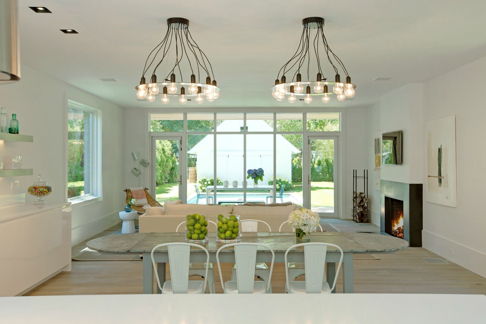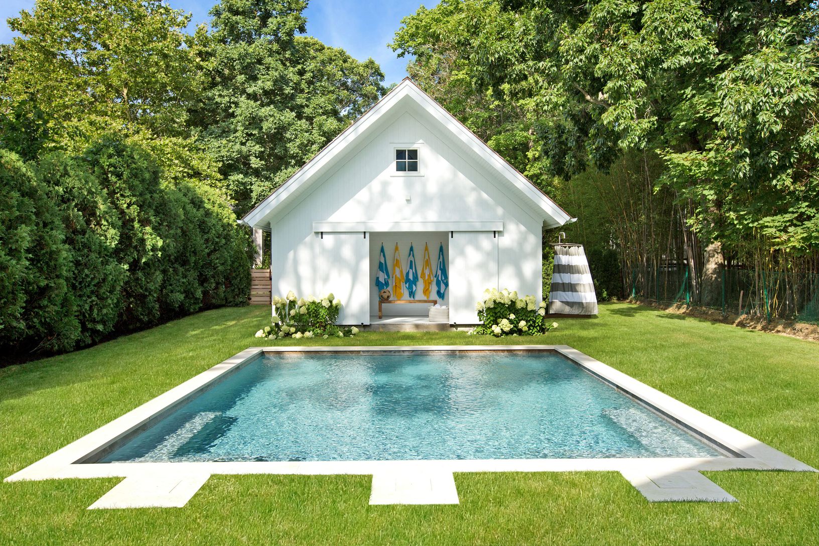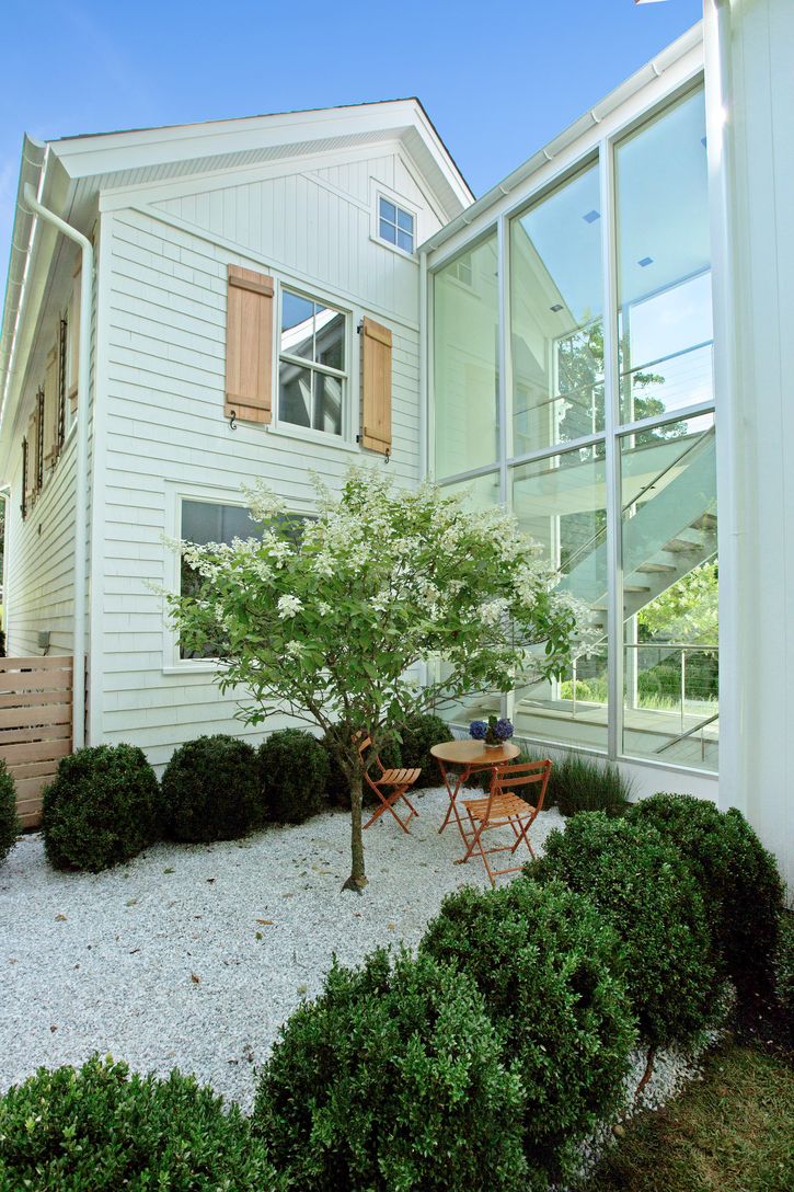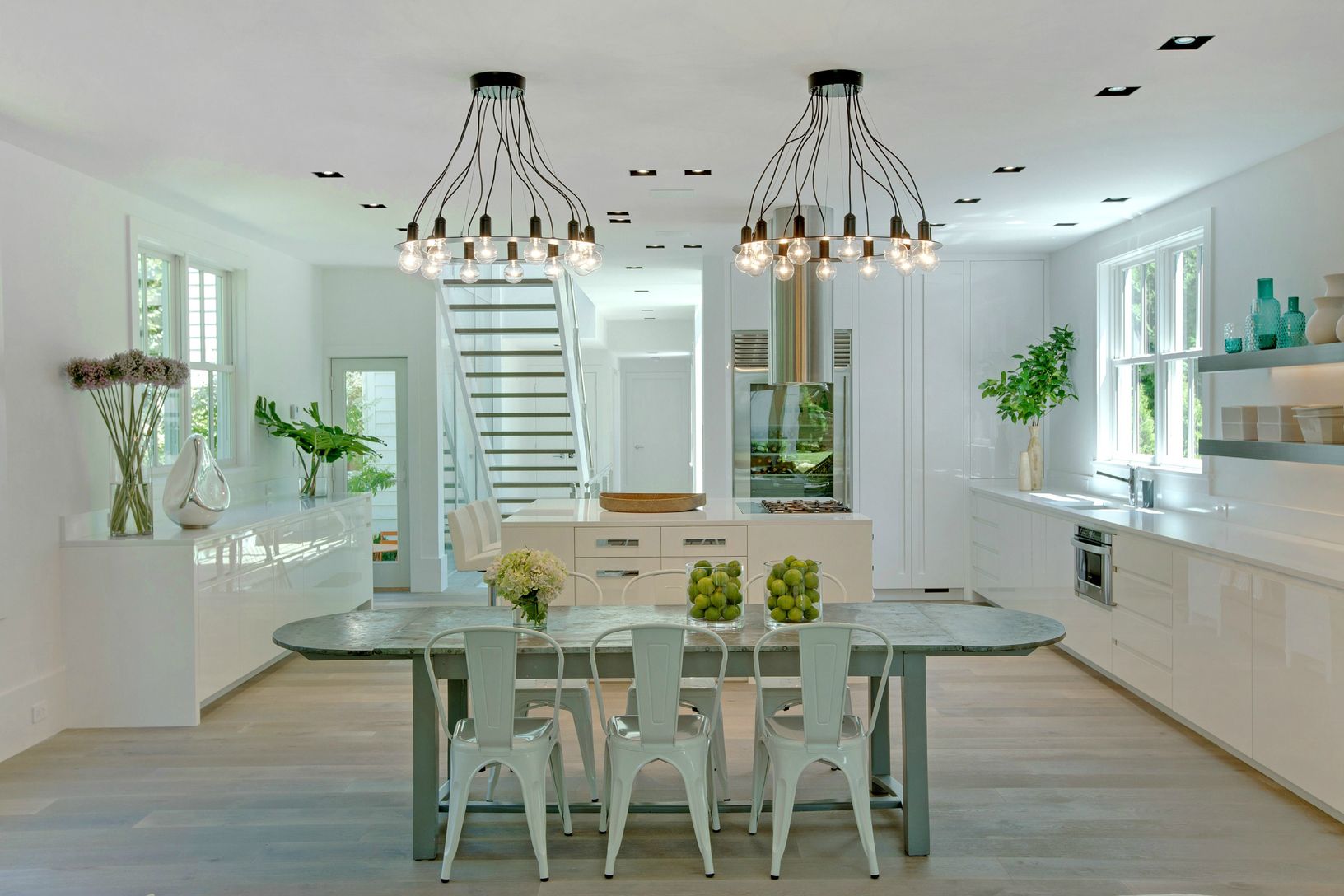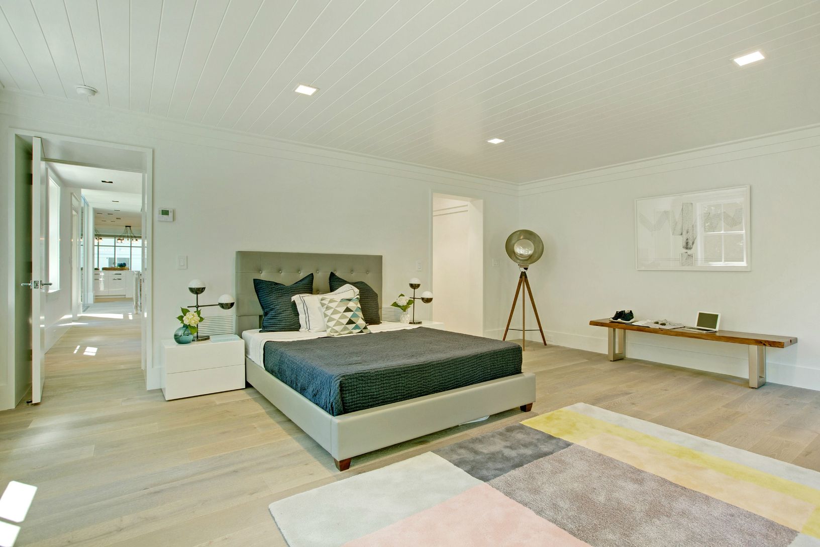 Tucked away on a cul-de-sac in Sag Harbor Village, features a magnificent home created by Premier designer Pembrooke & Ives and architect, David Griffin DGi+d. One enters the house through a two-story glass and steel atrium connecting the two wings. The open living area with 9-foot ceilings, oversized windows and a custom glass and steel curtain wall of windows and doors, lets the outdoors in. Throughout the home are wide plank European oa