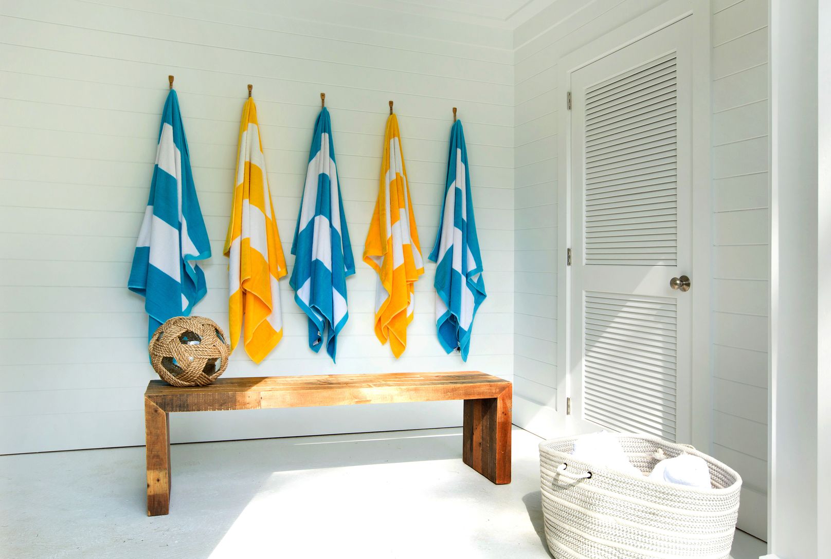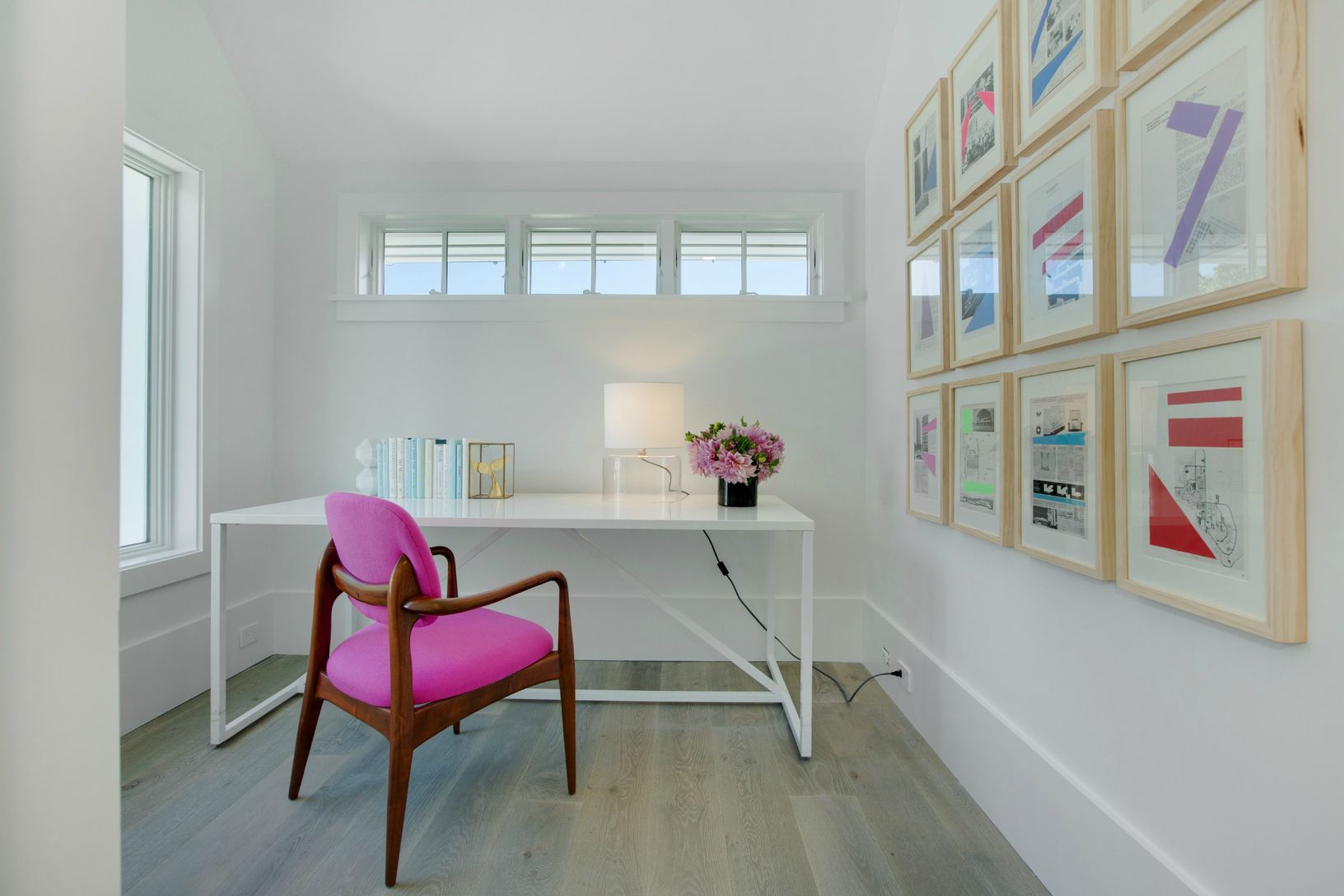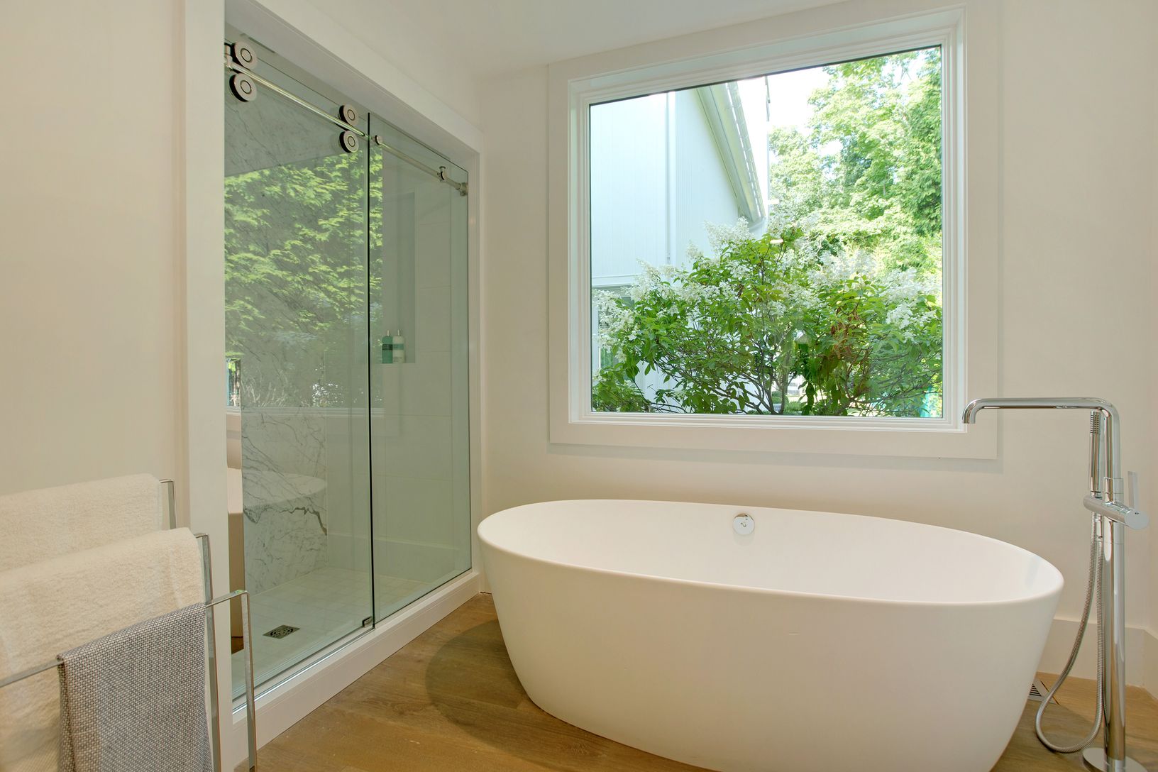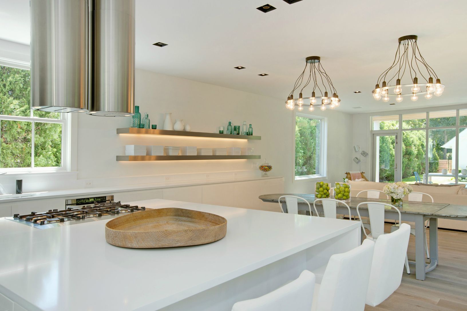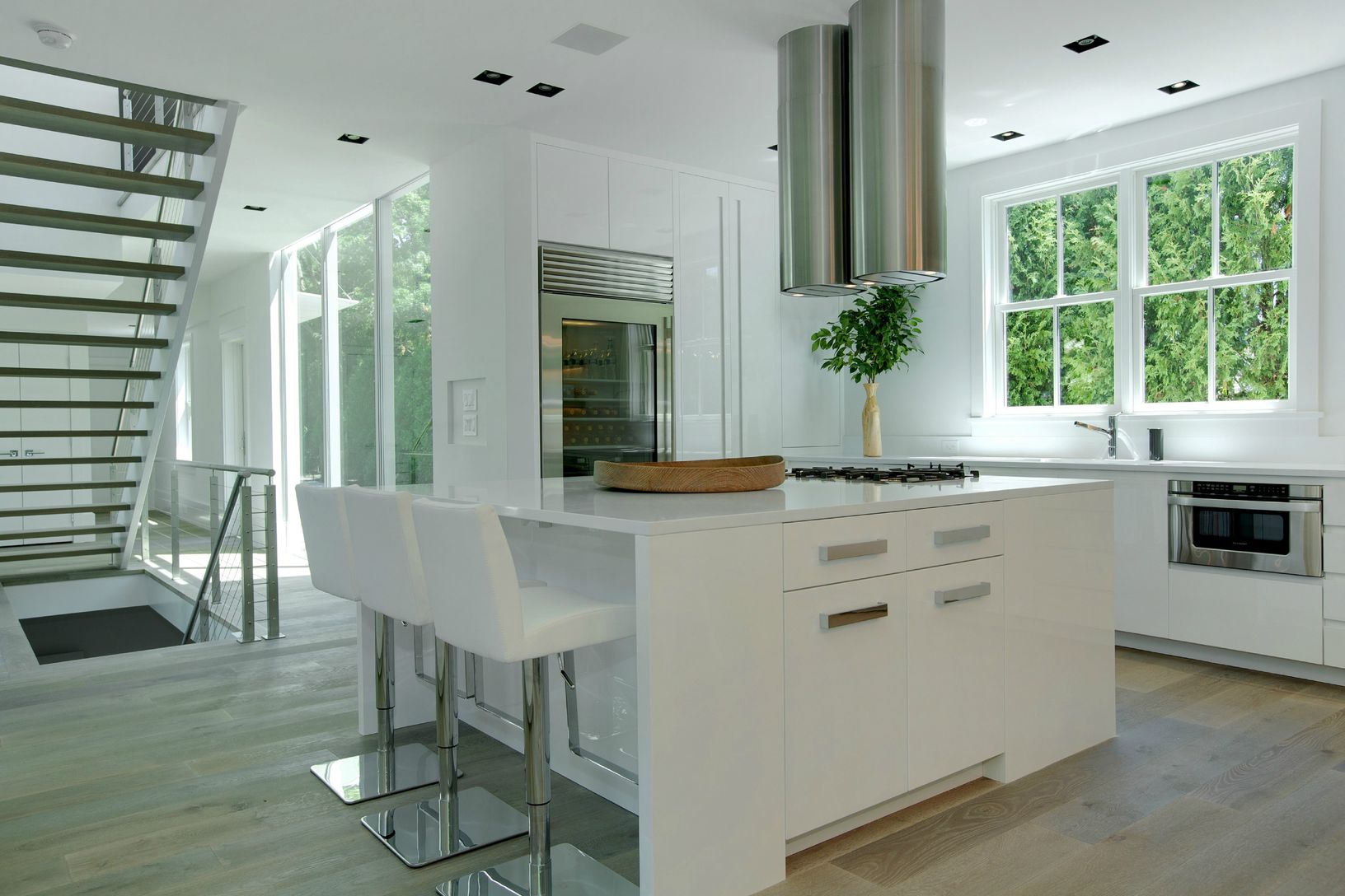 Tucked away on a cul-de-sac in Sag Harbor Village, features a magnificent home created by Premier designer Pembrooke & Ives and architect, David Griffin DGi+d. One enters the house through a two-story glass and steel atrium connecting the two wings. The open living area with 9-foot ceilings, oversized windows and a custom glass and steel curtain wall of windows and doors, lets the outdoors in. Throughout the home are wide plank European oa