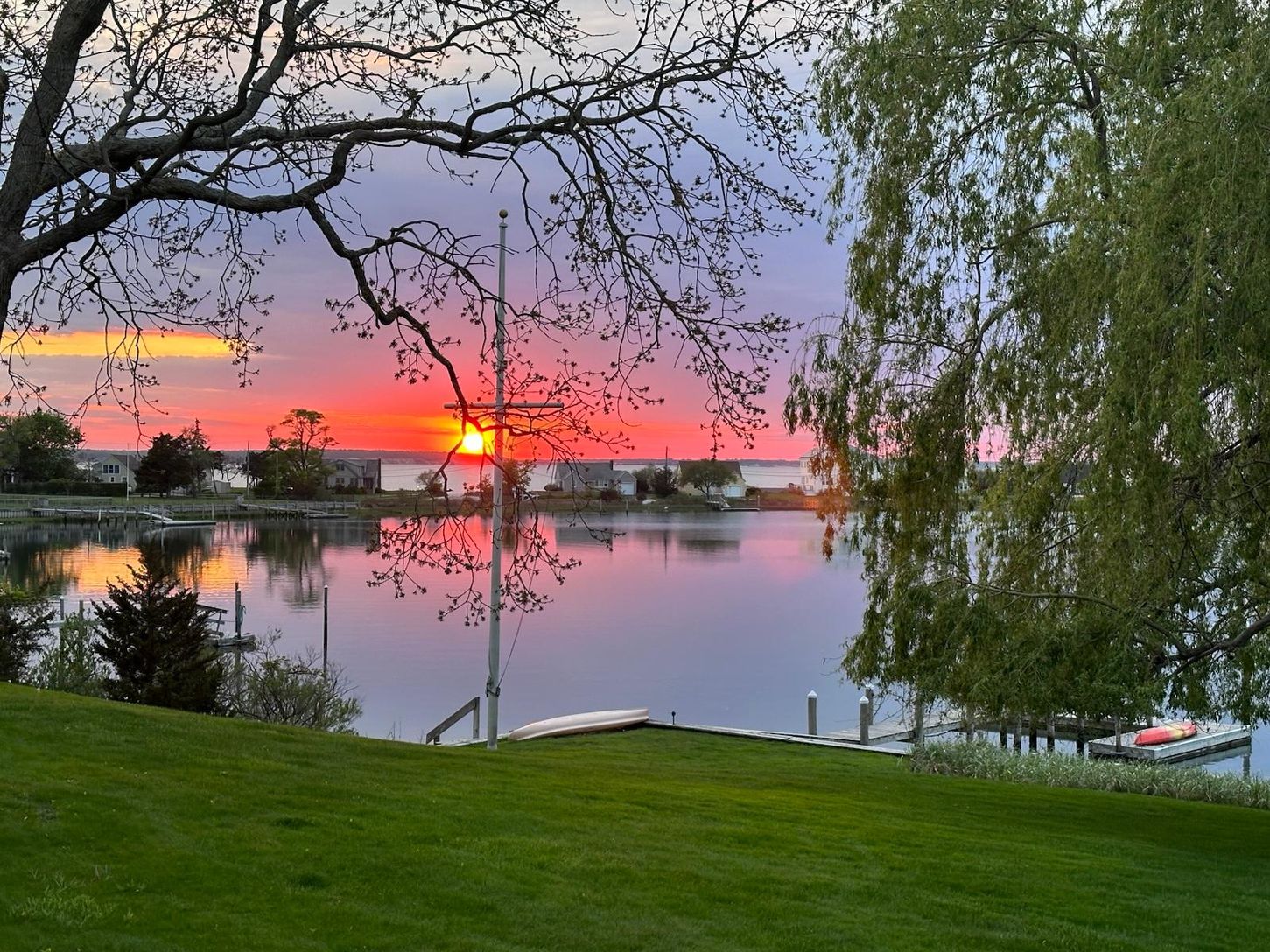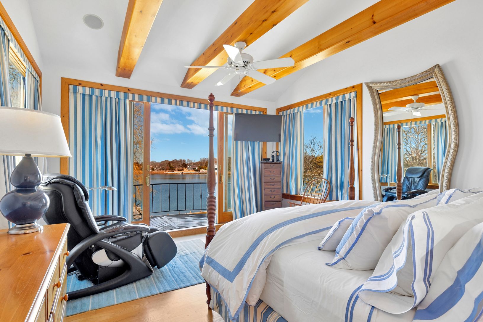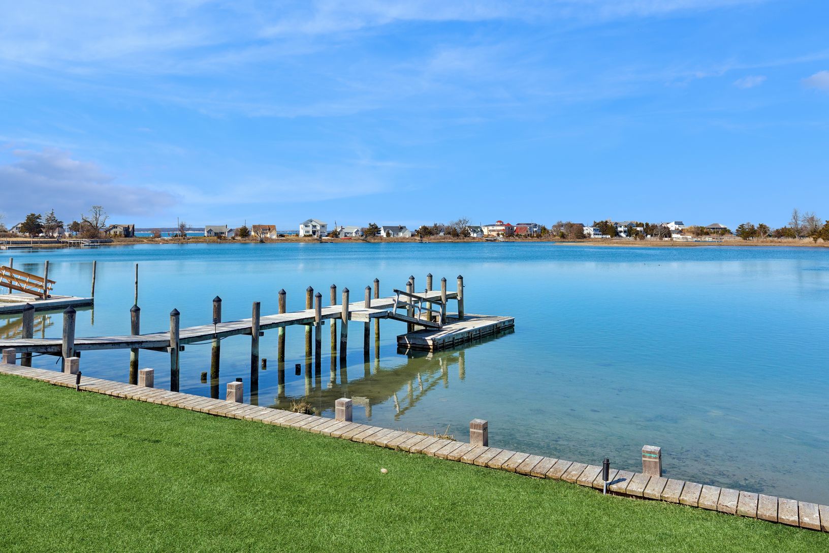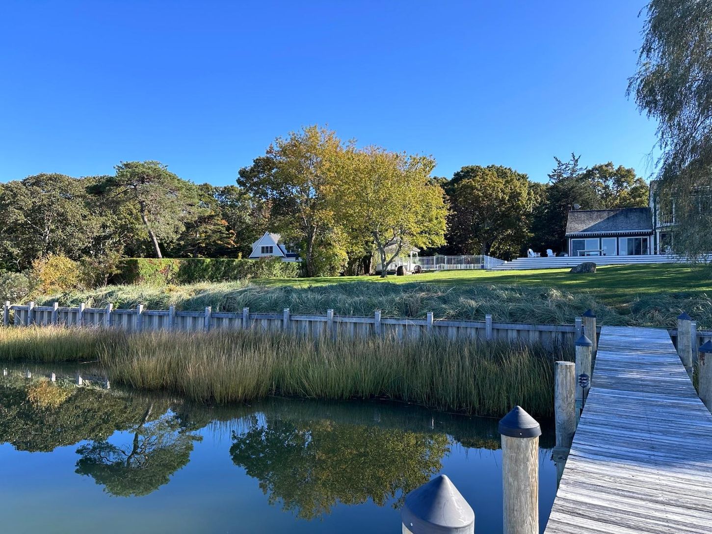 A beautifully manicured lawn leads to the waterfront, creating an ideal setting for boating, kayaking, or simply enjoying peaceful days by the water.