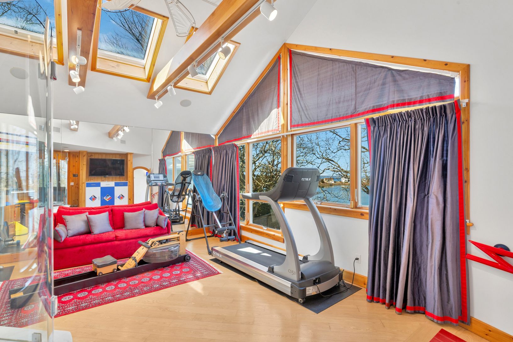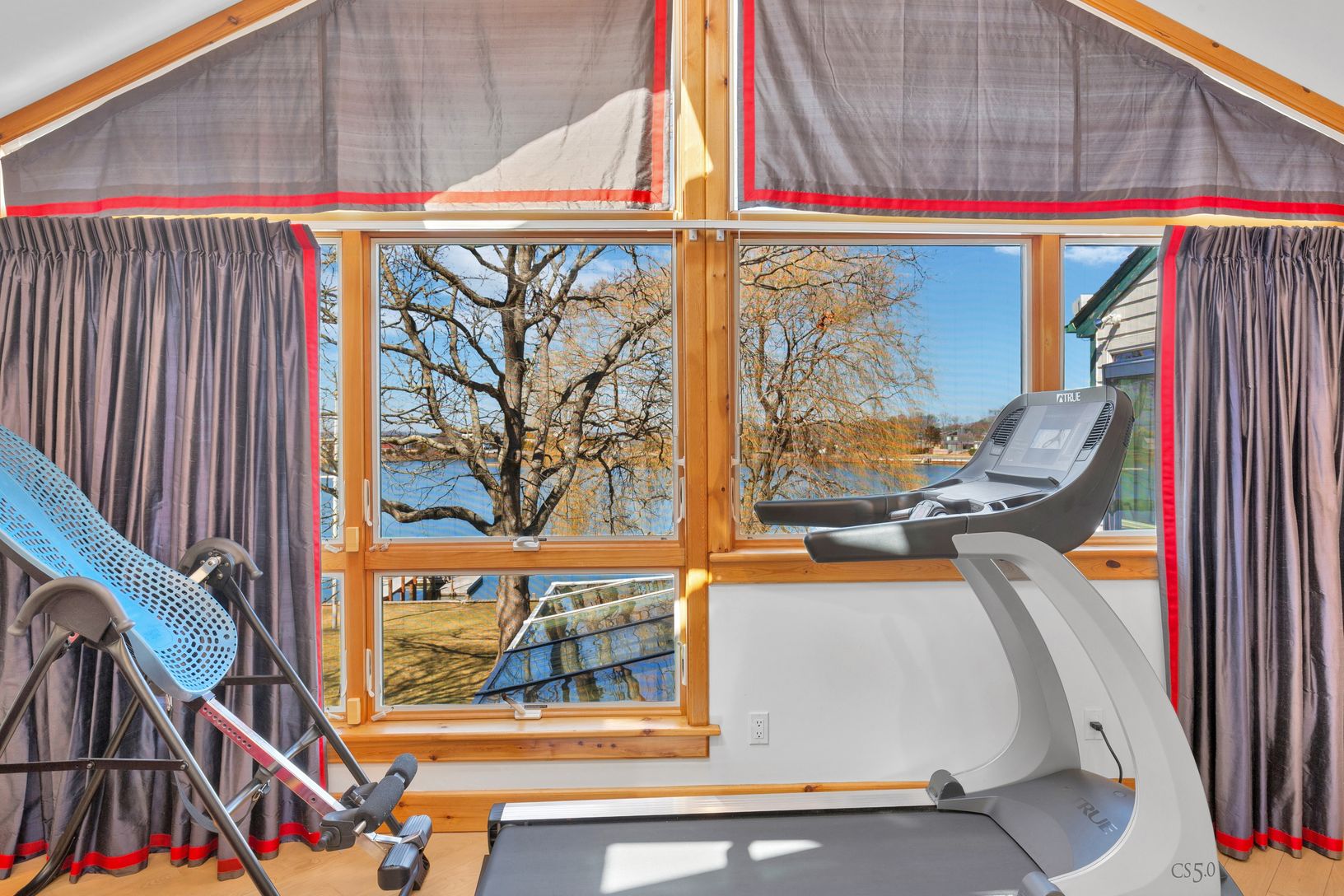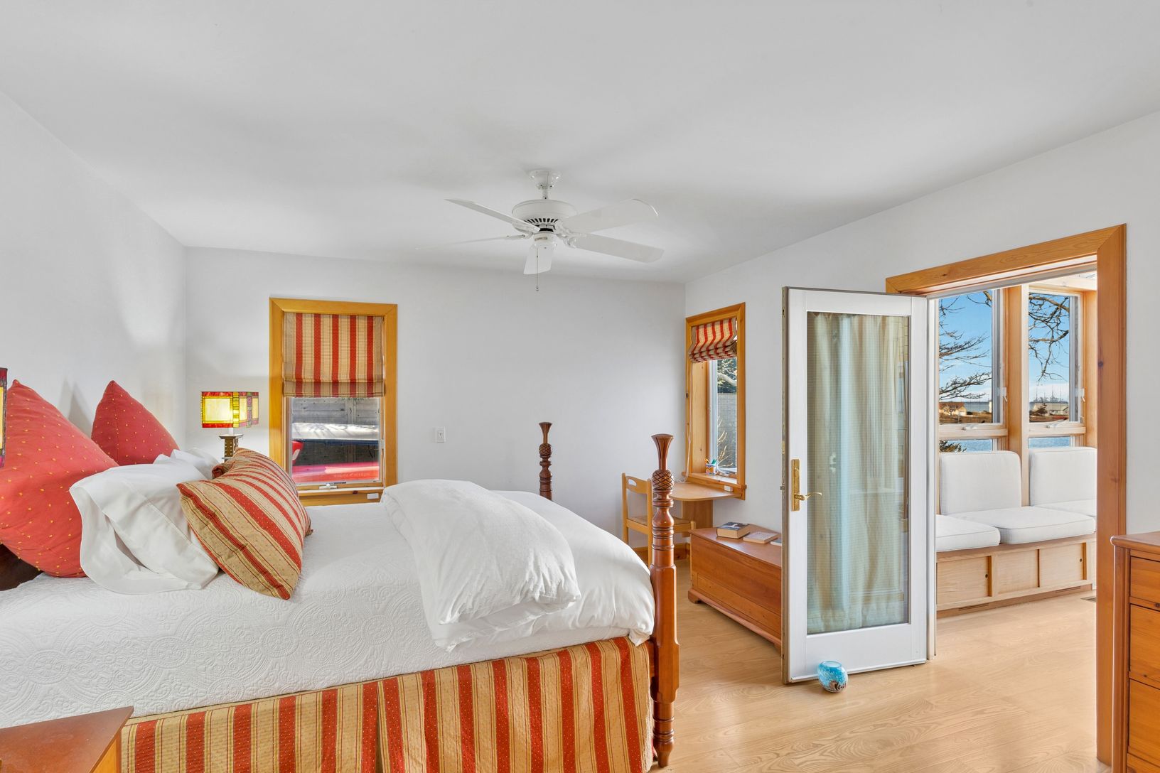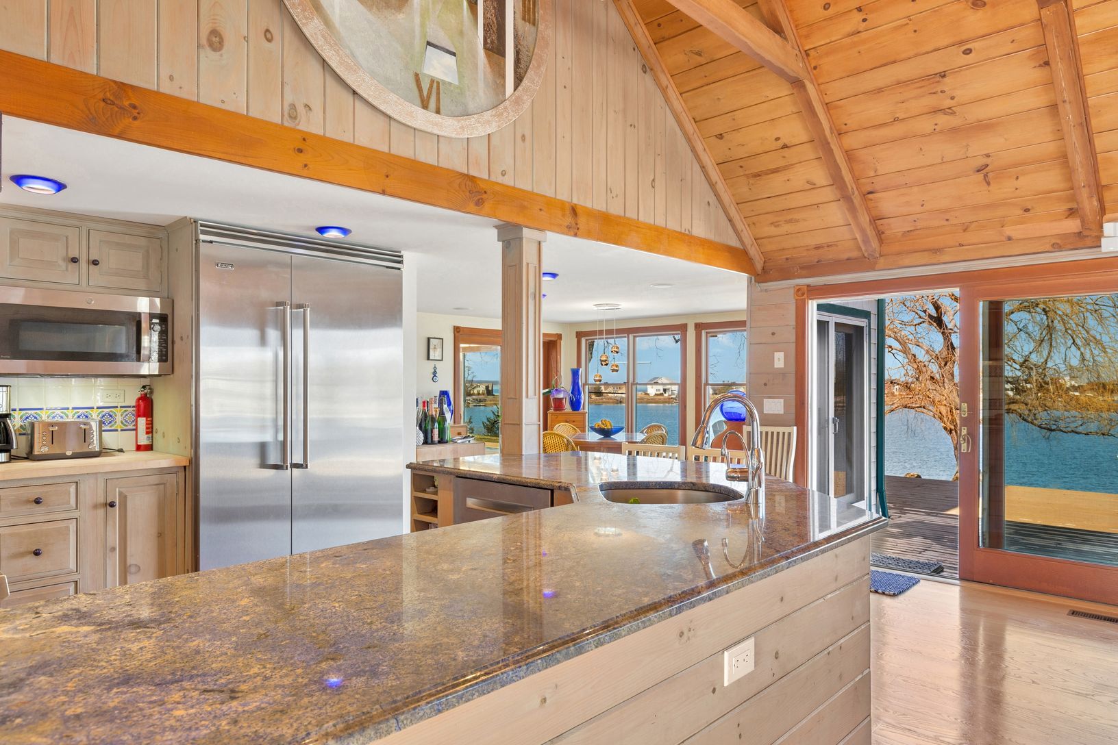 A beautifully manicured lawn leads to the waterfront, creating an ideal setting for boating, kayaking, or simply enjoying peaceful days by the water.