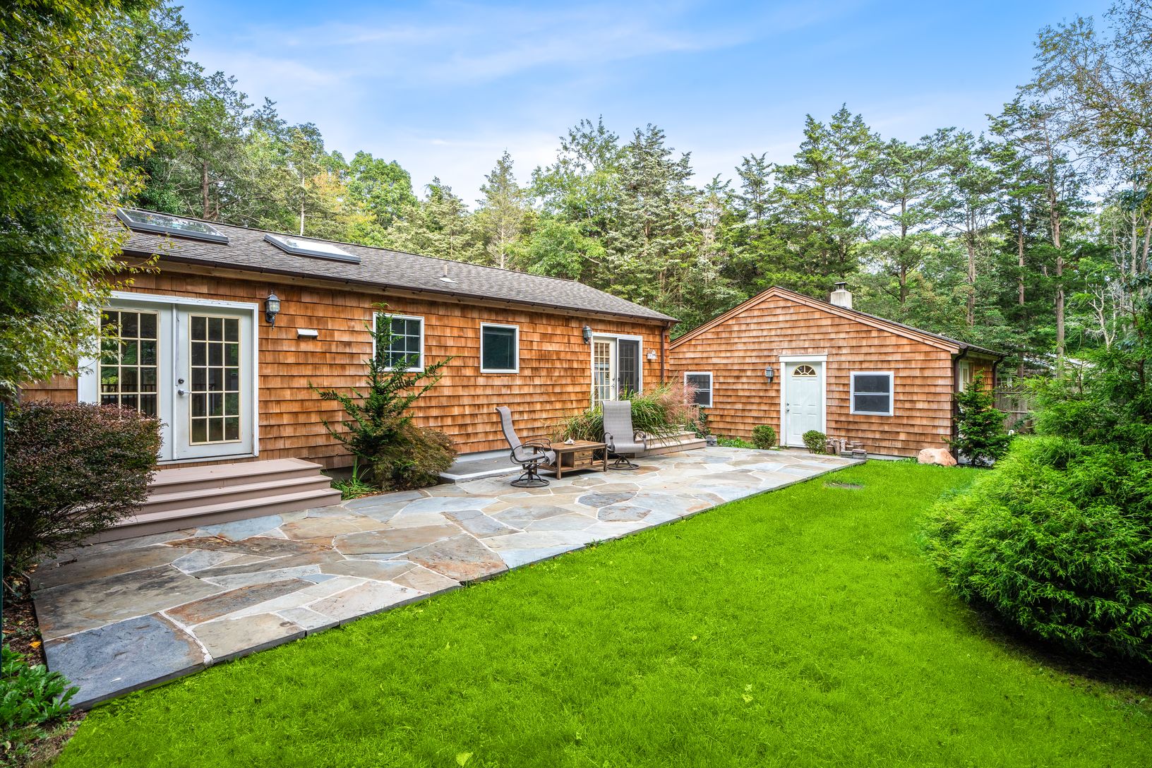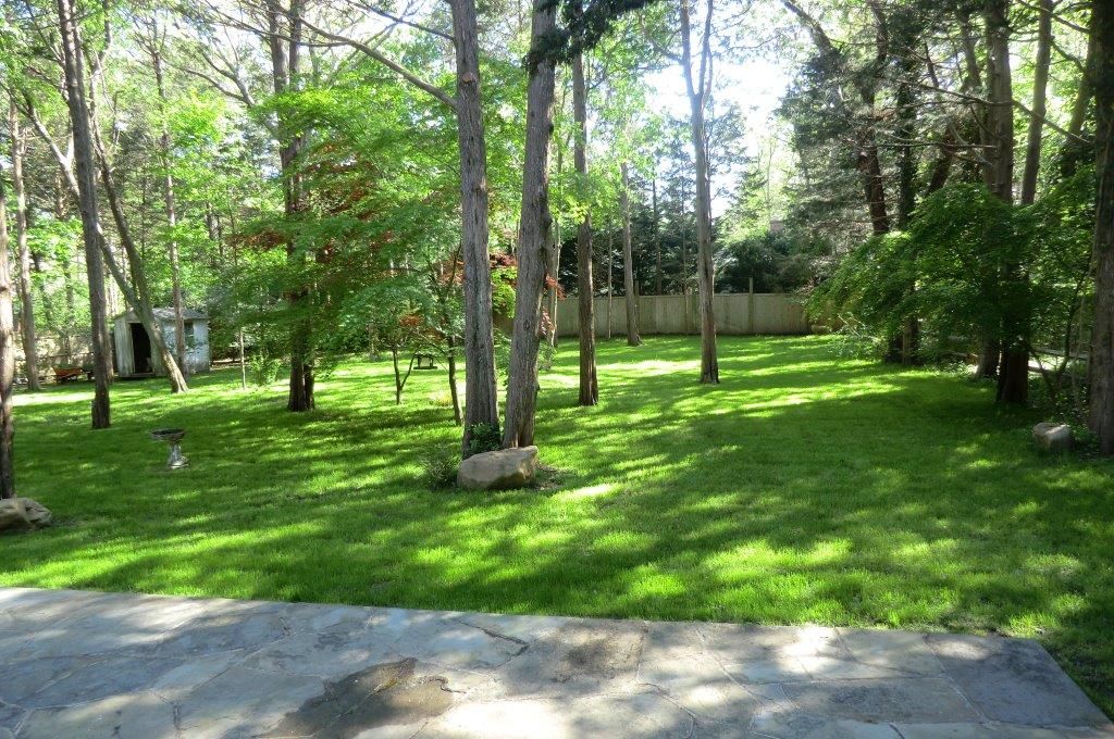 A must-see in person to understand the beauty of this house. 4 Bed/2bath on shy half acre. Nicely landscaped and private lot just a short distance to the beach. Open living, kitchen, dining area with cathedral ceiling and skylights, a stone fireplace and double French doors leading out to a bluestone patio. Separate garage with full basement!, and storage shed and plenty of room for a pool. Fully finished light-filled basement with 9.5ft ceili