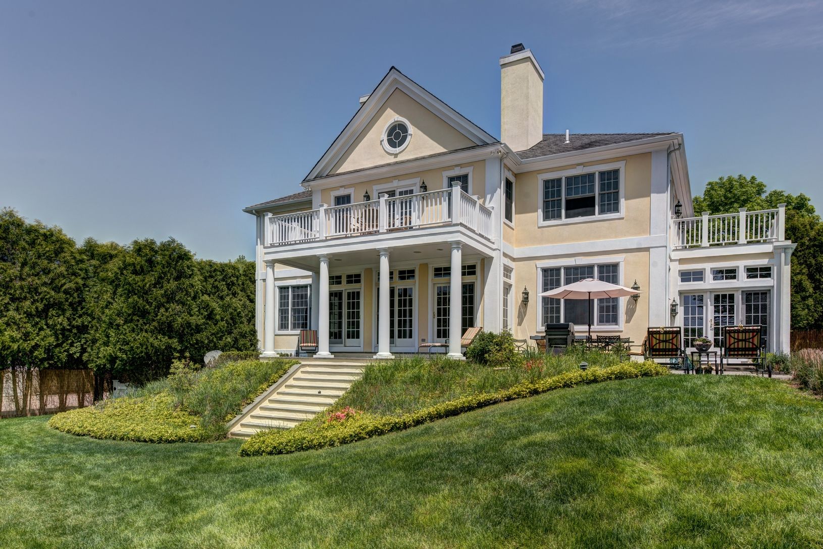 Beautiful waterfront village home in private landscaped setting on 0.94 acres in the Estate Section. 6 bedrooms, 6.5 baths, formal dining room, eat-in kitchen, 2 working wood burning fireplaces, media room. Traditional home tastefully furnished. Features master bedroom suite on second floor with private balcony, heated gunite pool, rear patio, full finished (and furnished) basement for entertaining. Gas heat, gas cooking, fully air conditioned