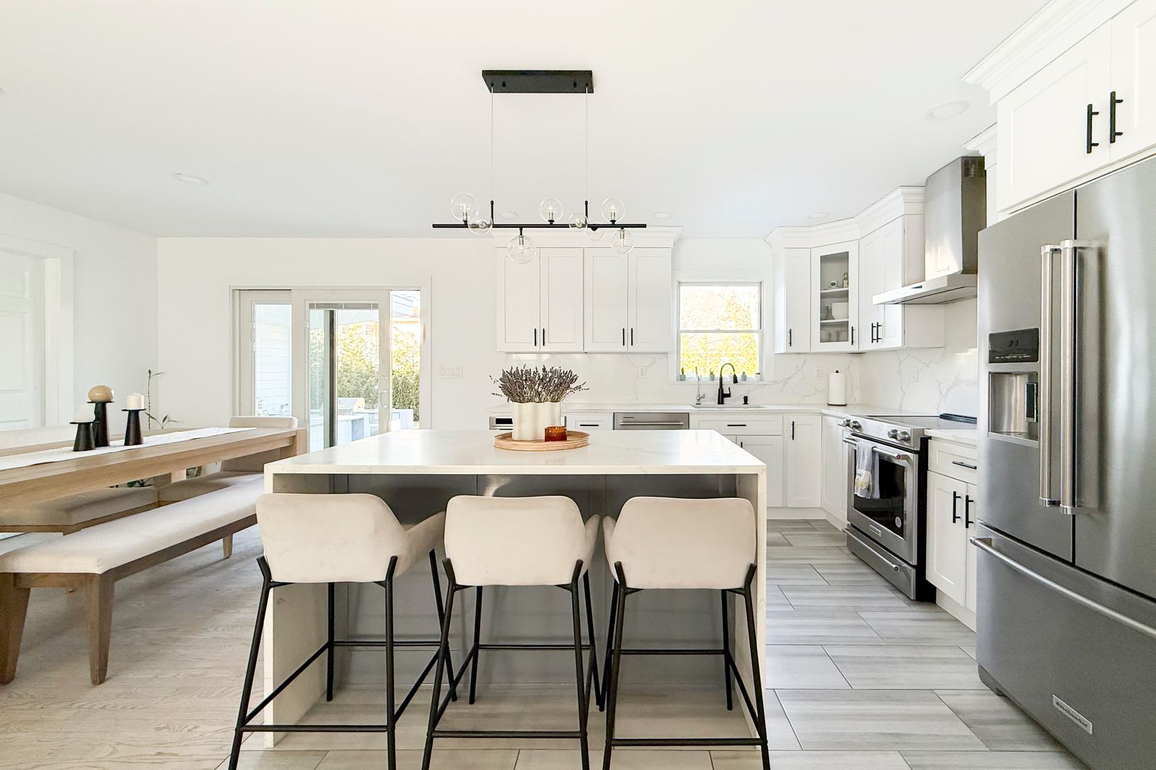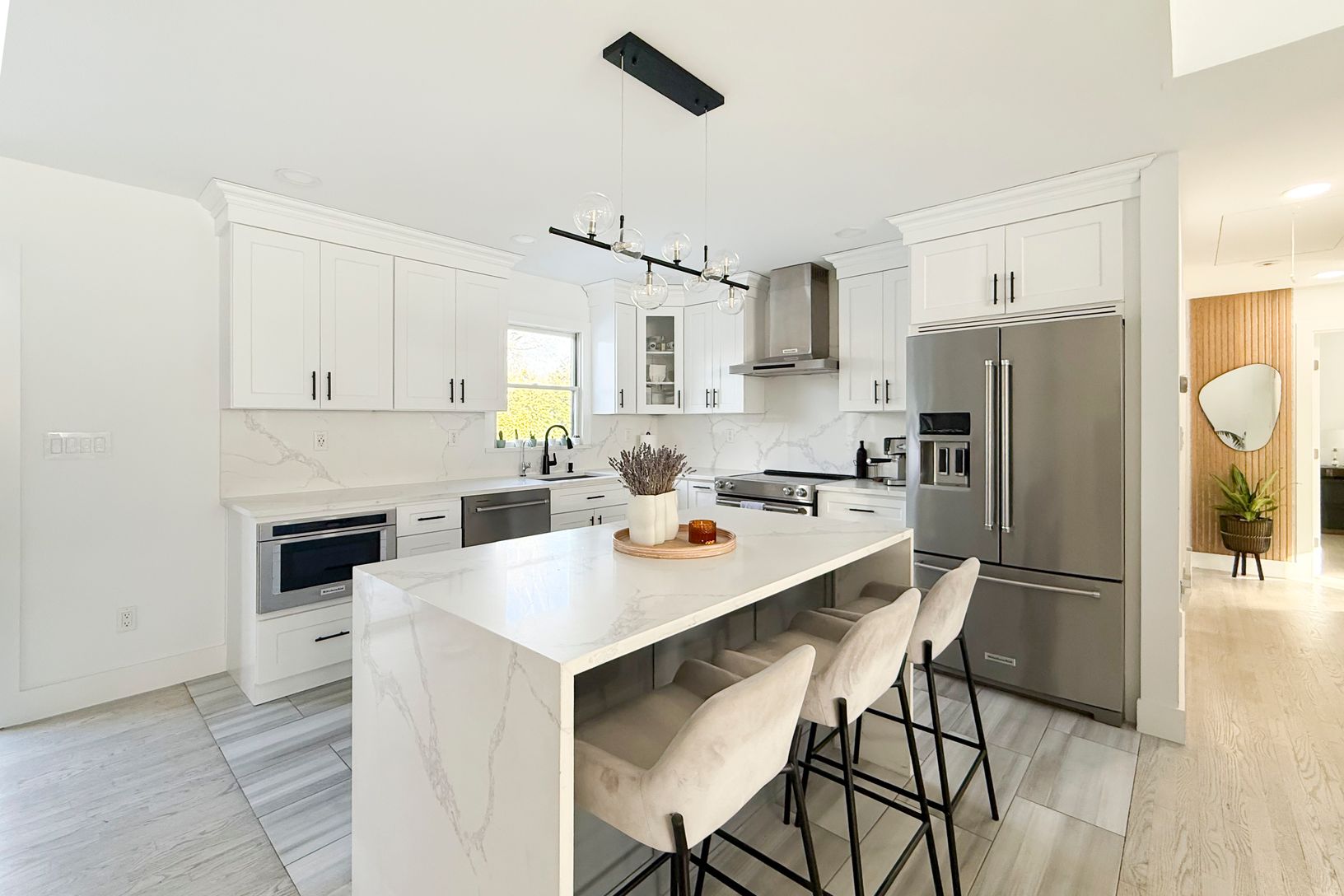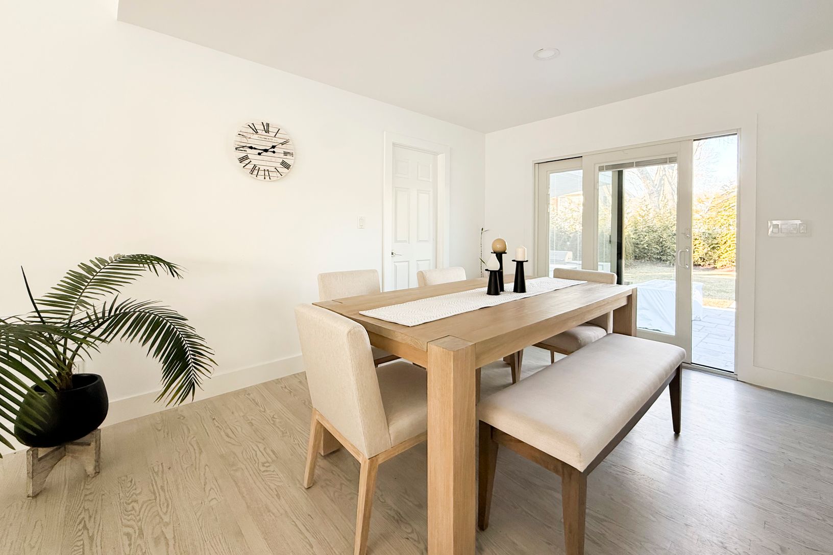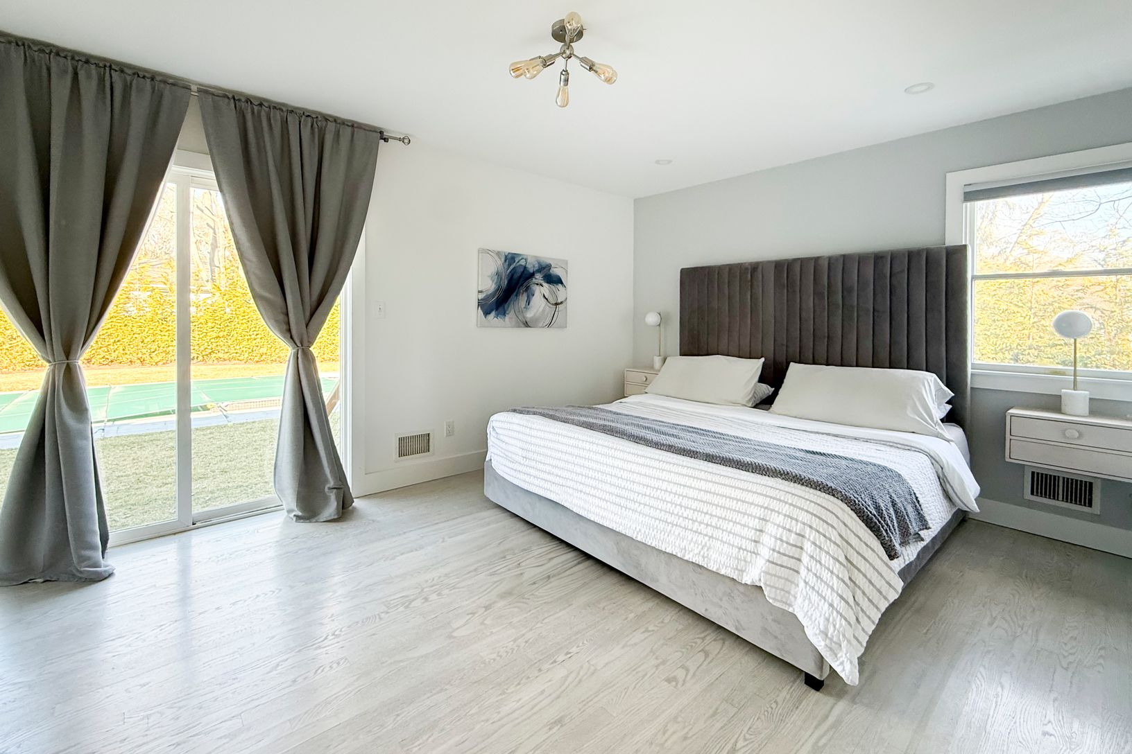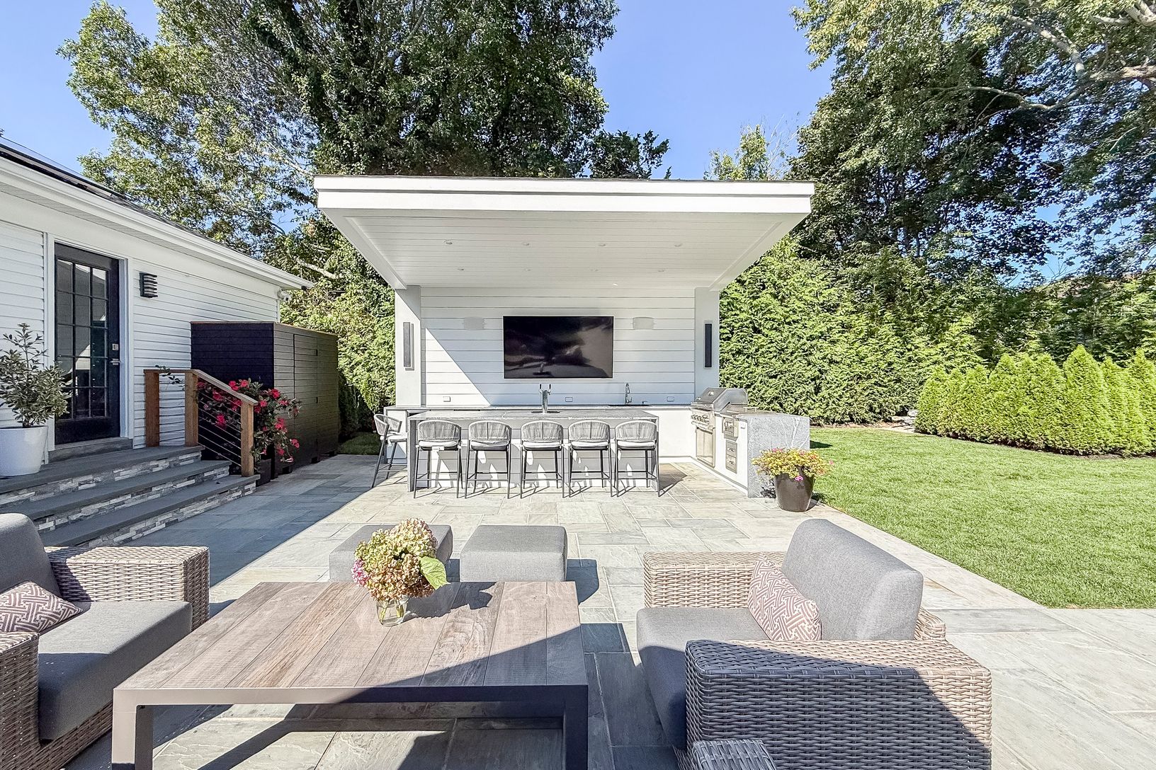 Set far back from the road, this thoughtfully renovated ranch offers a quiet setting for a relaxed summer retreat in Hampton Bays. As you enter, the living room boasts vaulted ceilings with an abundance of natural light and flows seamlessly in an open layout connecting to the dining area, and kitchen - designed for comfortable everyday living and casual entertaining. The kitchen is well appointed with quartz countertops, stainless steel applia