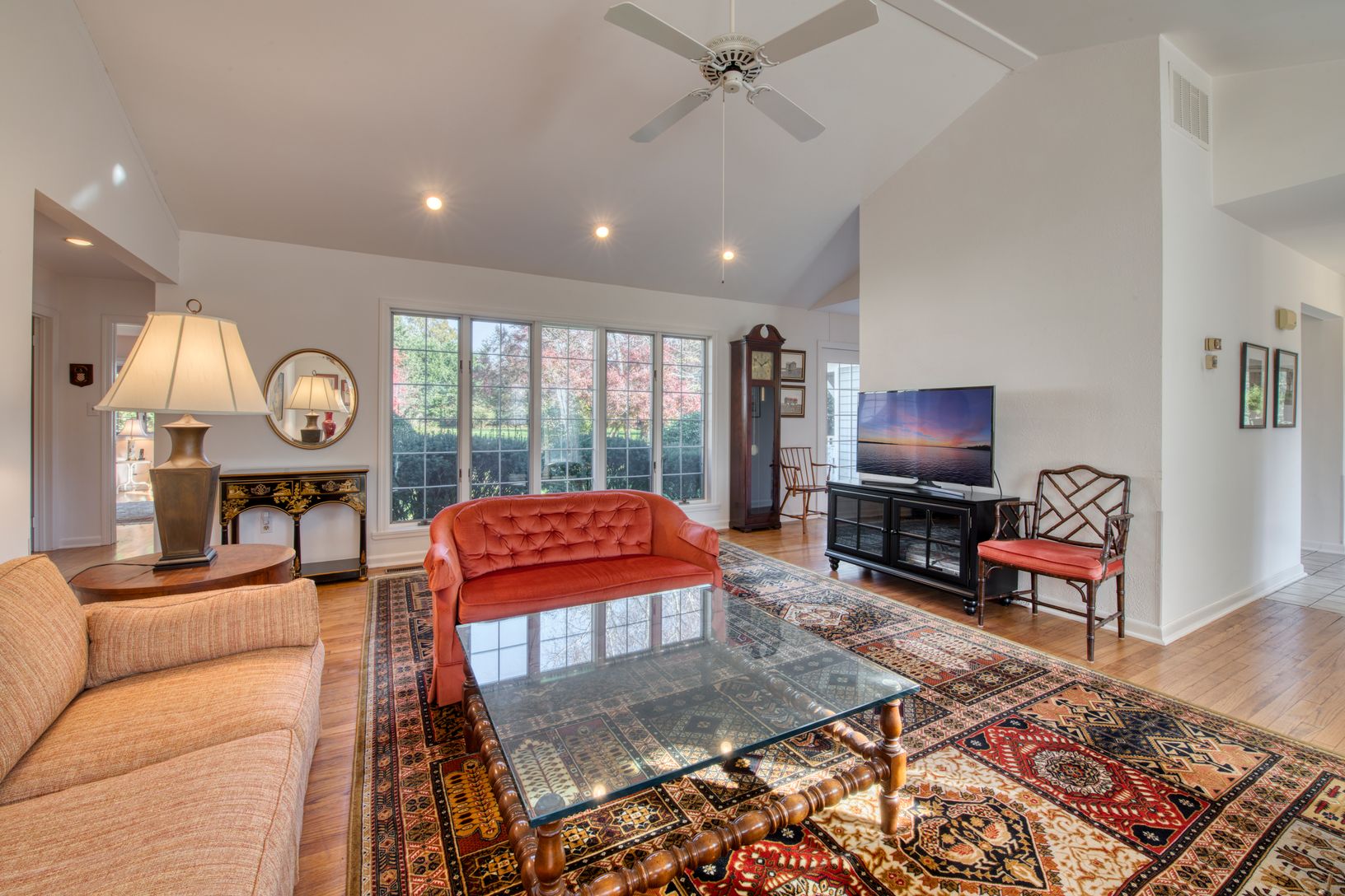 1215 Country Club Drive, Cutchogue. Big, but not too big; serenely quiet, private. Spacious H-Style ranch, with due-west exposure, enclosed by green; 2100+/- square feet of light-filled living space on 1.4+/- acres. Large, covered breezeway connects home to super-sized basement and garage. Eastern-most bedroom opens onto the rear garden; south-side bath opens onto breezeway; small deck located at breakfast room entrance. Formal living room has