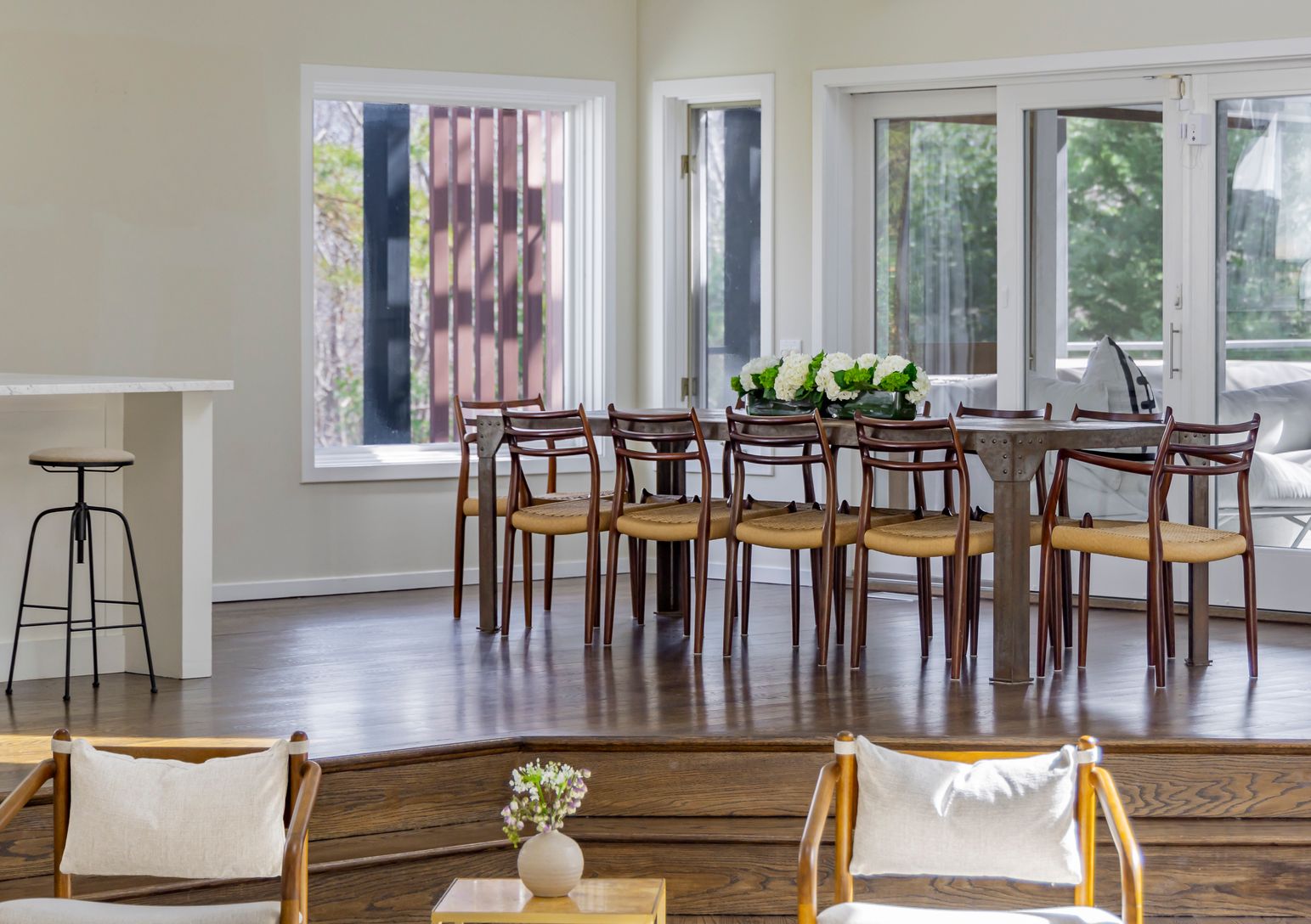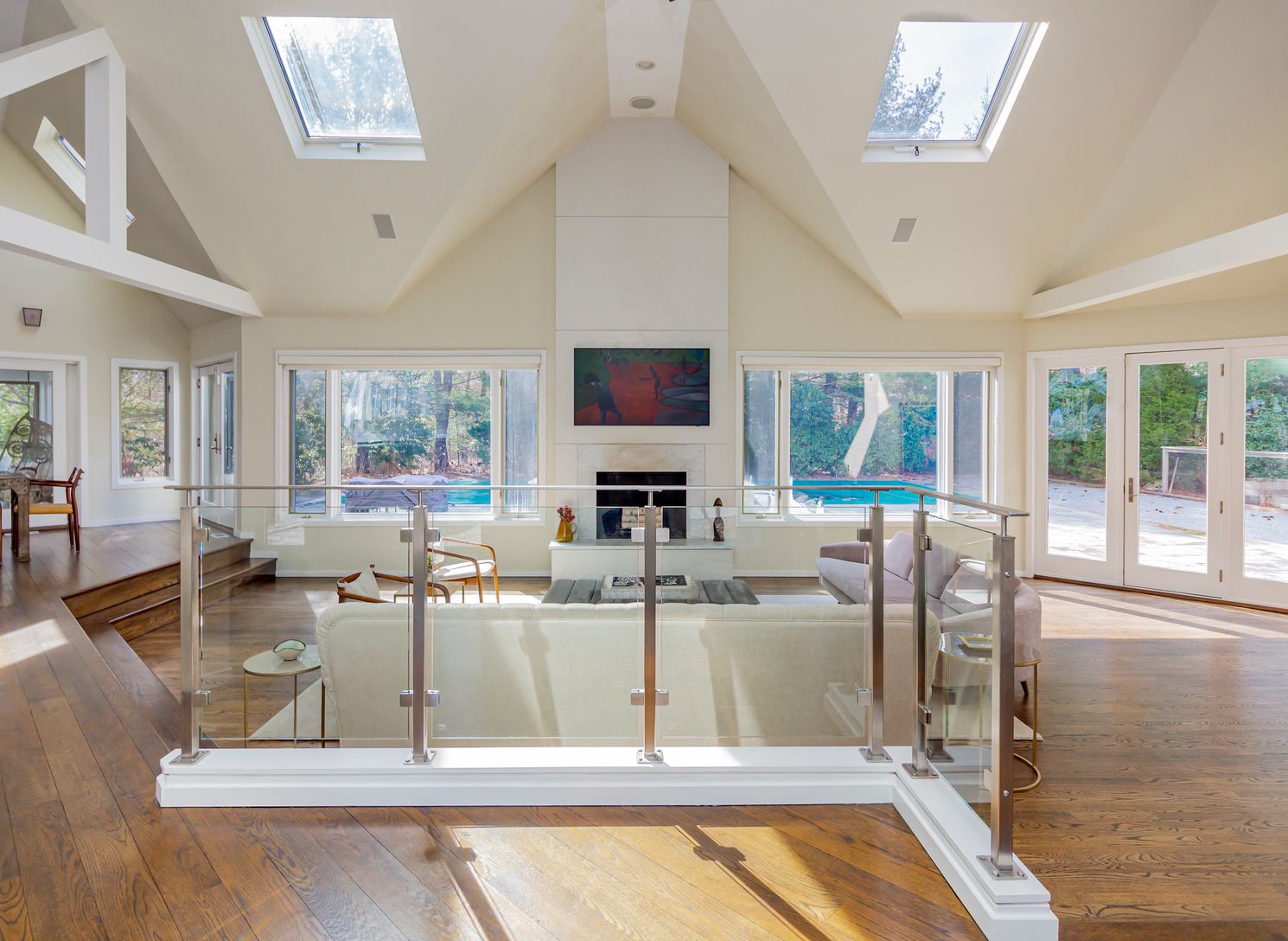 Gorgeous property, located exactly midway between East Hampton and Sag Harbor, sits on 5± acres of secluded land. The home offers an open floor plan, featuring a sprawling great room with lots of natural light and 20-ft., vaulted ceilings. The modern-open kitchen has an 8-burner Viking stove, with an oversized Carrera marble island that acts as a perfect centerpiece for entertainment. There i