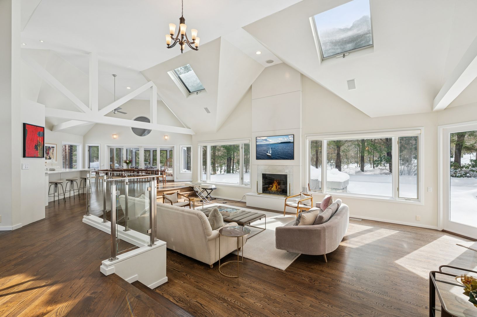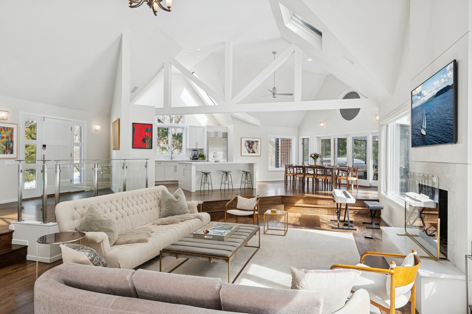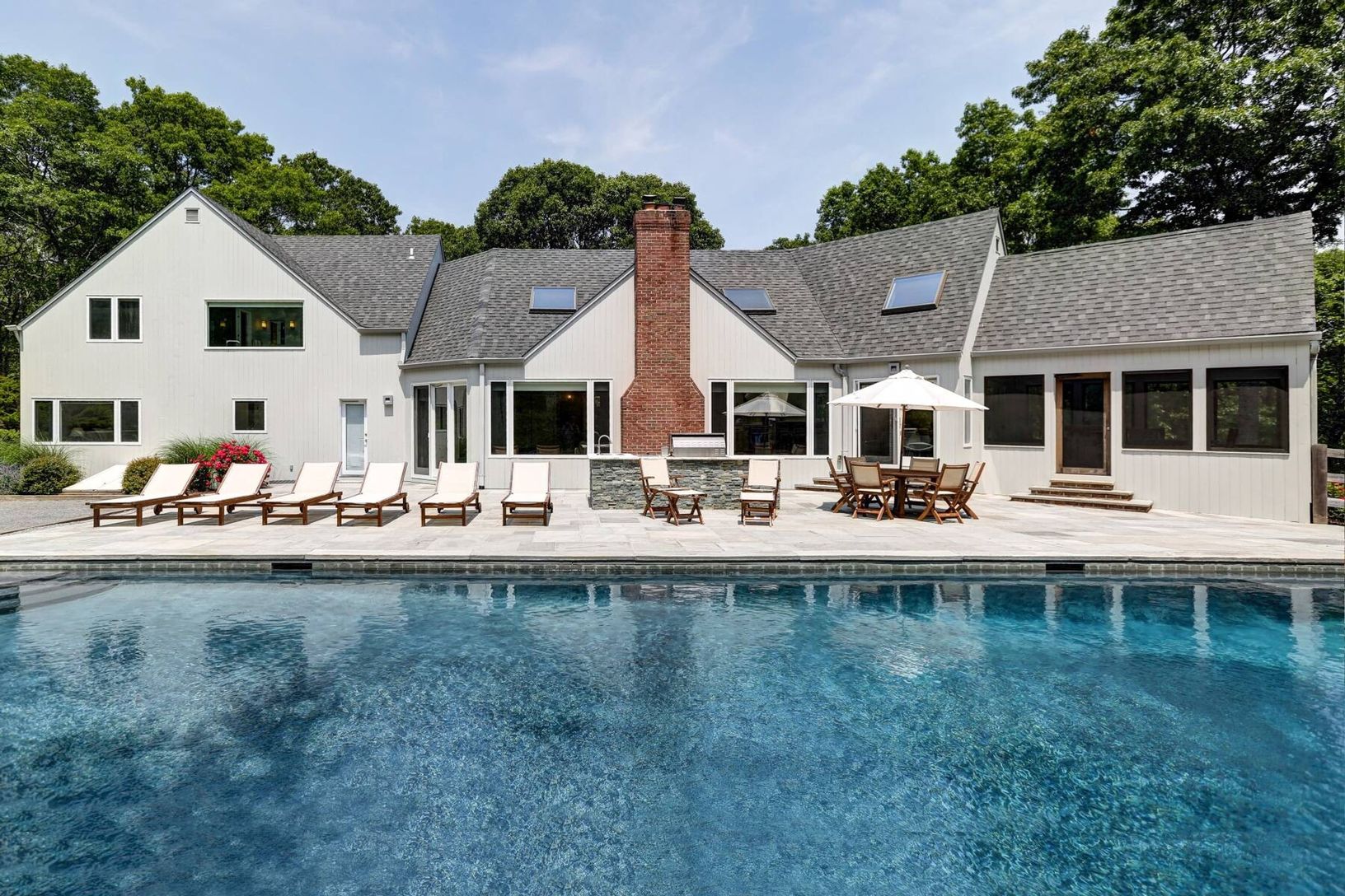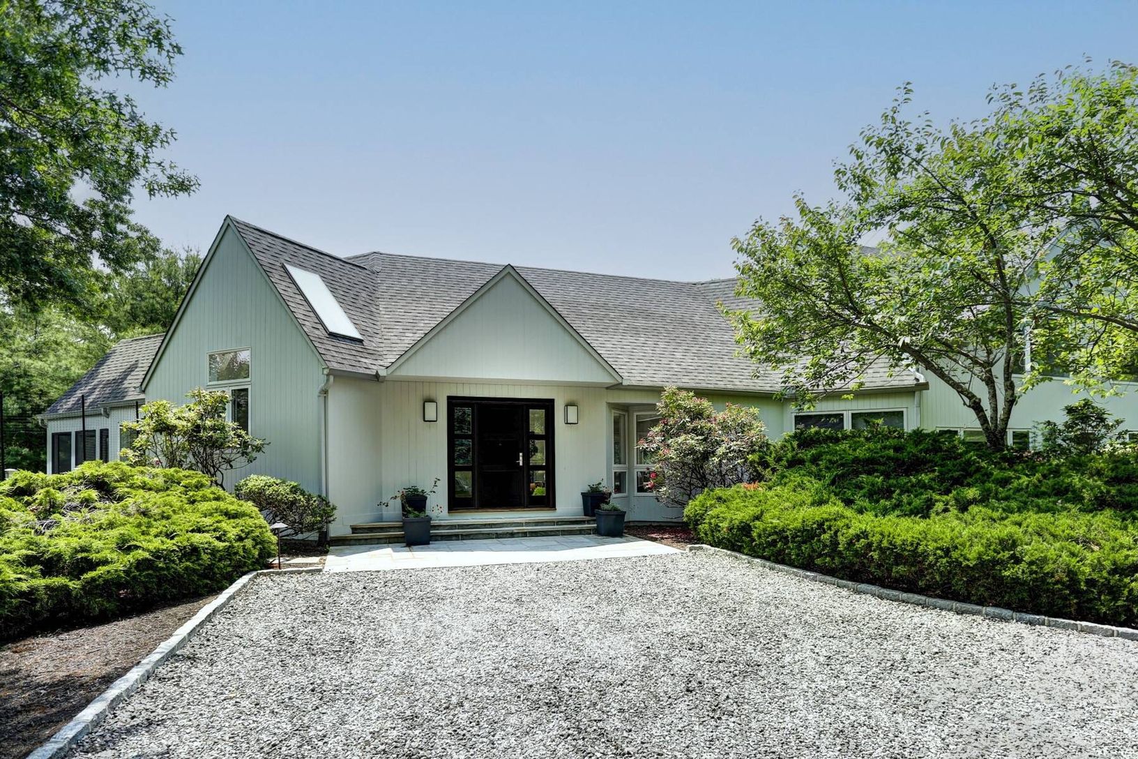Set on five secluded acres, this spacious contemporary offers exceptional privacy just minutes from Sag Harbor Village, East Hampton, and Bridgehampton. The dramatic great room with soaring 20-foot ceilings and walls of light anchors the home. The open chef's kitchen features an 8-burner Viking range, dual wine refrigerators, and a large marble island designed for easy entertaining. The private second-floor primary suite has a sitting area, fi