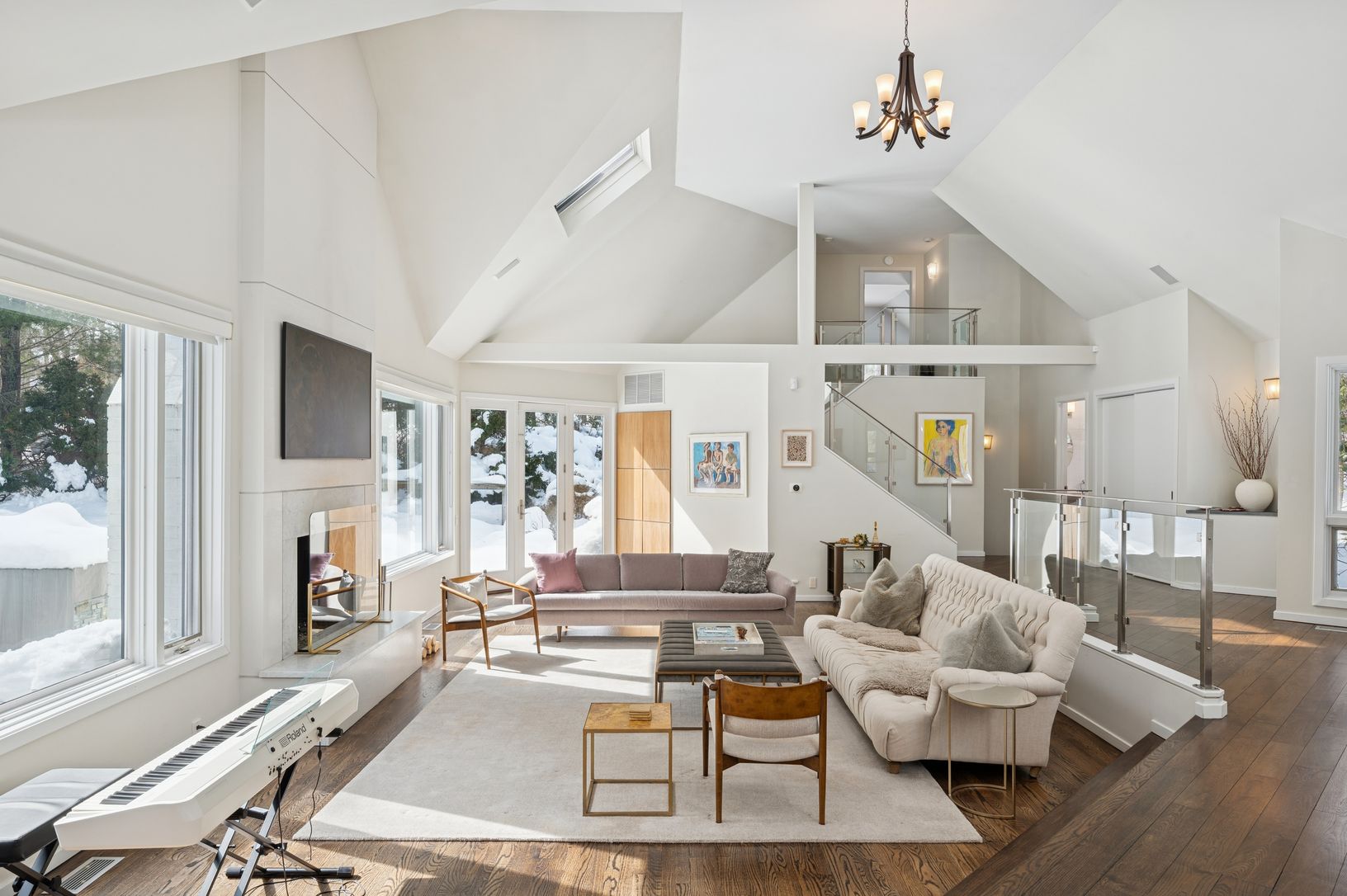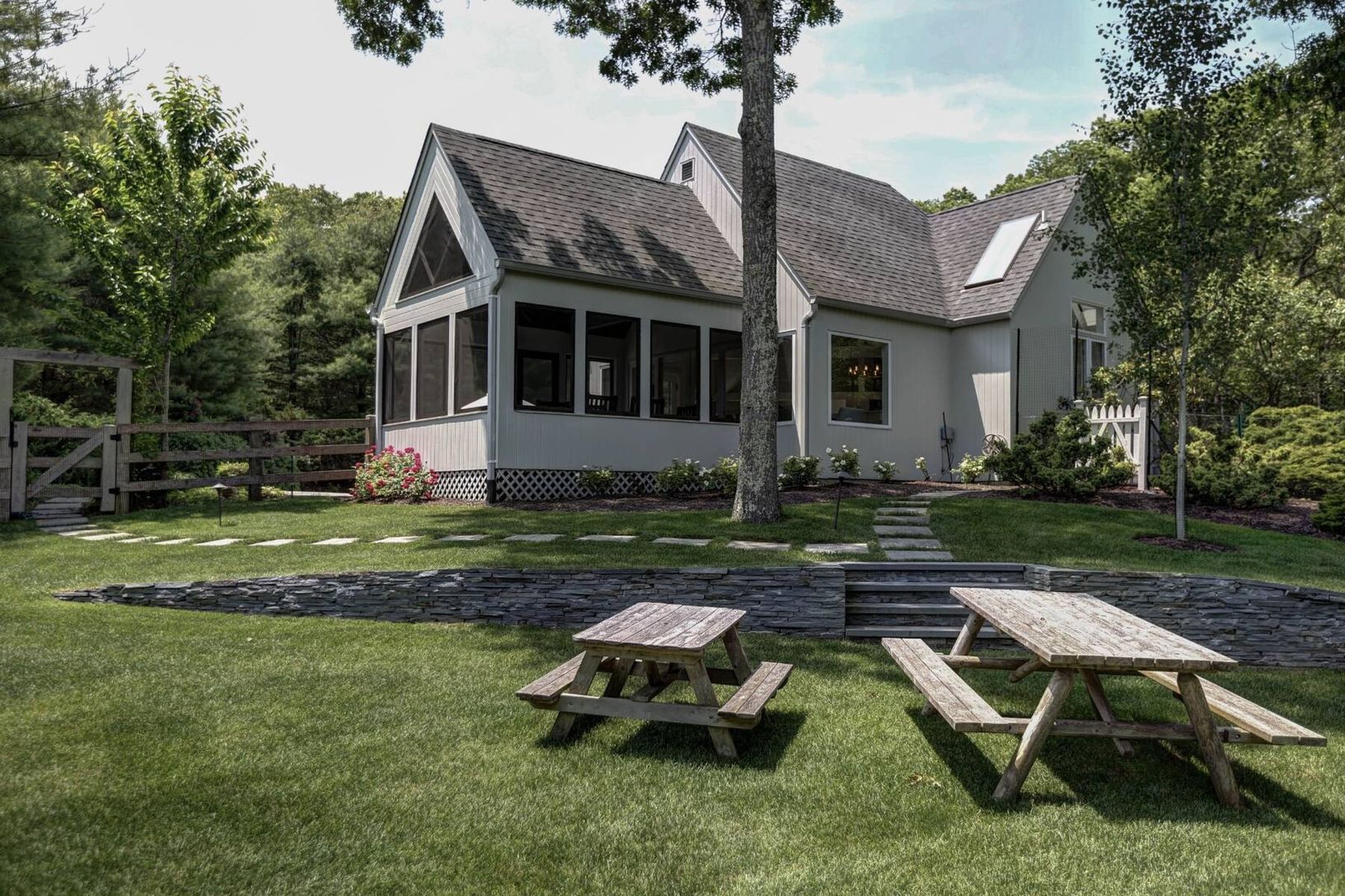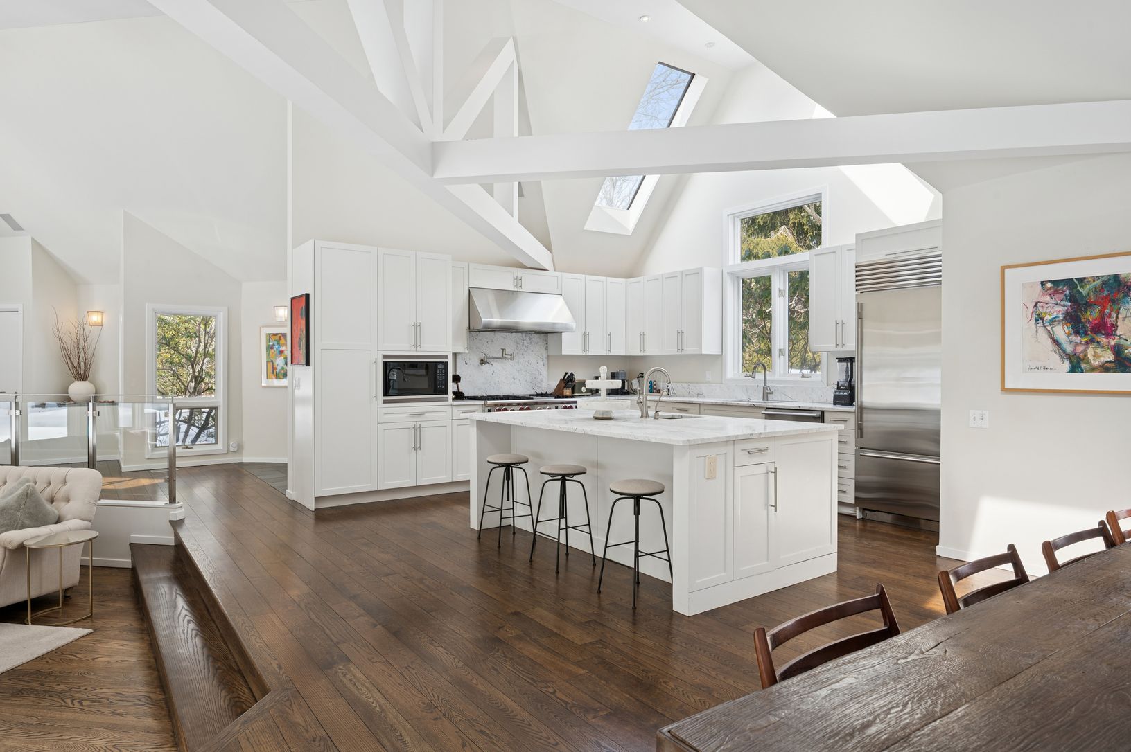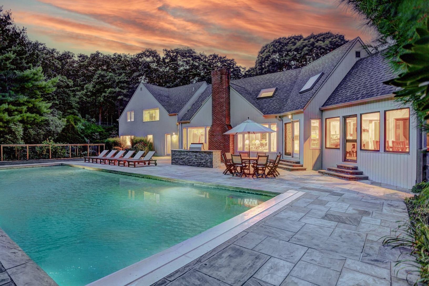 Set on five secluded acres, this spacious contemporary offers exceptional privacy just minutes from Sag Harbor Village, East Hampton, and Bridgehampton. The dramatic great room with soaring 20-foot ceilings and walls of light anchors the home. The open chef's kitchen features an 8-burner Viking range, dual wine refrigerators, and a large marble island designed for easy entertaining. The private second-floor primary suite has a sitting area, fi