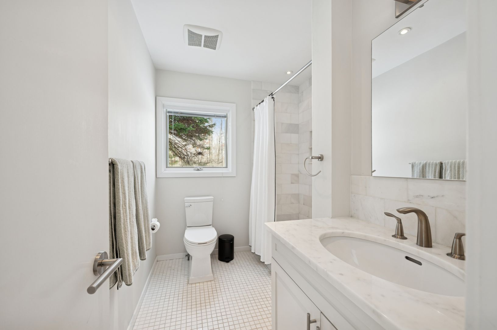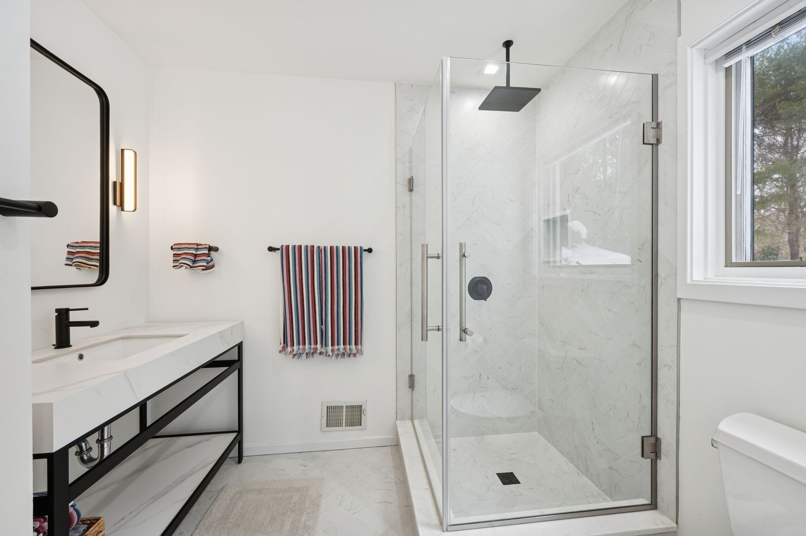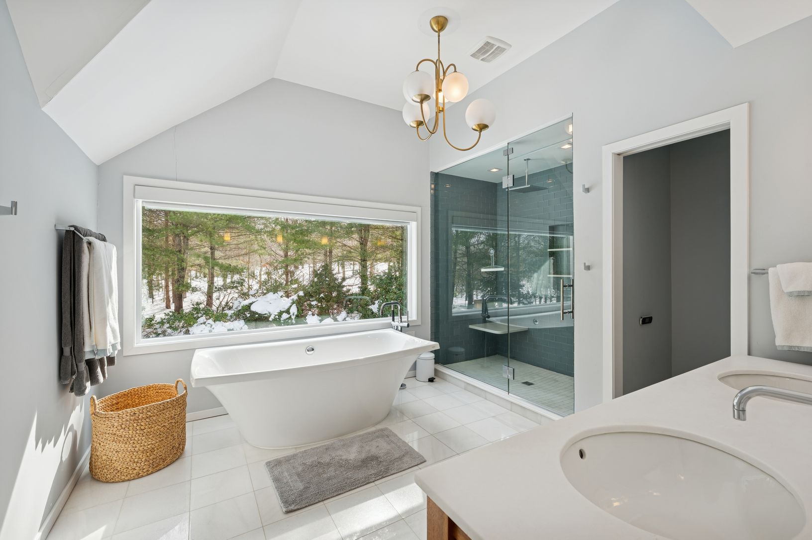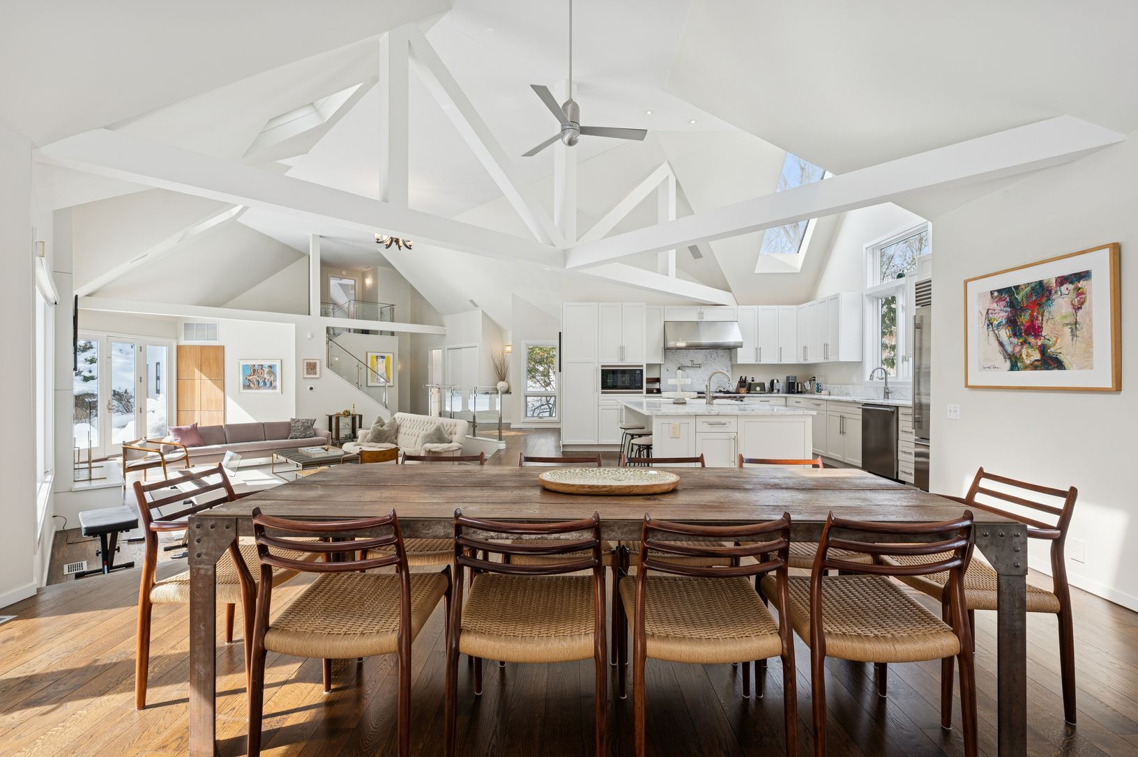 Set on five secluded acres, this spacious contemporary offers exceptional privacy just minutes from Sag Harbor Village, East Hampton, and Bridgehampton. The dramatic great room with soaring 20-foot ceilings and walls of light anchors the home. The open chef's kitchen features an 8-burner Viking range, dual wine refrigerators, and a large marble island designed for easy entertaining. The private second-floor primary suite has a sitting area, fi
