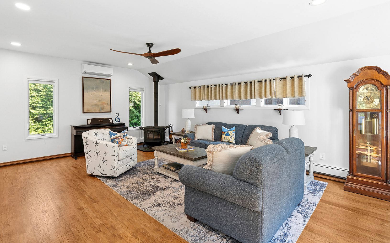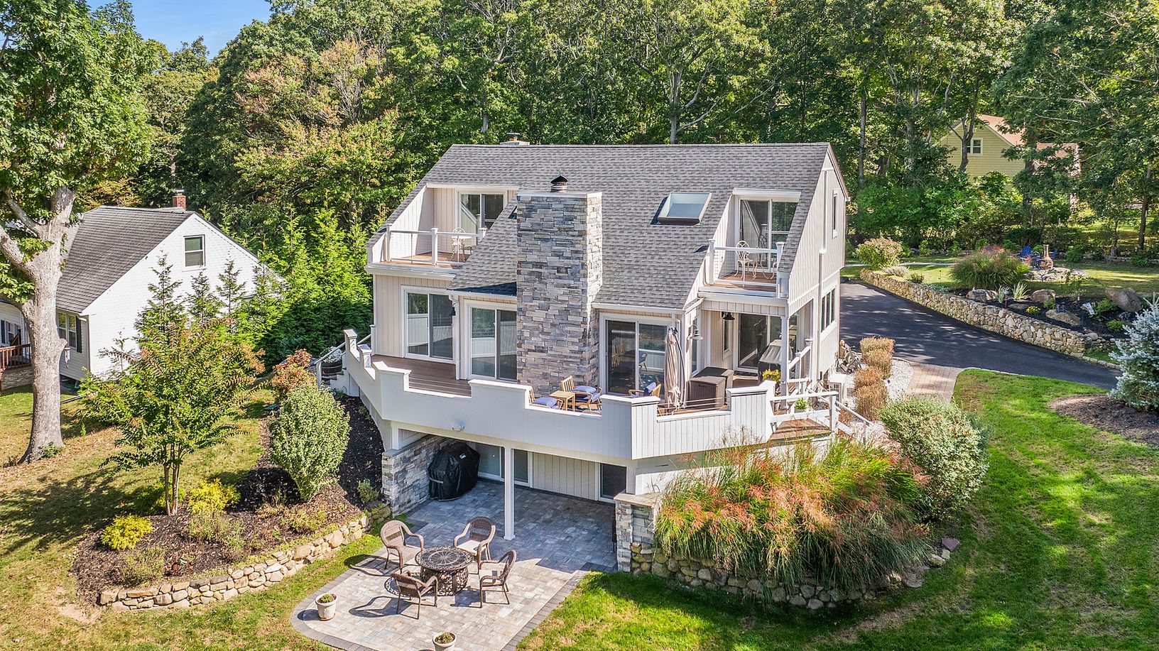 Enjoy breathtaking sunsets from any of the three private balconies of this beautiful North Fork retreat. Designed for comfort and relaxed elegance, this residence features a dynamic open floor plan that seamlessly connects the living room, dining, and kitchen areas leading to outdoor balconies. The granite kitchen is perfect for entertaining, opening to a bright living room with a fireplace and a cozy den ideal for year-round gatherings. The f