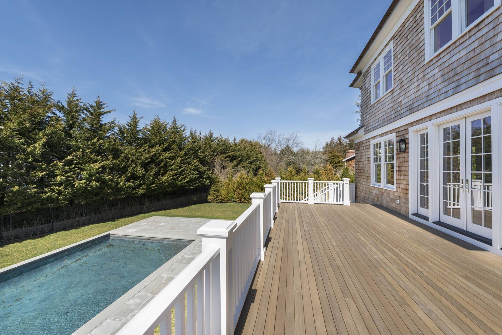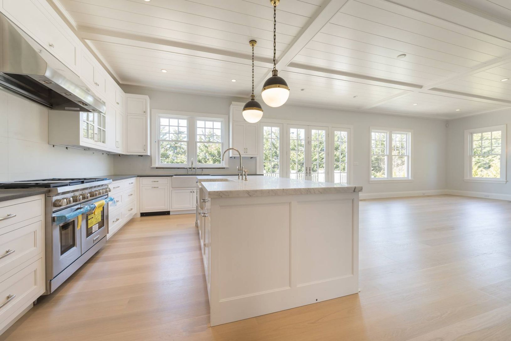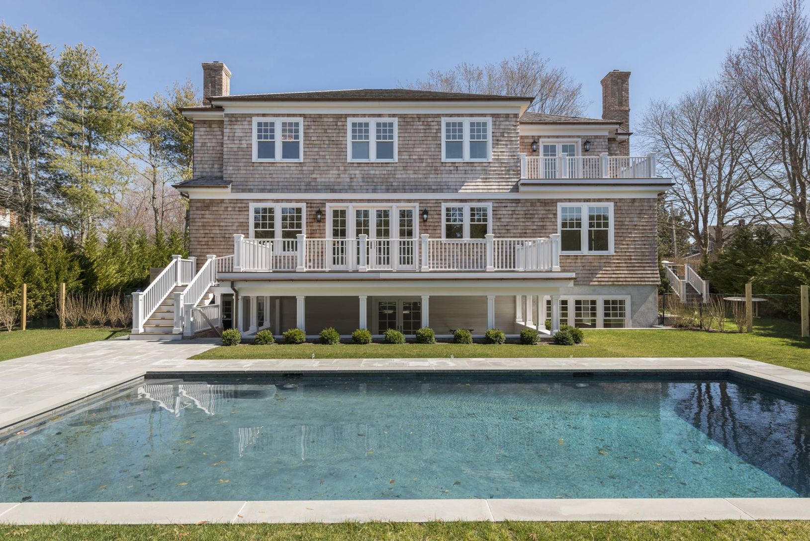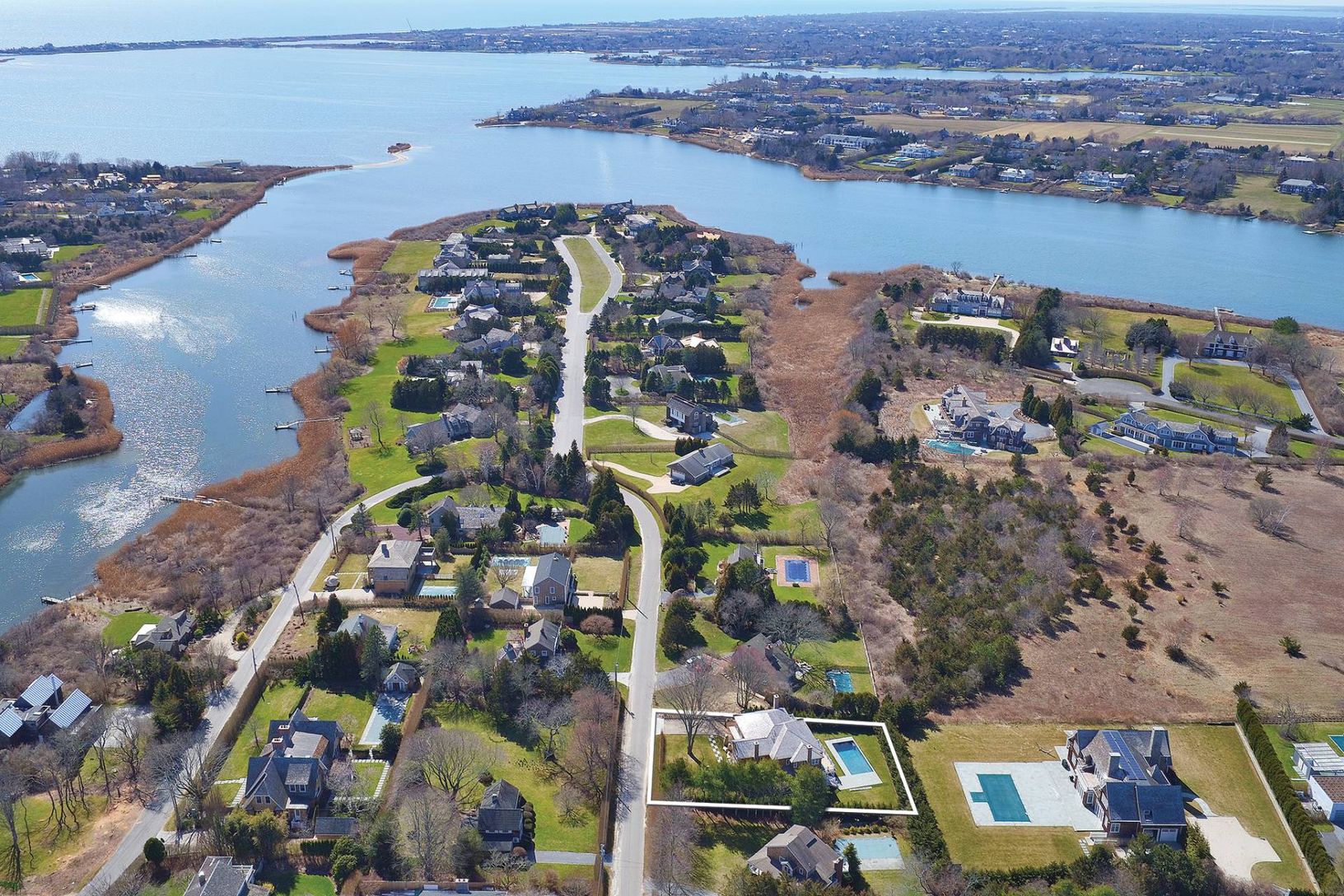 South of the highway in Water Mill, with deeded access to Mecox Bay, this custom home built in 2017 boasts six bedrooms and seven and one-half baths. Enter into a double height foyer accessing the living room with sculptural gas fireplace framed with marble, and the formal dining room, both with 10' coffered ceilings. The spacious professional kitchen includes custom cabinetry, appliances by Sub-Zero and Wolf, two dishwashers and an expansive