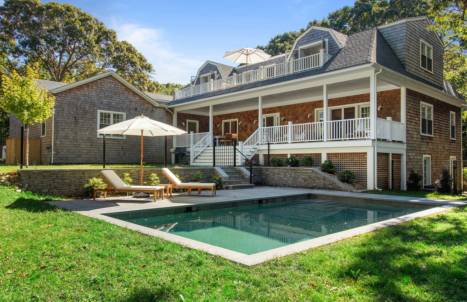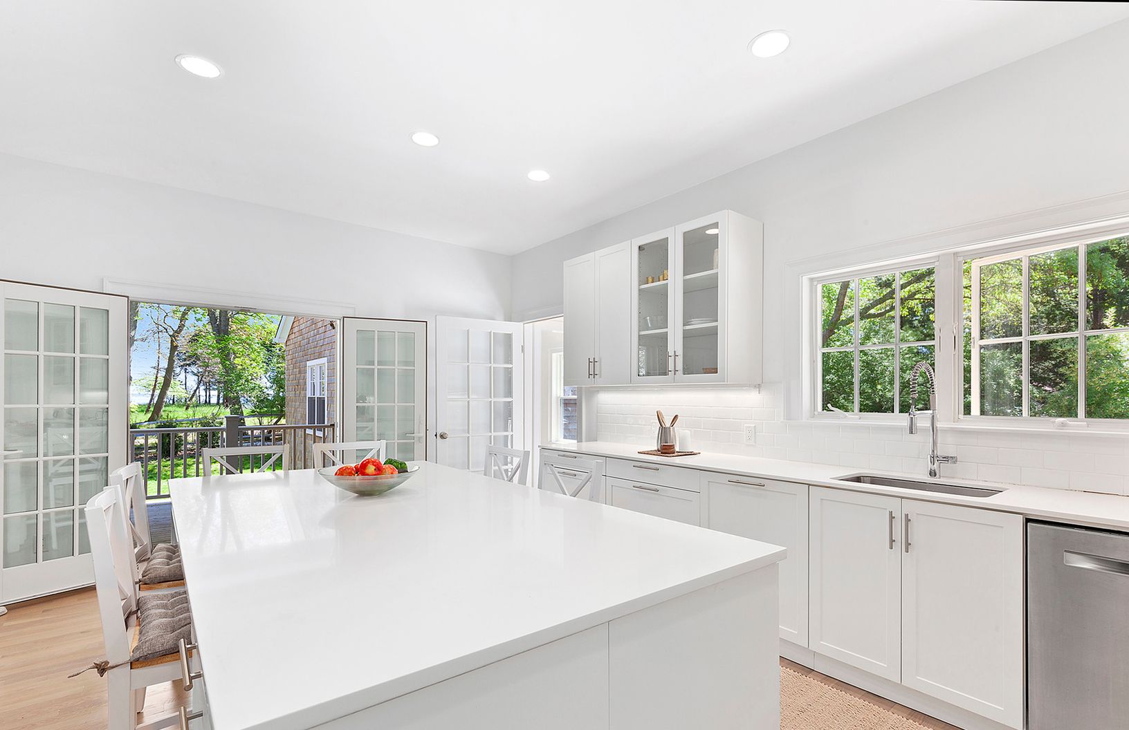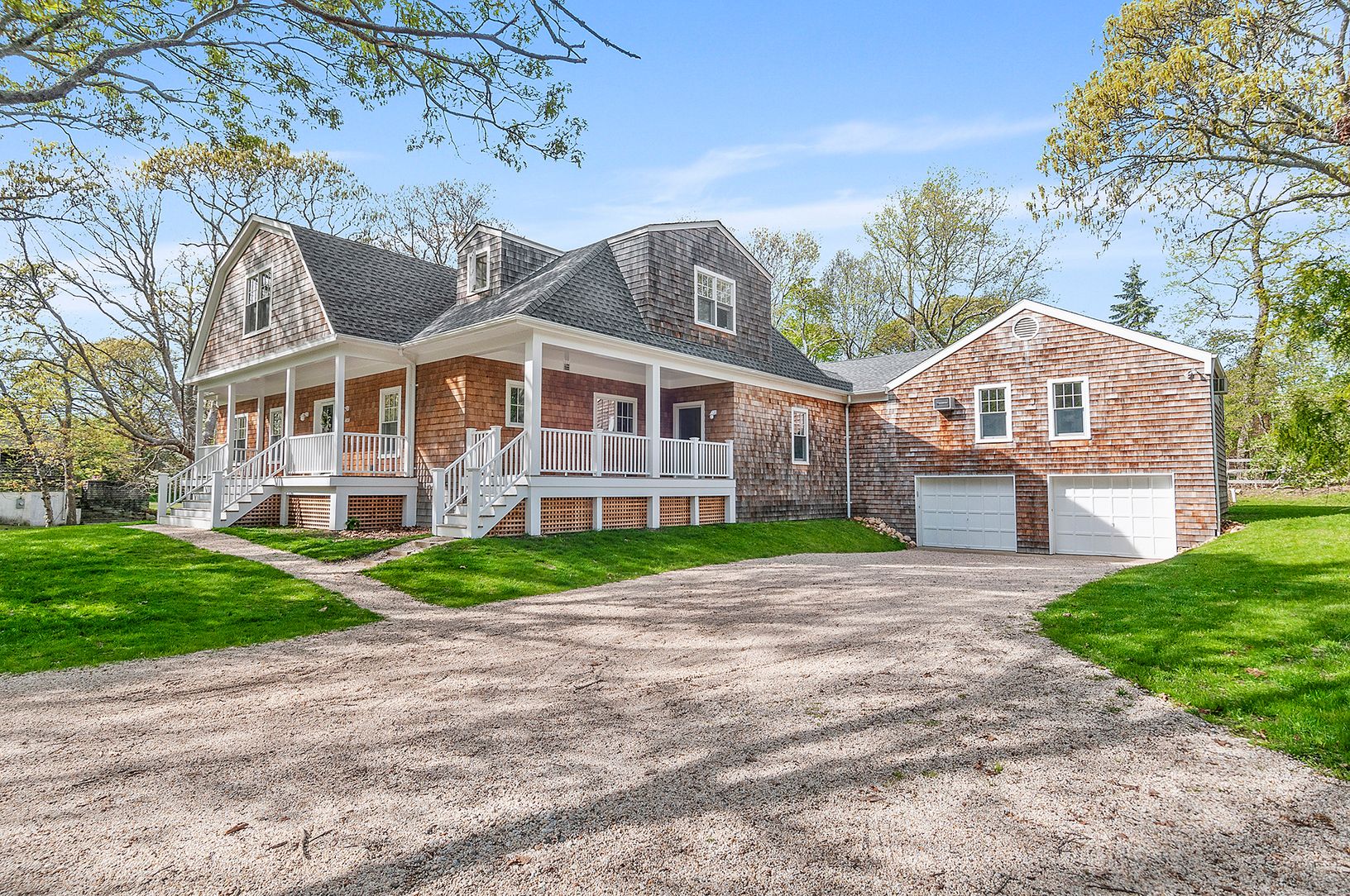 This newly built and renovated home sits on .75+/- acre at the end of Springs Fireplace Road just one house from Gardiner's bay, in the Artist's colony of Springs, East Hampton. 3,000 sf of gorgeous interior spaces featuring five spacious bedrooms, four and one half bathrooms, an additional den/sitting area, two wood burning fireplaces, hardwood flooring, and a 2-car garage. The stunning living room with fireplace offers French doors to the ba