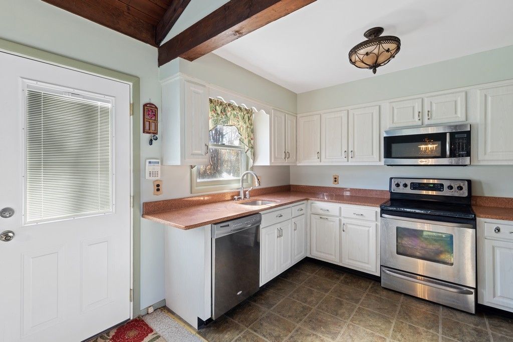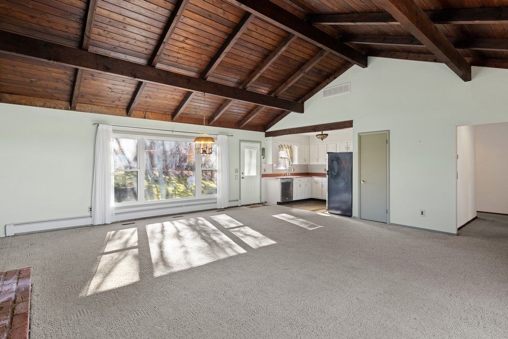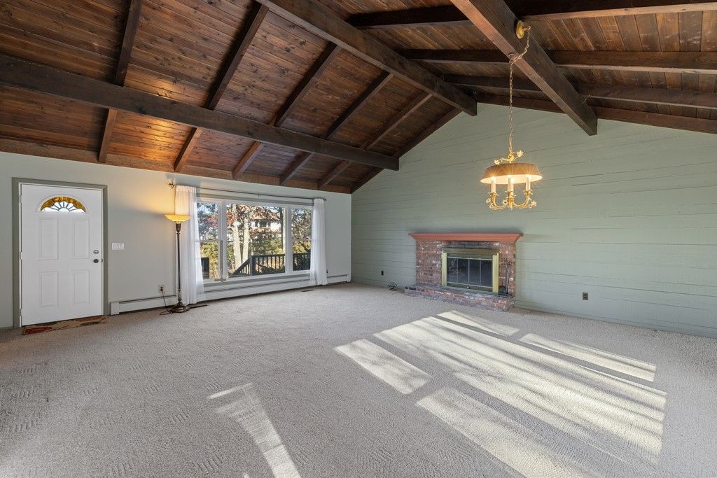 The current home features an open and inviting living room with vaulted ceiling, full size windows, plus a fireplace. There are three bedrooms, t